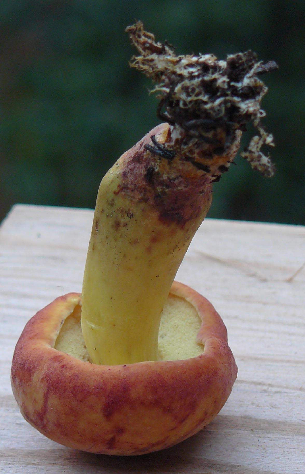 Si os dais cuenta, la especie es de porte muy pequeño para ser cualquiera de los que habeís propuesto, los colores te pueden llevar por esos derroteros pero el tamaño descarta esas especies, enhorabuena Sergi, a veces de la forma más "tonta" se encuentran especies no demasiado comunes,tengo pocas dudas con respecto a esta seta, Aureoboletus gentilis, antes llamado Boletus cramesinus.