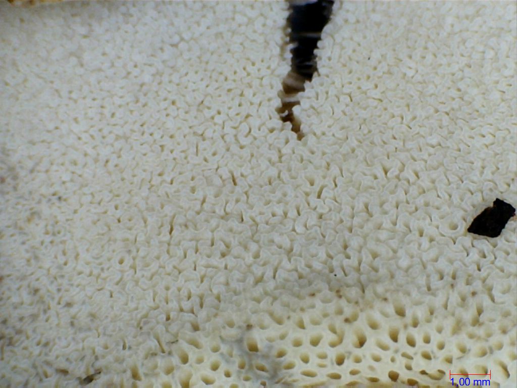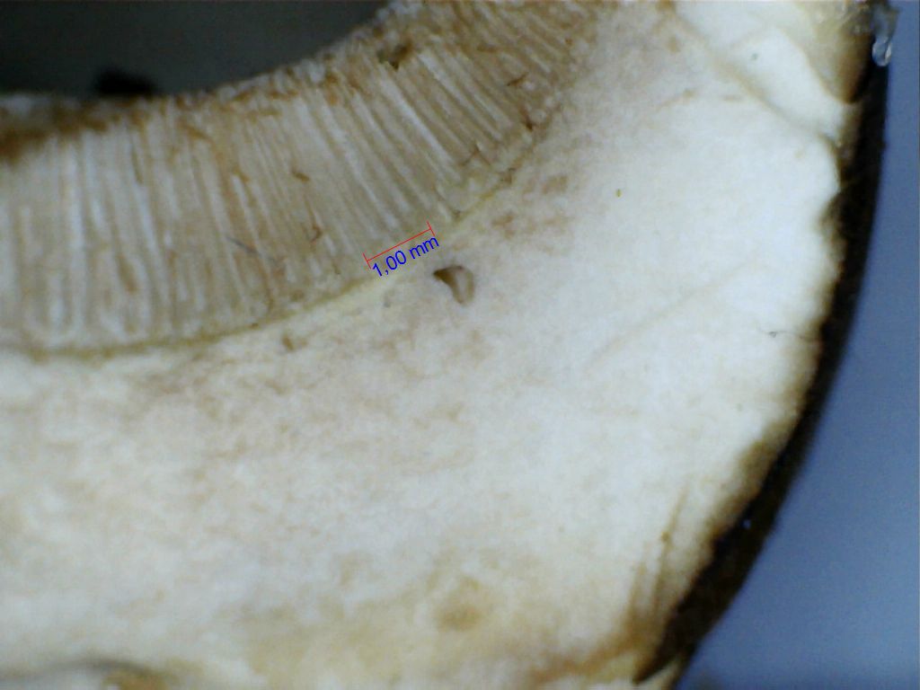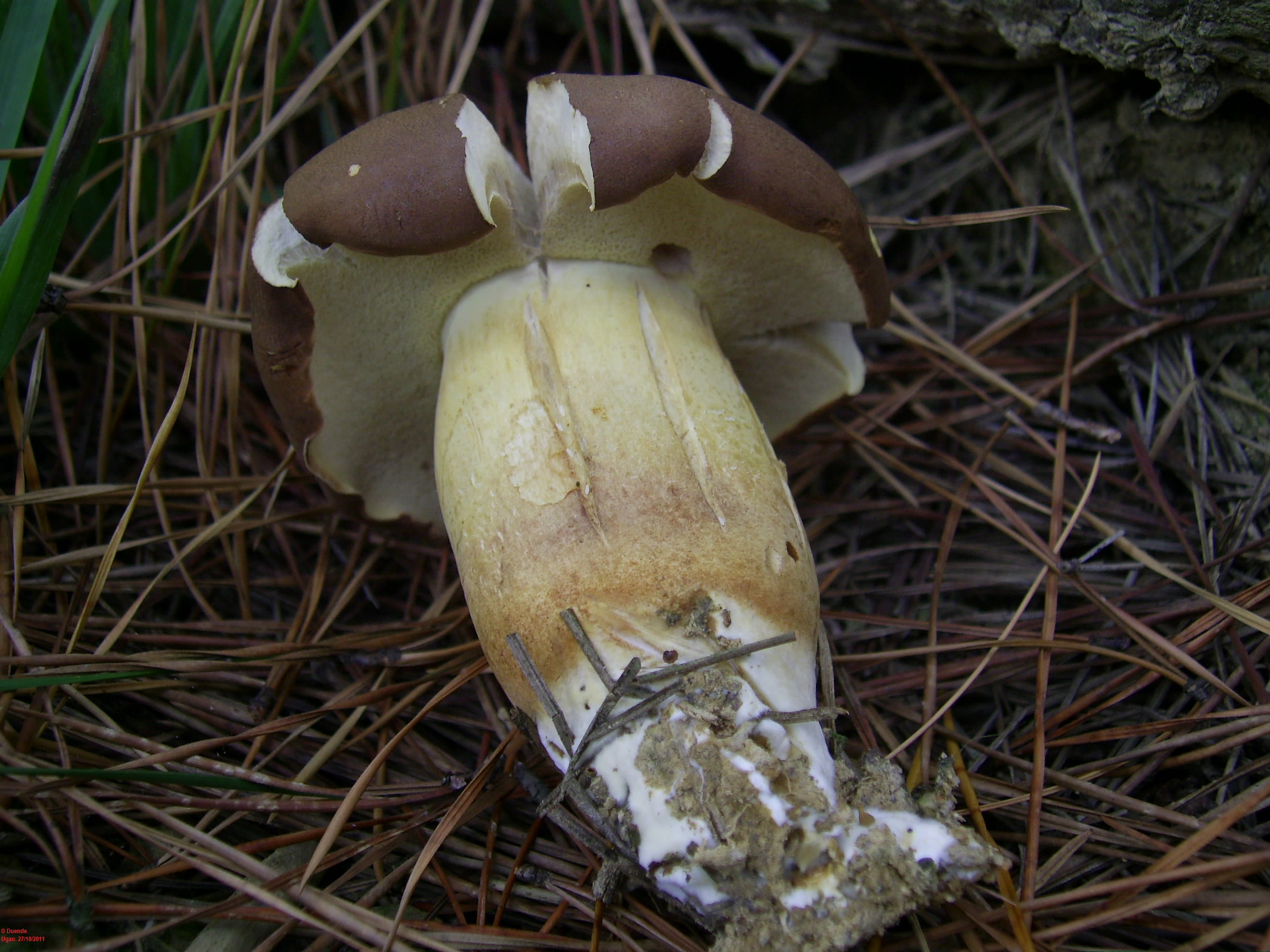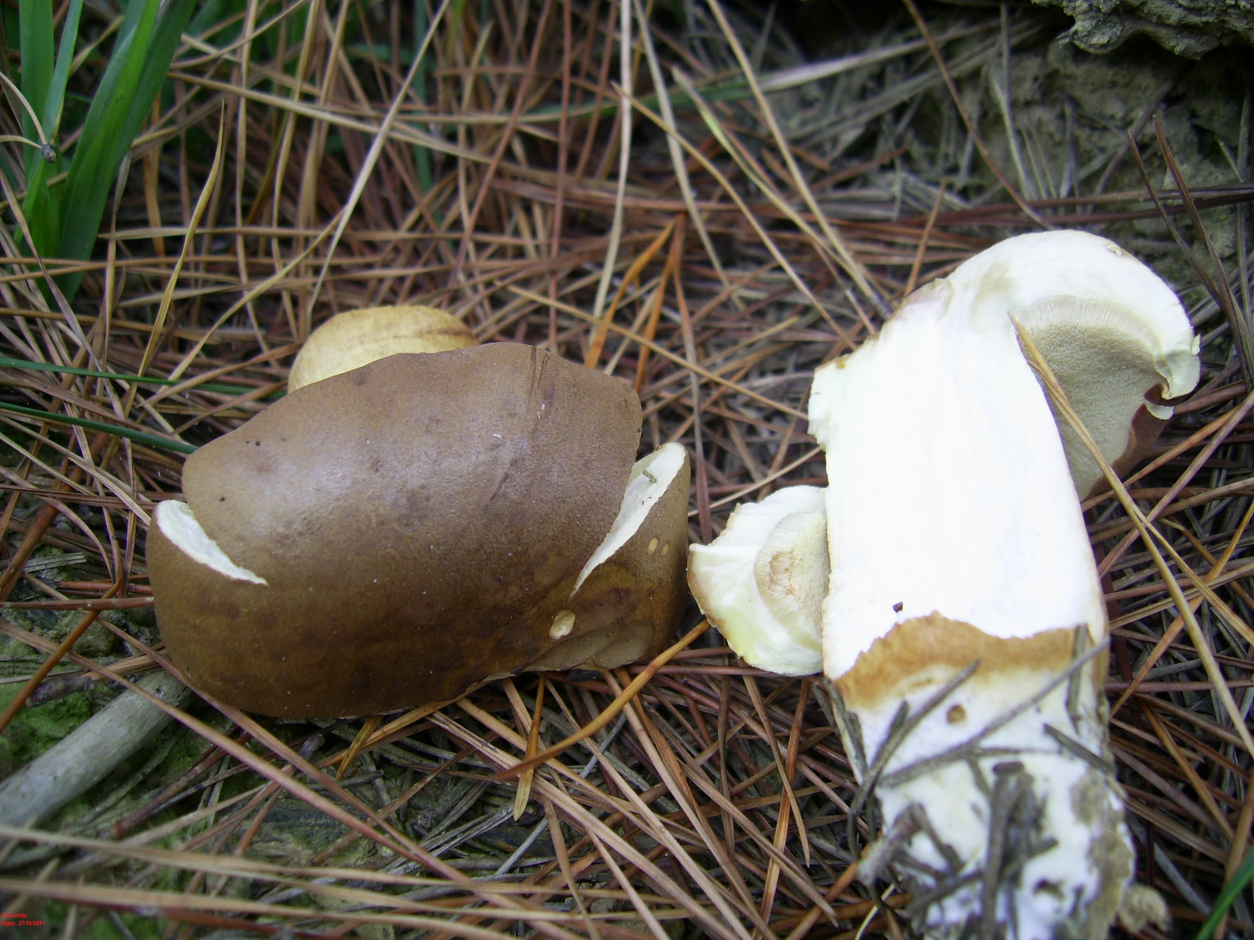 Las cuatro primeras fotos correponden a la misma seta. Tamaño pequeño, cerca de 7 cm. de sombrero y parecido de pie. Olor y sabor agradable, la cutícula no se desprende con facilidad, el pie muestra como pequeñas fibras y acaba de forma napiforme y dura. Pensé inicialmente en Boletus apendiculatus, pero la carne no se altera ni al corte ni a la presión, así como los poros, la carne es blanca con matices amarillos muy suaves.