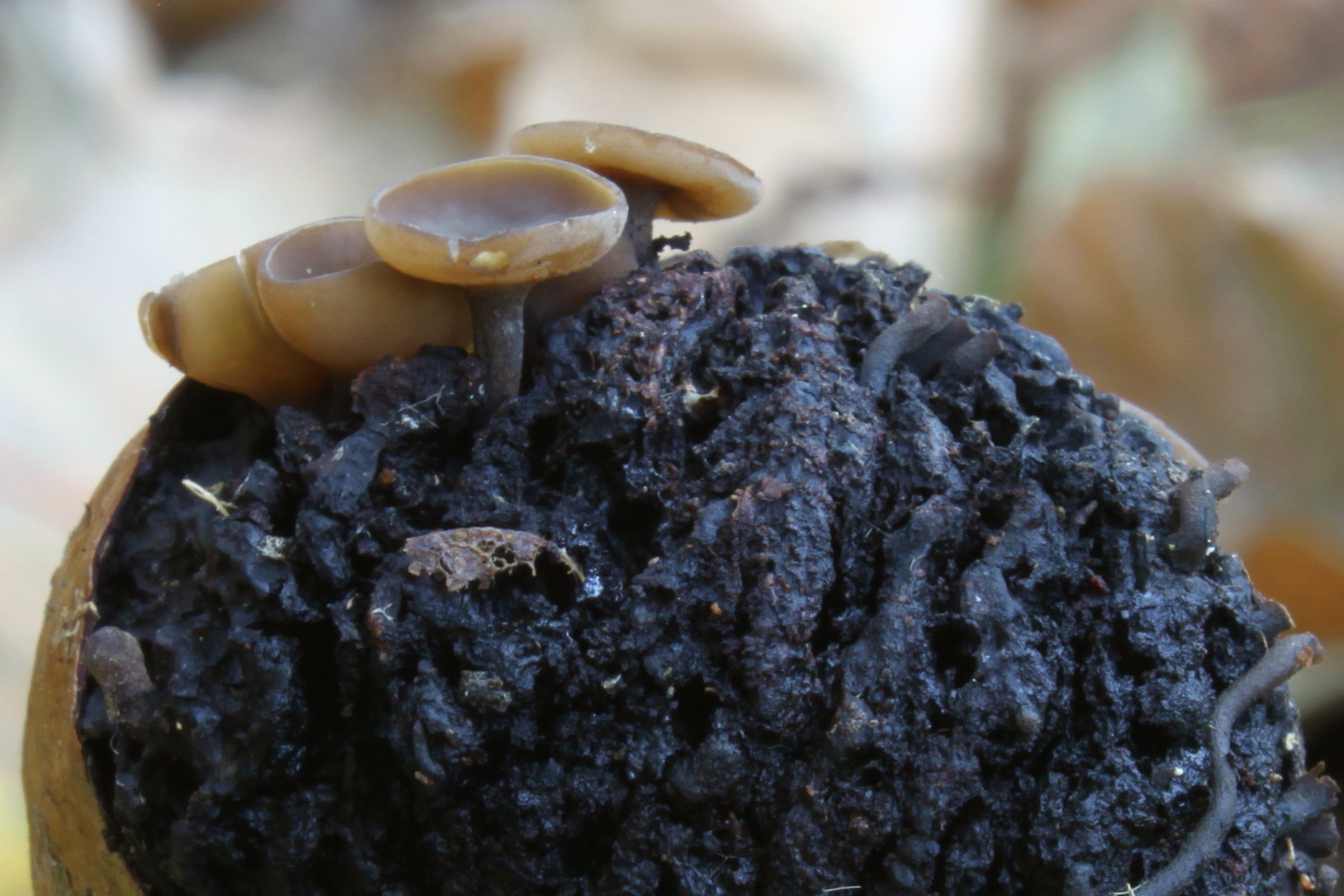 Carpóforo de color bistre, en forma de copa, con una marcada depresión en el centro, inicialmente cóncavo y posteriormente aplanado, de menos de 1 cm de diámetro. Himenio liso, de color ligeramente más claro que la cara superior del sombrero. Pie que sobresale del fruto que parasita y que se adentra unos milímetros más en él, de color pardo oscuro. Carne elástica y cerosa, más dura en el pie pero con idéntica elasticidad.