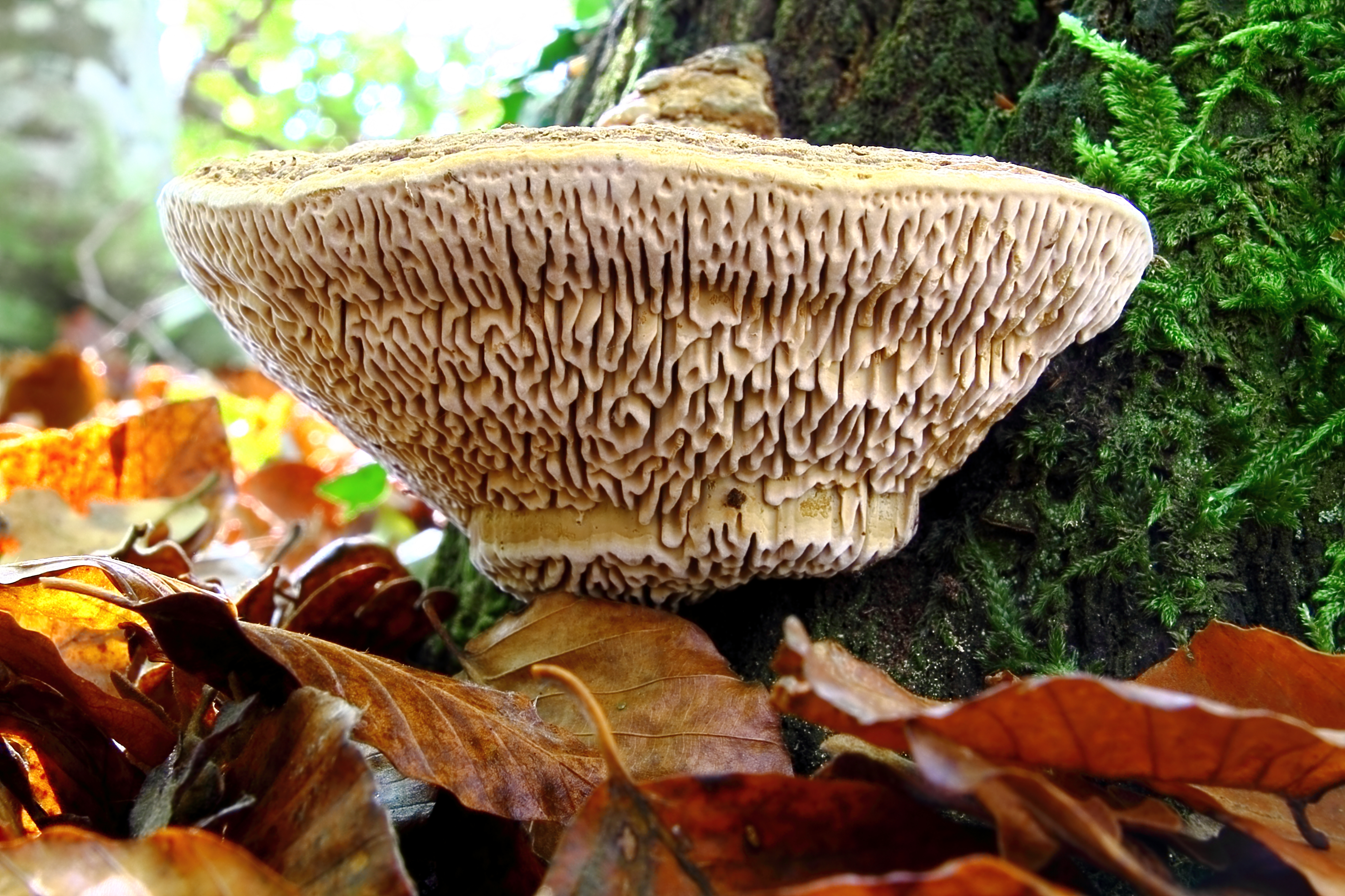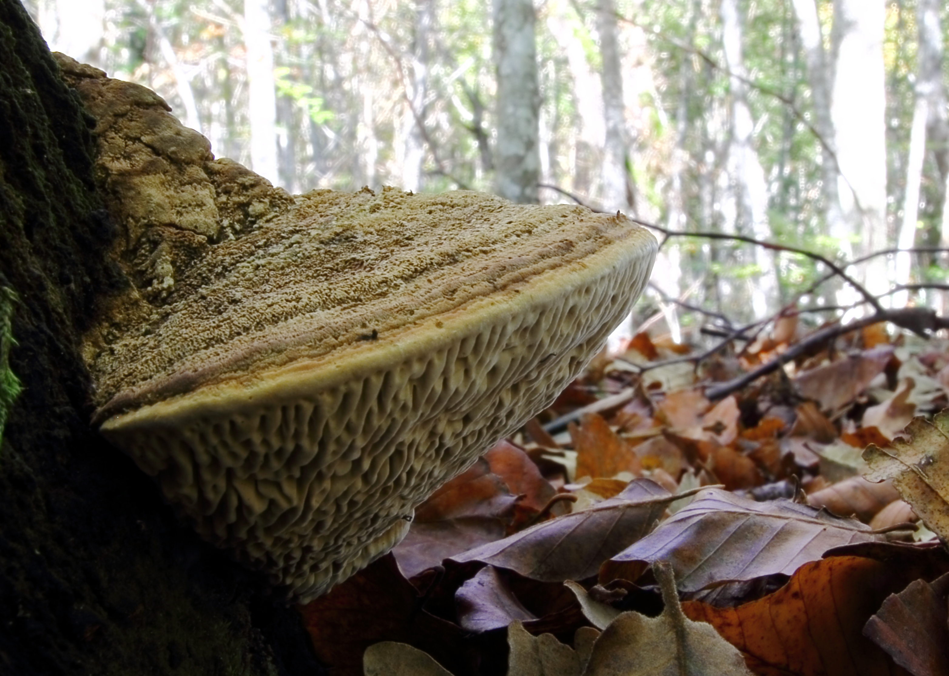 Himenoforo:formado por poros angulosos y de gran tamaño,irregulares y mezclados,1 o 2 por mm de color marron grisaceo