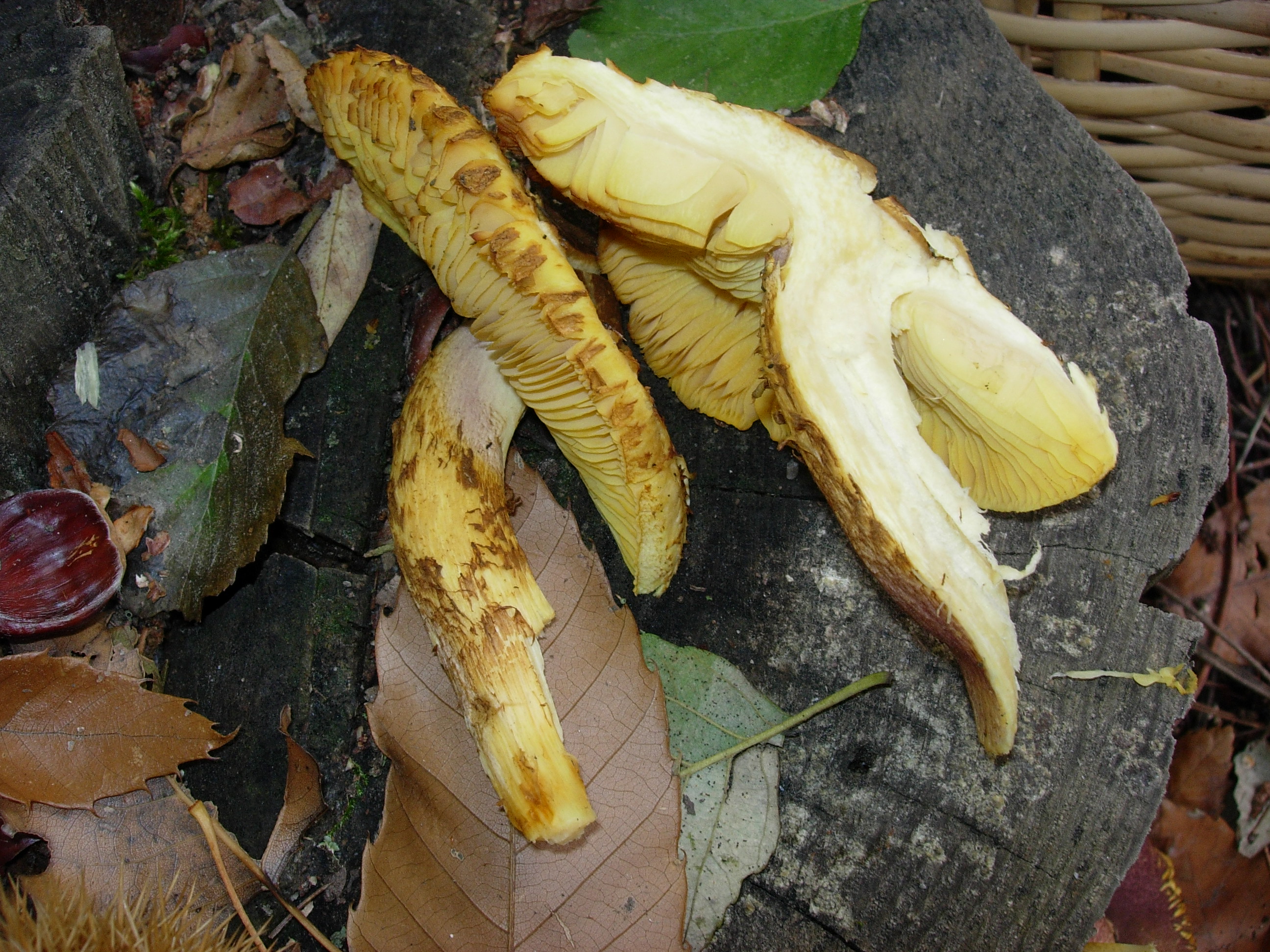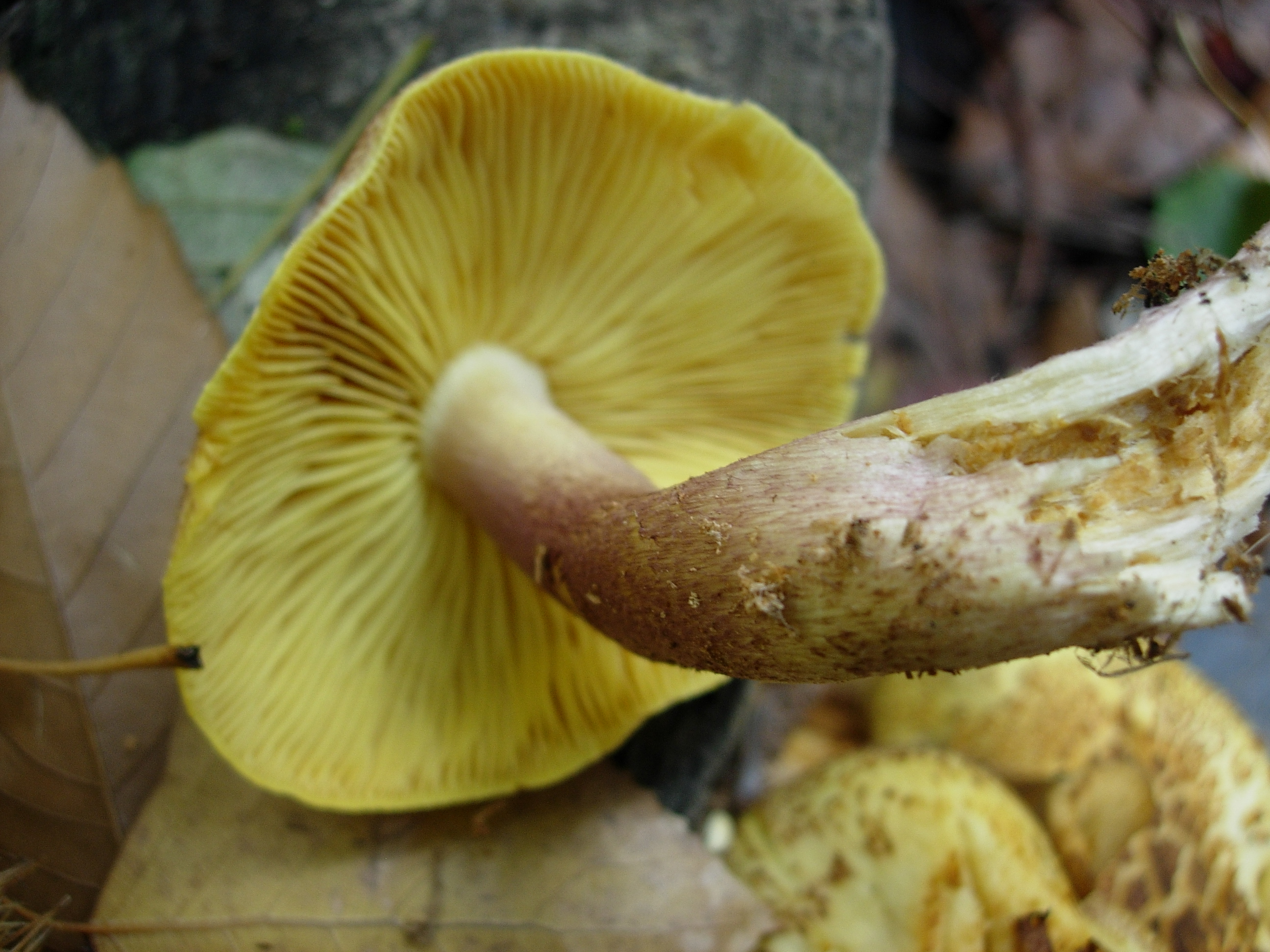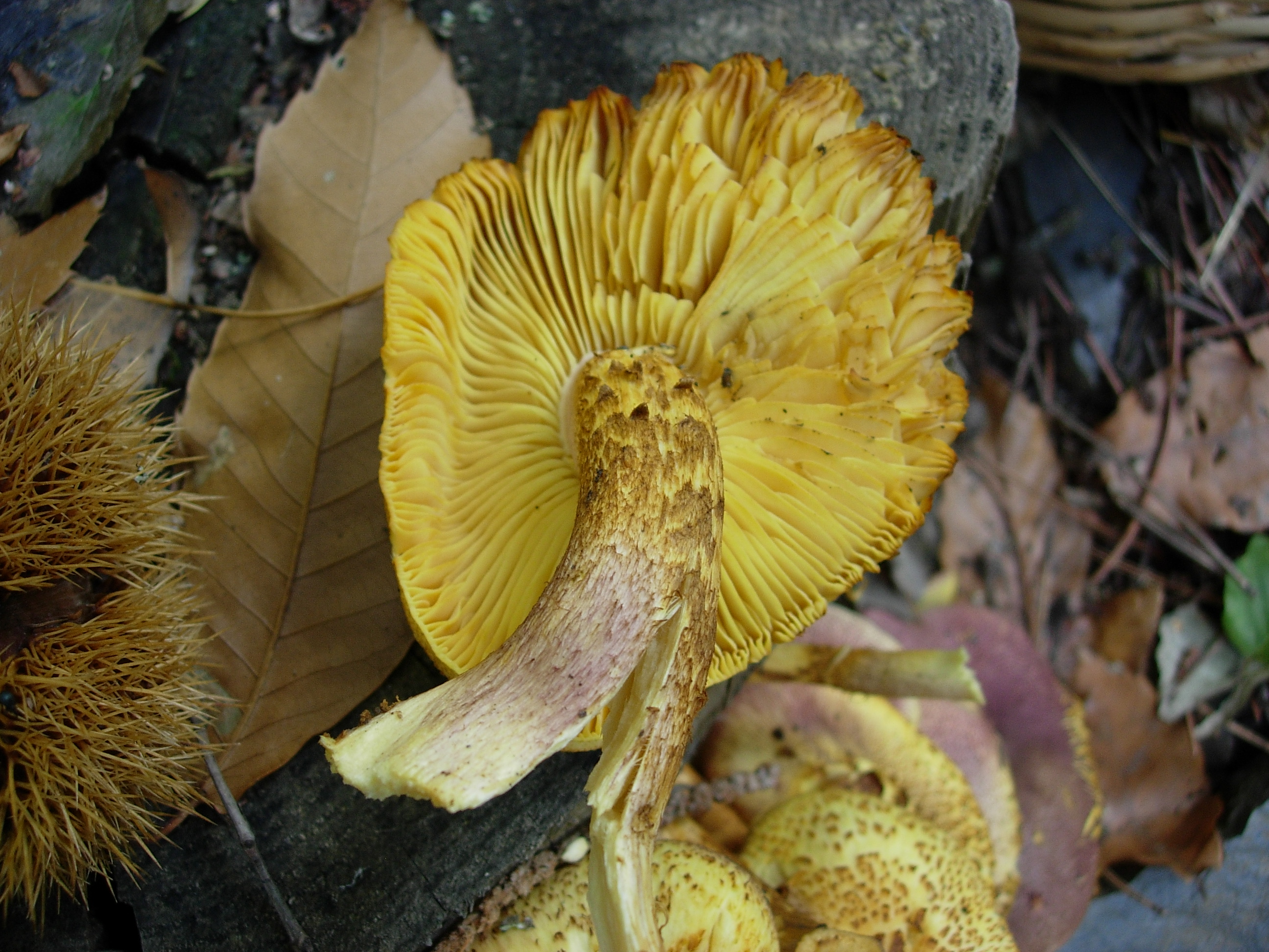 Bill: Debo decirte que, cuando vi las fotos del otro día, se me pasó por la cabeza, en particular por las láminas amarillas y el pie enrojecido. No me cuadraba la parte exterior del sombrero. No obstante, con las nuevas fotos que aportas, y en particular las tres últimas, estoy convencido de que es la que propones: Tricholomopsis rutilans.
