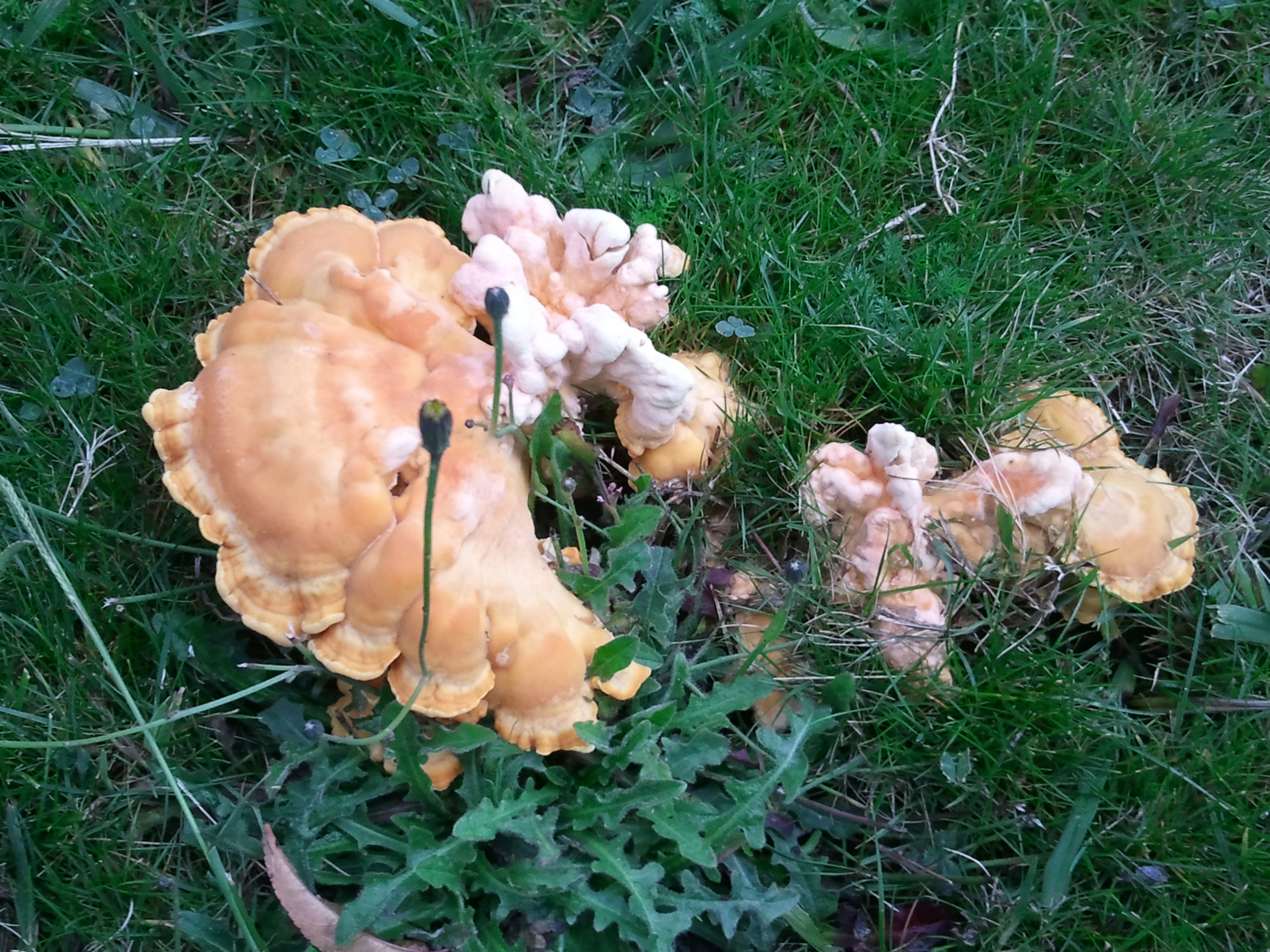 Estoy de acuerdo con Merche en lo relativo a la identificación. Tiene toda la pinta de ser Laetiporus sulphureus. Probablemente esté sobre los restos de un tocón enterrado o sobre una raíz.