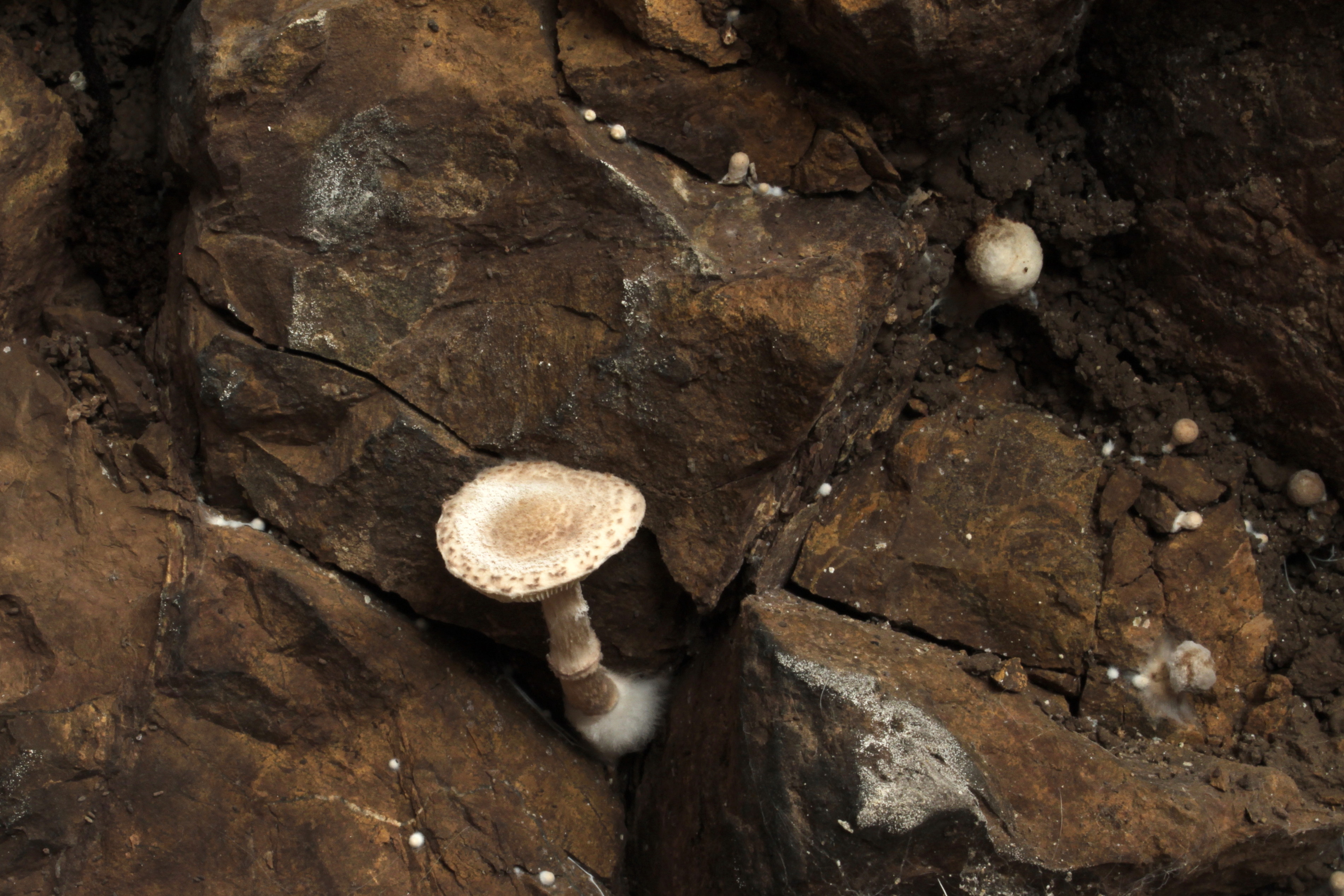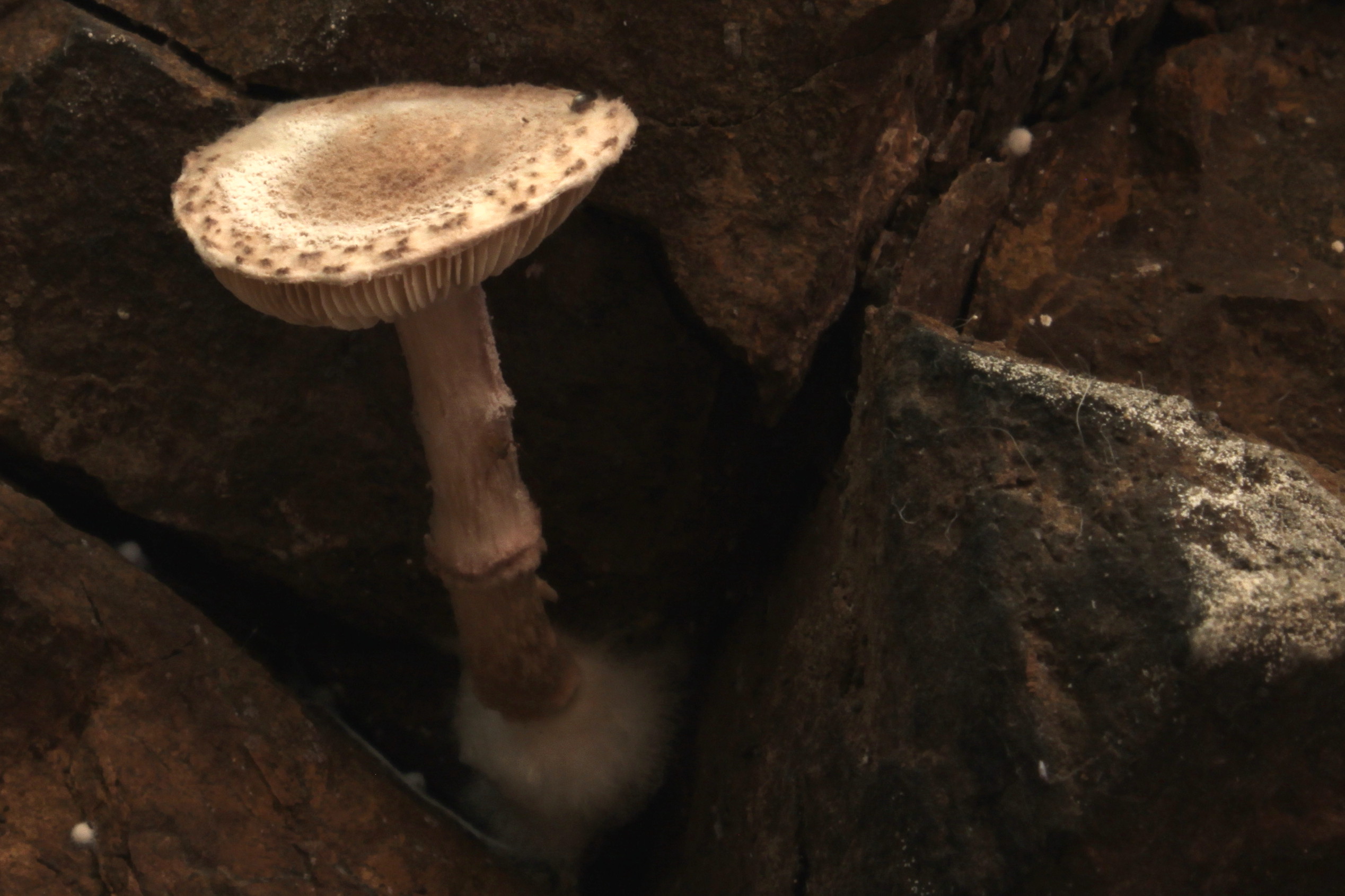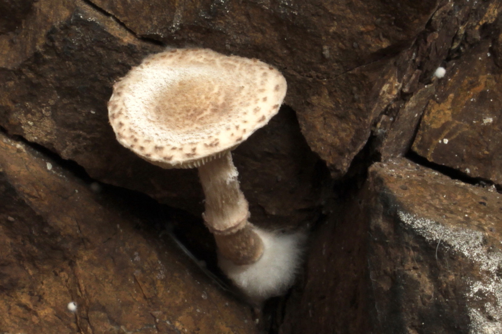 Seta de pequeñas dimensiones que brota en una mínima brecha abierta en una roca (concretamente en una marga dura), en una zona oscura.
