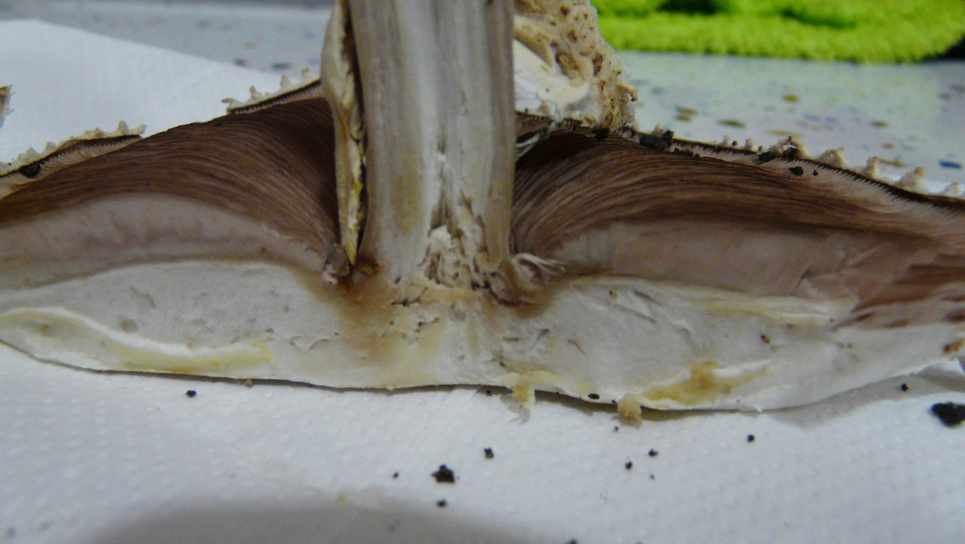 Apreciarás que, en el corte, la base del pie se vuelve de un color amarillo intenso. La base del pie es, en parte, de ese color. Si frotas el borde del sombrero verás como esa zona amarillea de ese mismo tono.