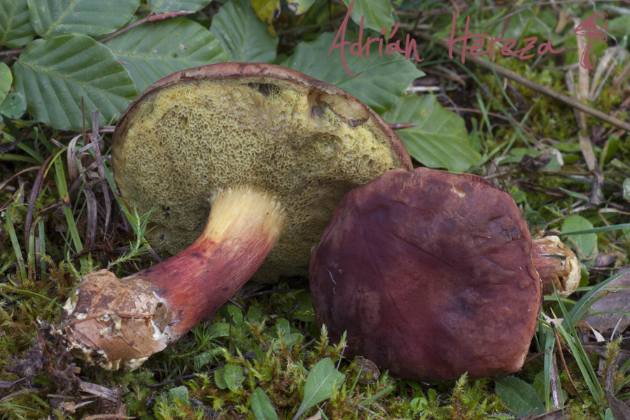 Por lo que sé, puede ser culquiera de las dos especies, muy próximas entre sí y difíciles de separar sin microscopía. Por lo que vi en Asturnatura, su aspecto y su hábitat (bajo hayas) inclinaría la balanza hacia Xerocomus pruinatus.