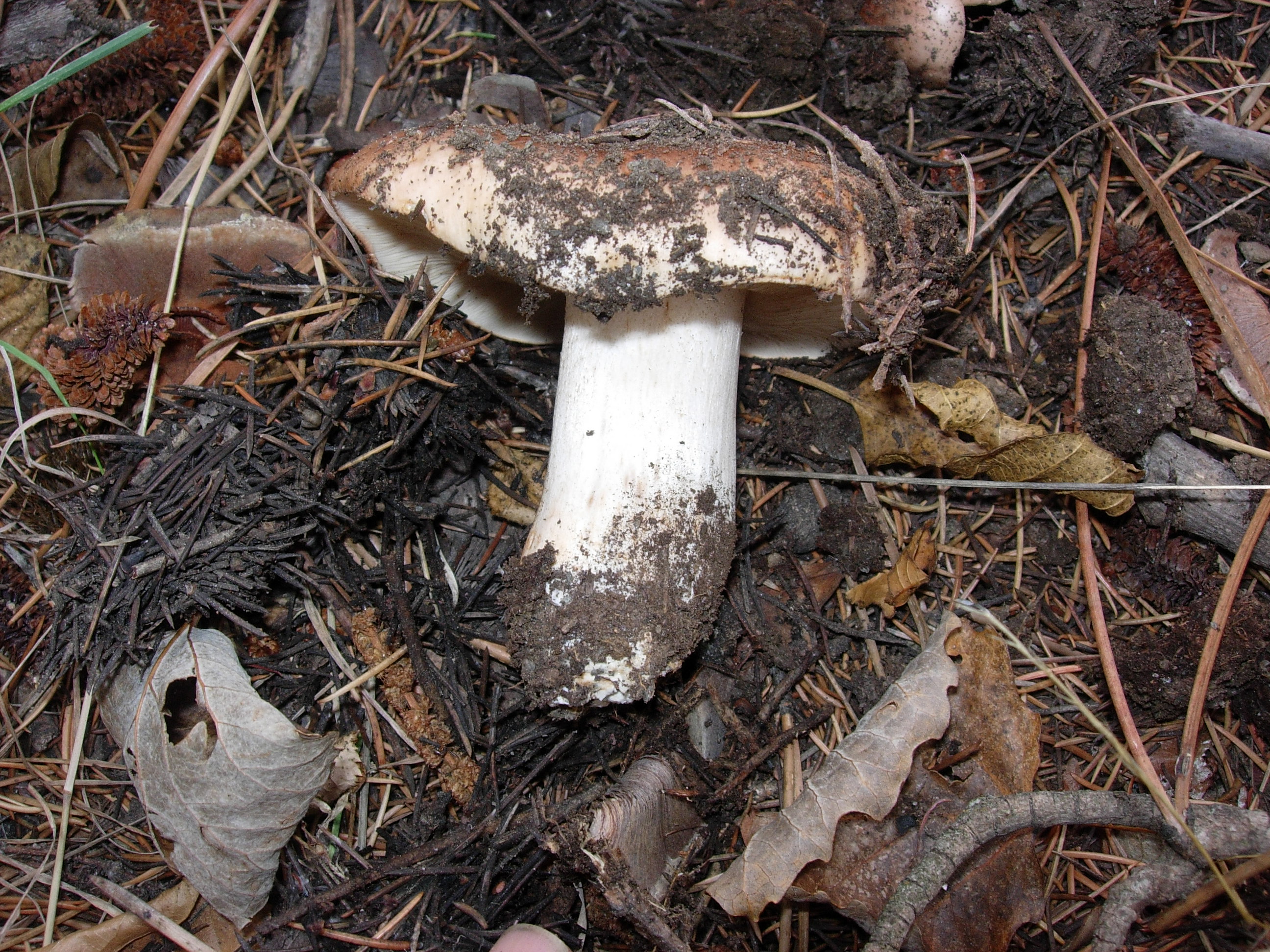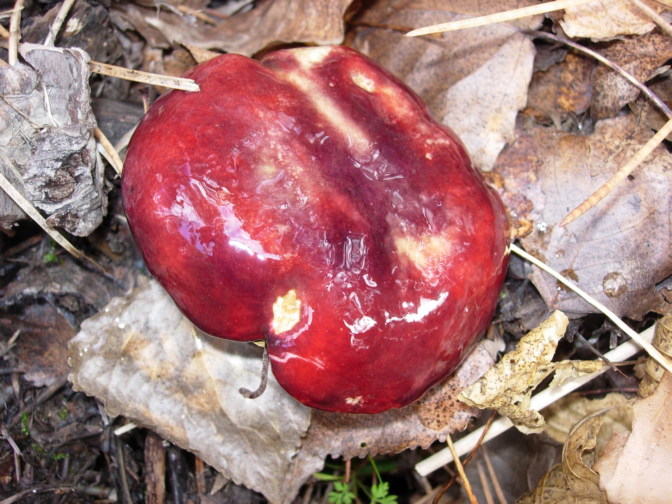 Una roja y brillante Rússula, tengo la duda entre emetica, lepida, rose y sanguinea, ya vere. El pie es blanco con tonos rojizos claros, pica, pero no mucho.