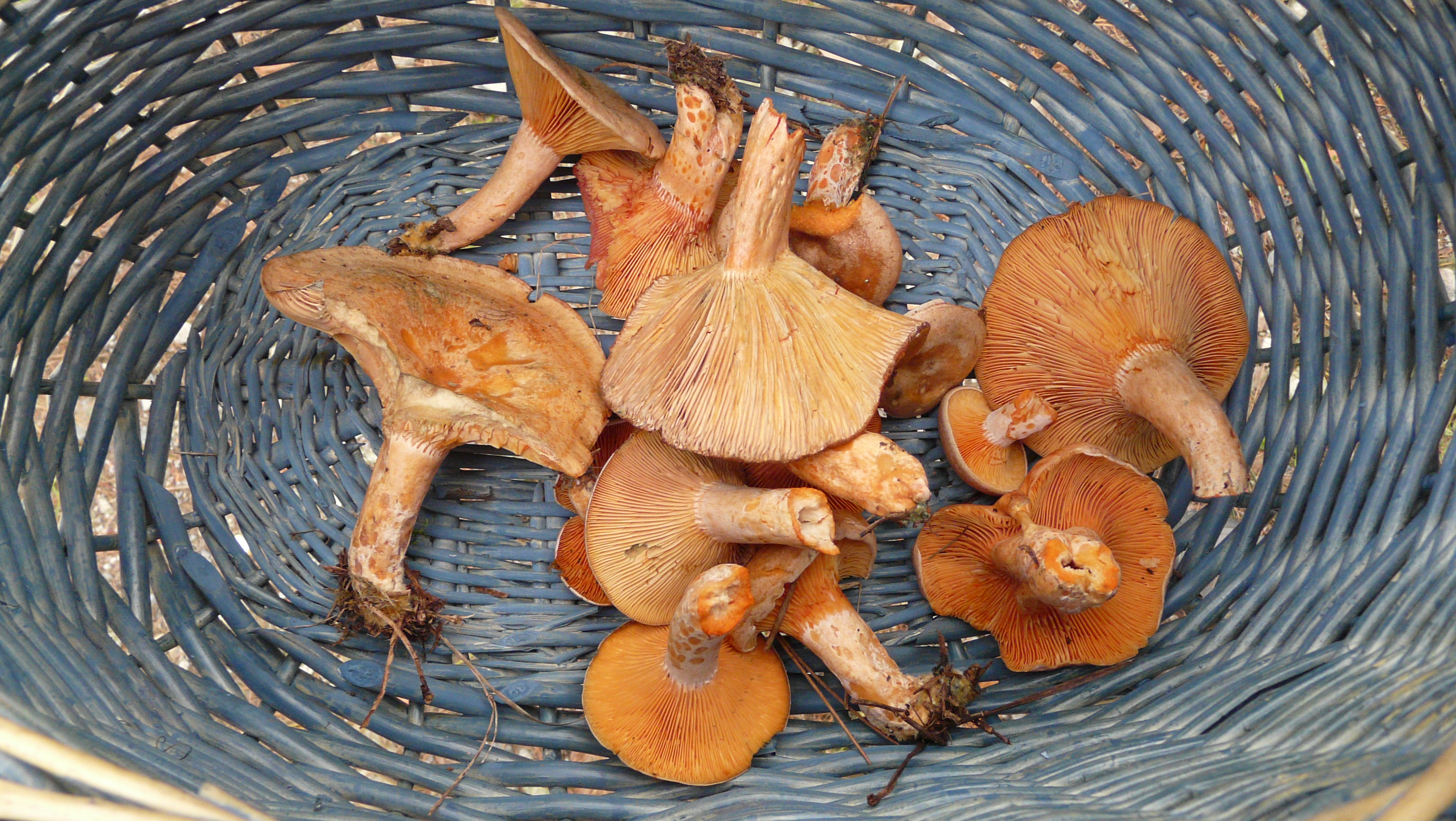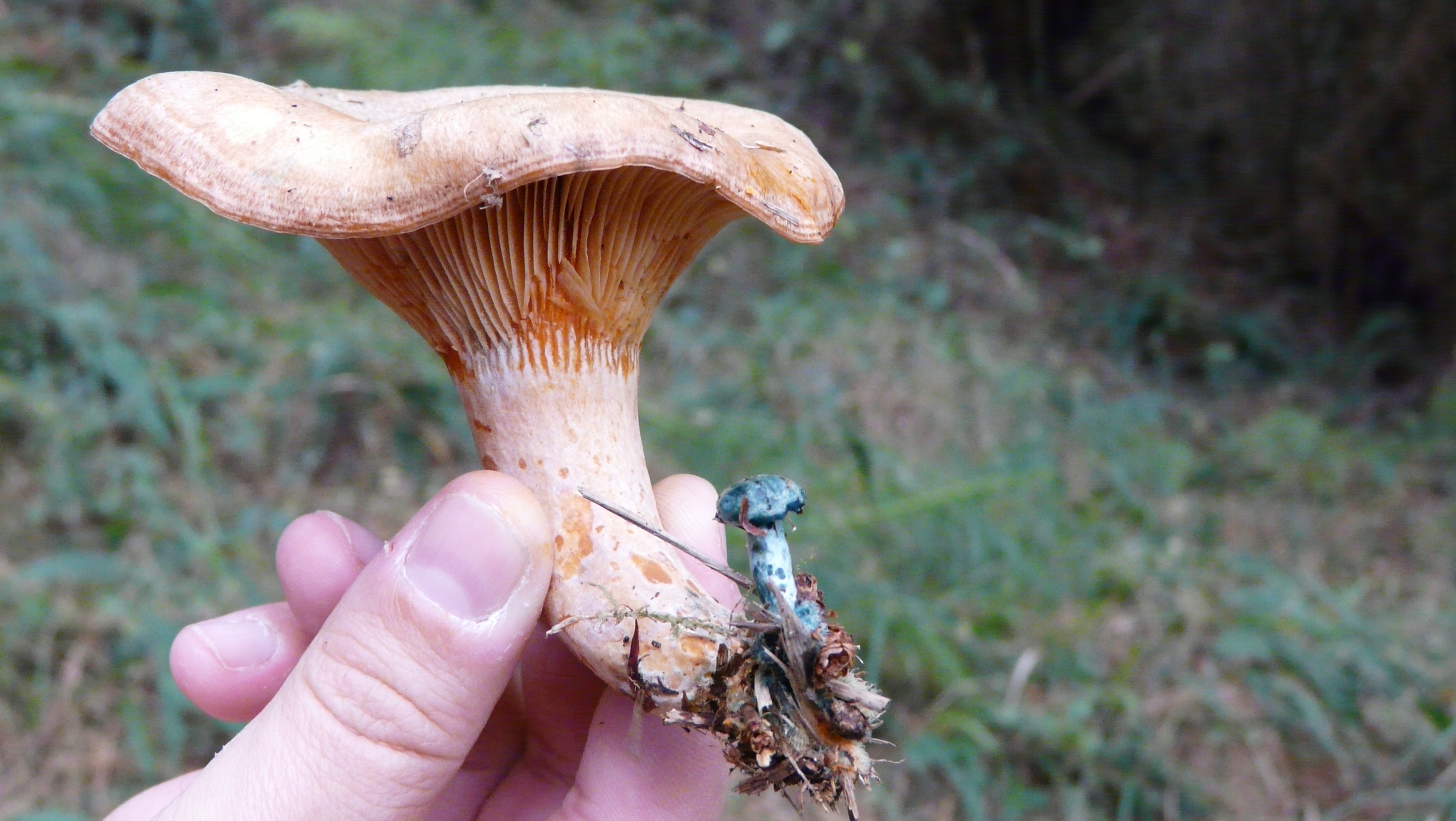 La seta azul al pie del níscalo me parece un Lactarius indigo, cosa un tanto sorprendente, tanto el verlas juntas como el ver esta especie. ¿En qué zona las has cogido? Es originaria de América y sé que está documentada en el sur de Francia, pero no tengo claro que esté documentada en España.