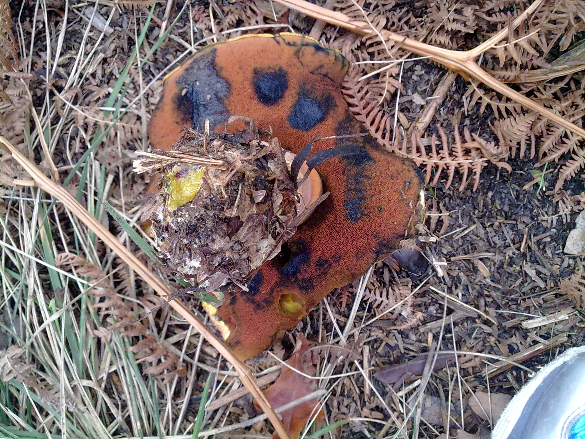 Aunque no tengo experiencia alguna despues de mirarla diría que es un hankagorri verdad?? tubos amarillos, poros rojos, esas manchas que parecen azul oscuro en el himenio, y en una de las fotos parece que el final del pie es de color amarillo...