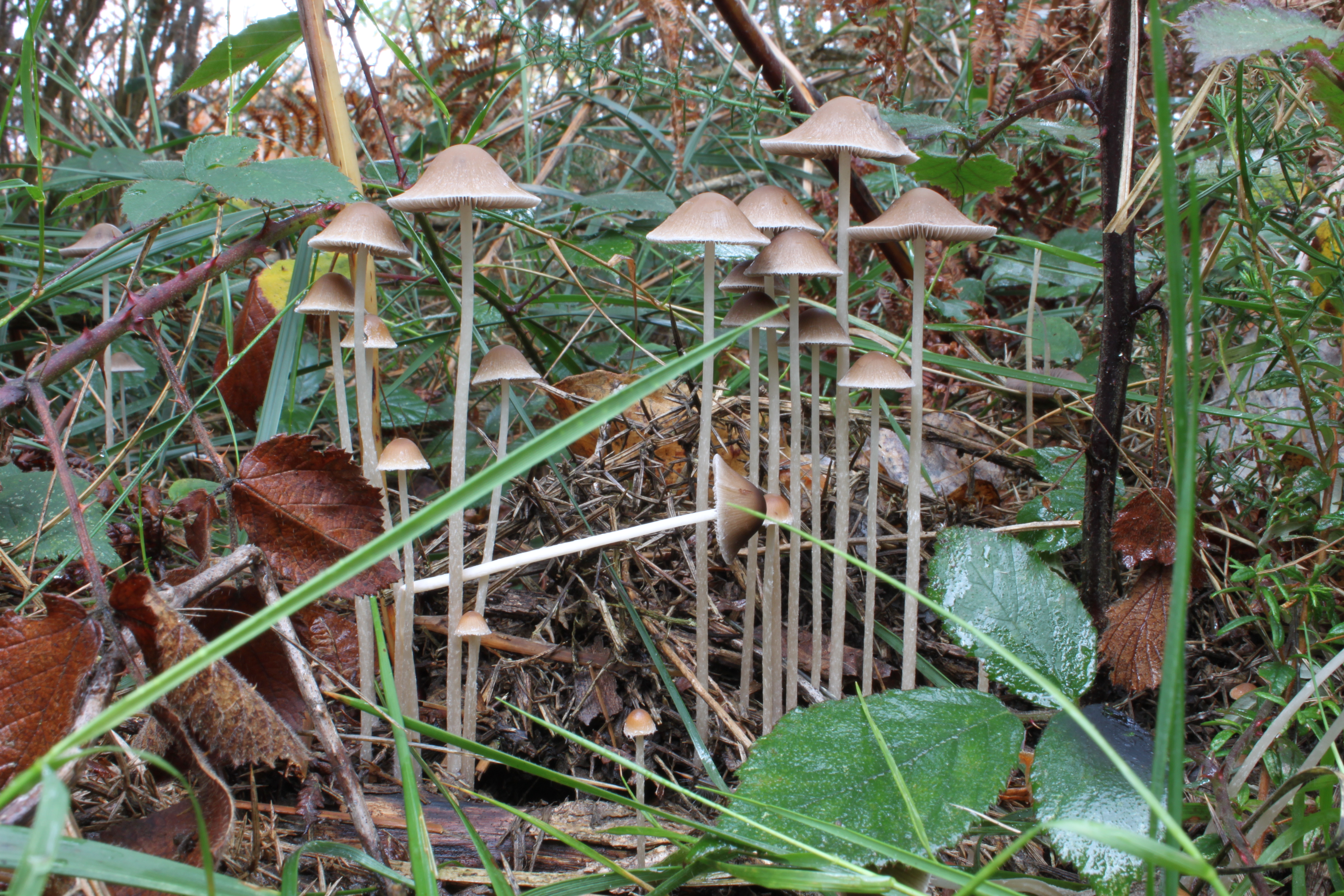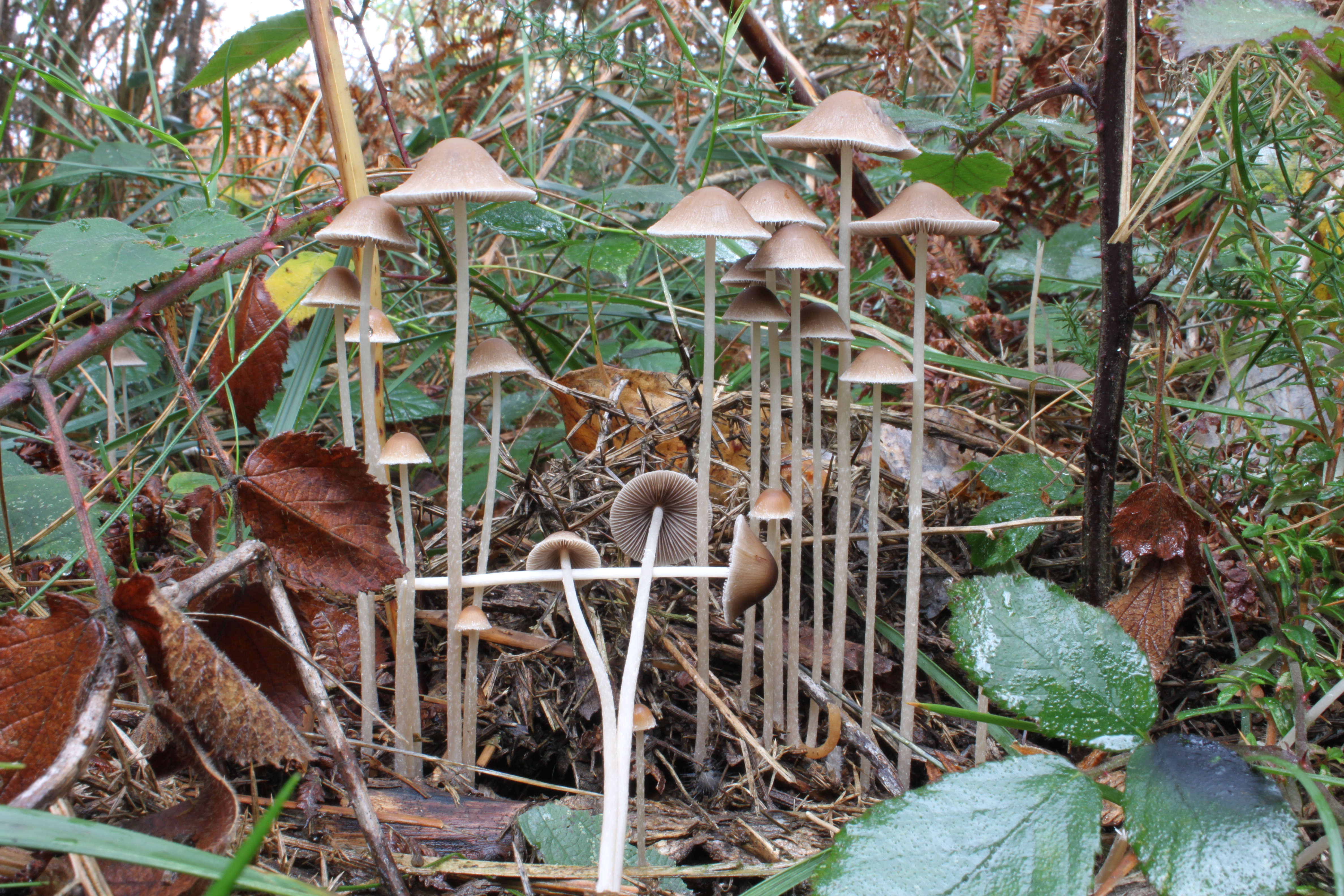 Entre matorral. Ejemplares muy juntos. Sombrero que no alcanza los 3 cm, de forma convexa o acampanulada, de color pardo, con el margen más claro, fibrilado por transparencia.