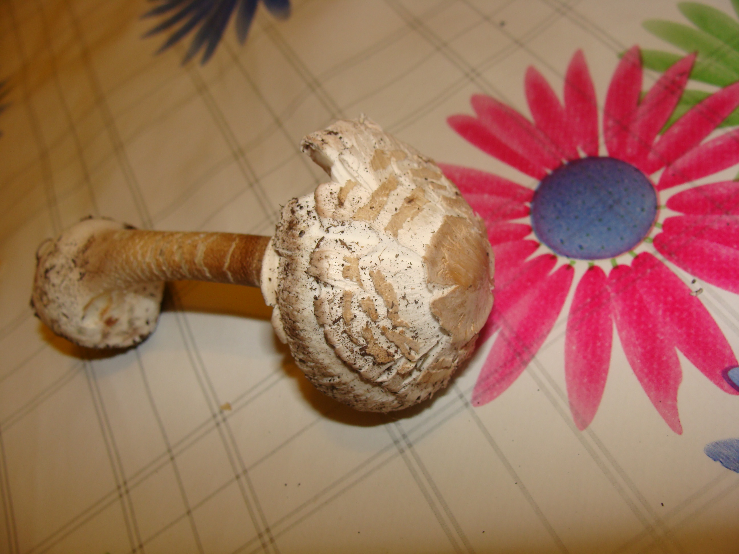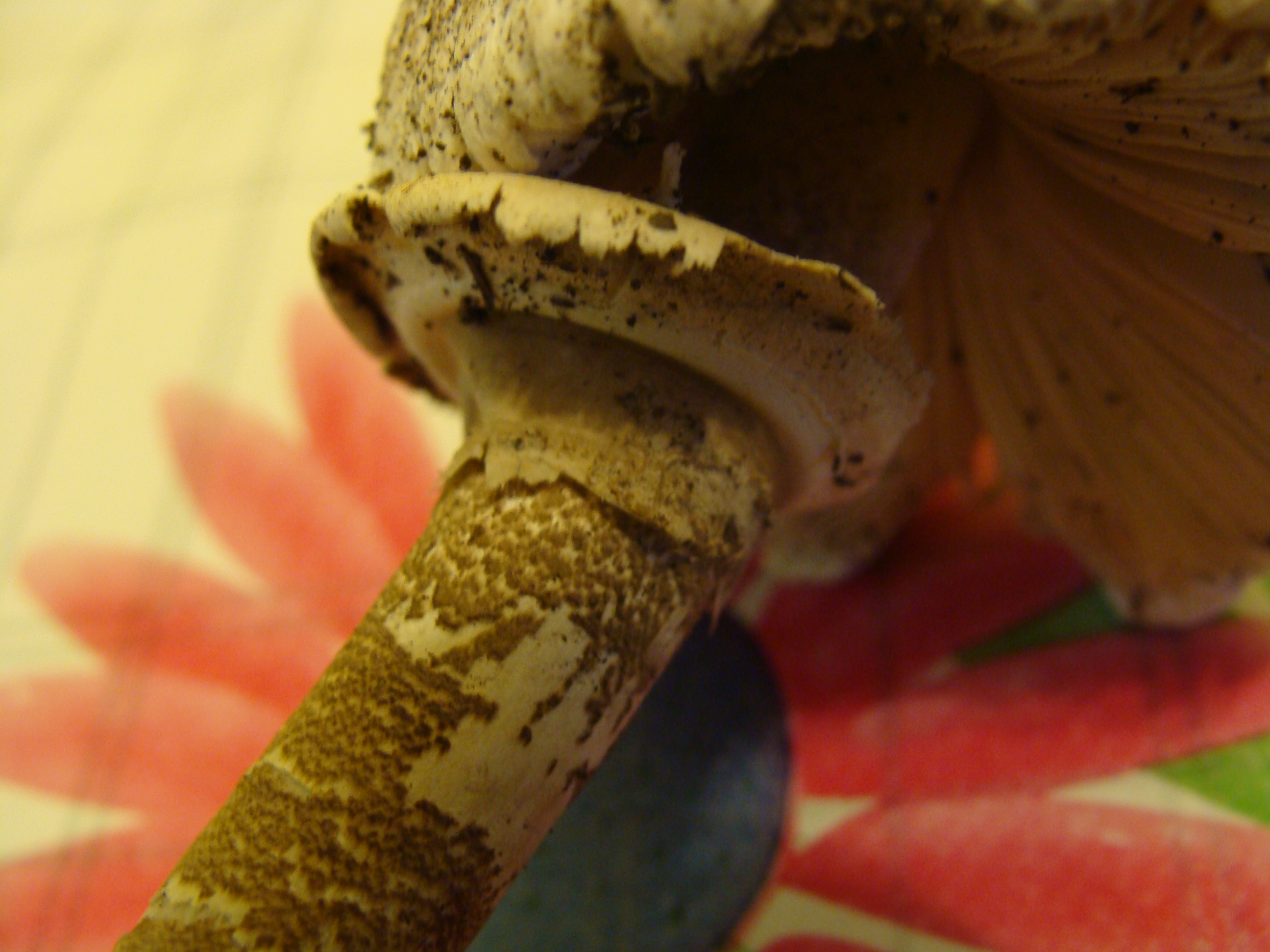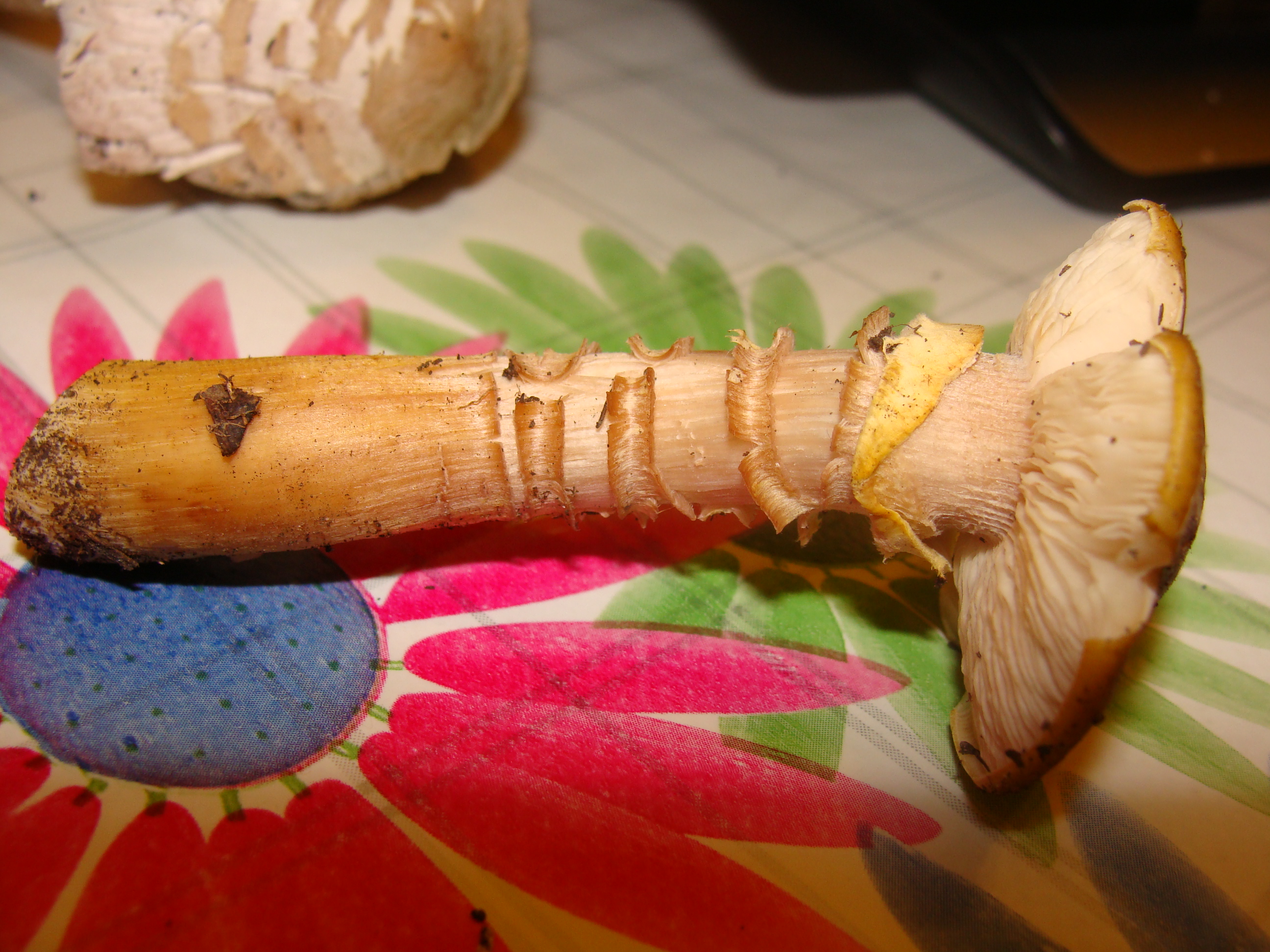 El sombrero con las escamas tipicas radiales, marrones grisaceas facilmente separables de la cutícula, laminas libres formando un círculo alrededor del pie sin tocarlo, anillo doble en la parte superior color blanco y la inferior pegada al pie mas oscuro, crema.