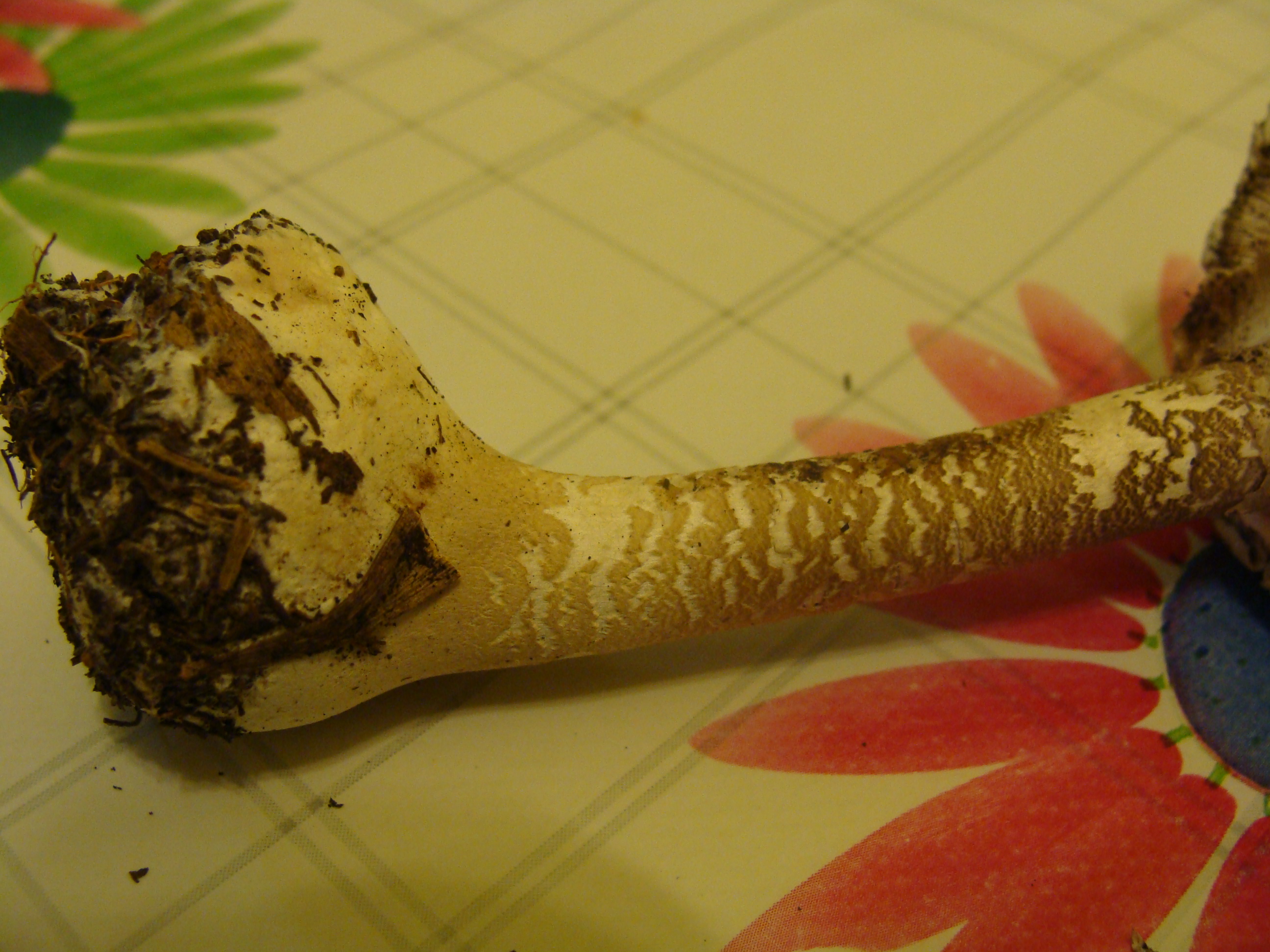 el pié es hueco y con textura aspera, lineas zigzagueantes alrededor del mismo y de color marron-grisaceo y un gran bulbo en su base.