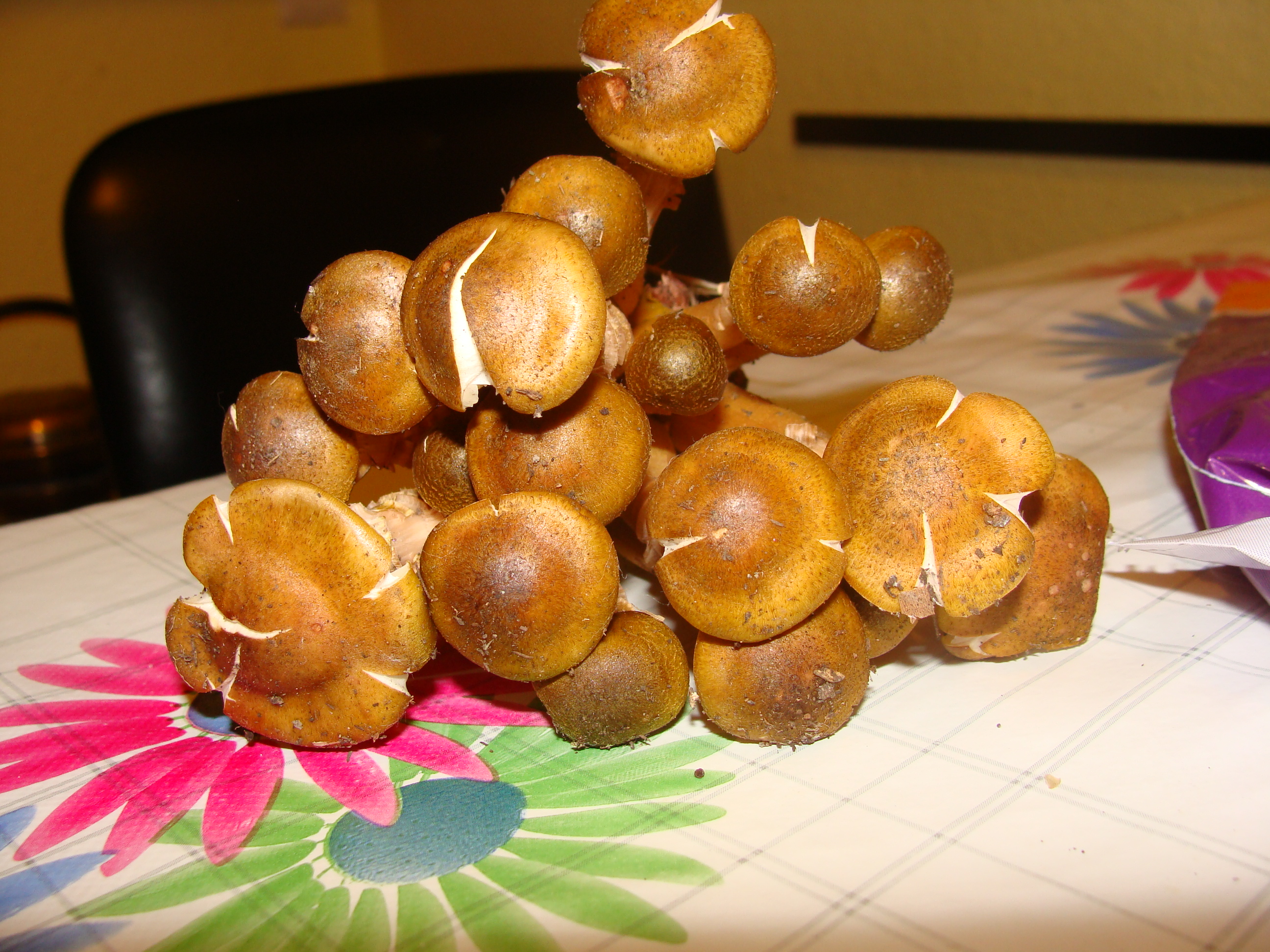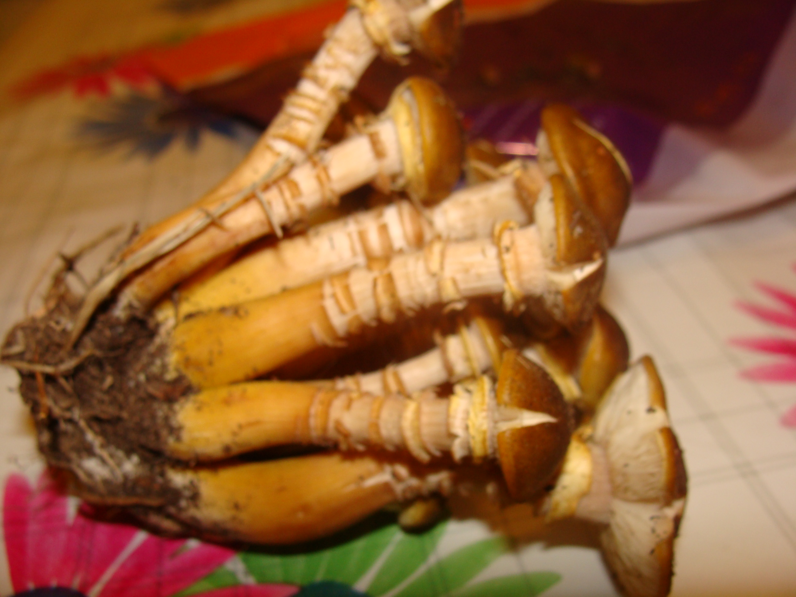 Estas fasciculares, en principio no tengo ni idea, aunque tampoco tengo experiencia; pense que pudiera ser una lyophyllum decastes, porque el otro día me encontre unas de esa especie(creo) y por la forma del sombrero , pero luego viendo el pie con esas especies de anillos.... en realidad parece que solo tiene un anillo en su parte superior y que la cuticula del pie se hubiera resquebrajado, como si hubiera crecido más de la cuenta.las laminas son adnatas, ligeramente decurrentes y quizas algo escotadas, segun la foto del corte, aunque no estoy seguro