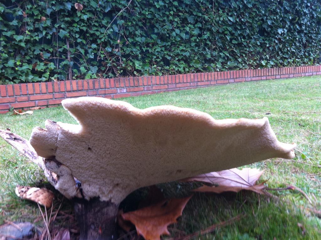 Hola a todos. Me puede alguien ayudar con esta especie??Podria ser alguna especie de Hydnum?? Ha salido en la base de un tronco cortado de un chopo y mide unos 50 cm.