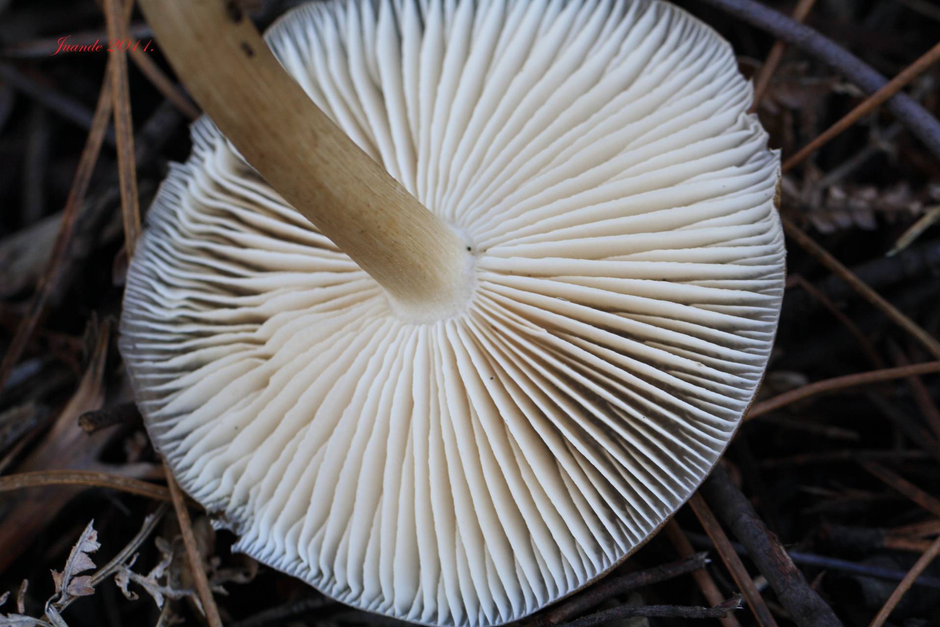Foto de las laminas.Su olor es suave y fungico, muy parecido al olor del Pleurotus Ostreatus.Incluso su sabor, me recordaba a este.