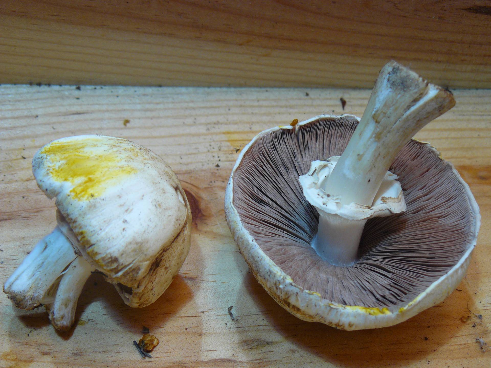 Sergio: Es xanthoderma. Aunque no se vean algunas características, el amarilleamiento súbito del sombrero, es característico. Los arvensis amarillean muy lentamente y nunca con ese tono amarillo bromo. El amarilleamiento del A. arvensis se percibe muchos minutos después, de manera tenue. El olor a anís es muy fuerte, inconfundible con un olor neutro que, a veces, presenta el xanthoderma.