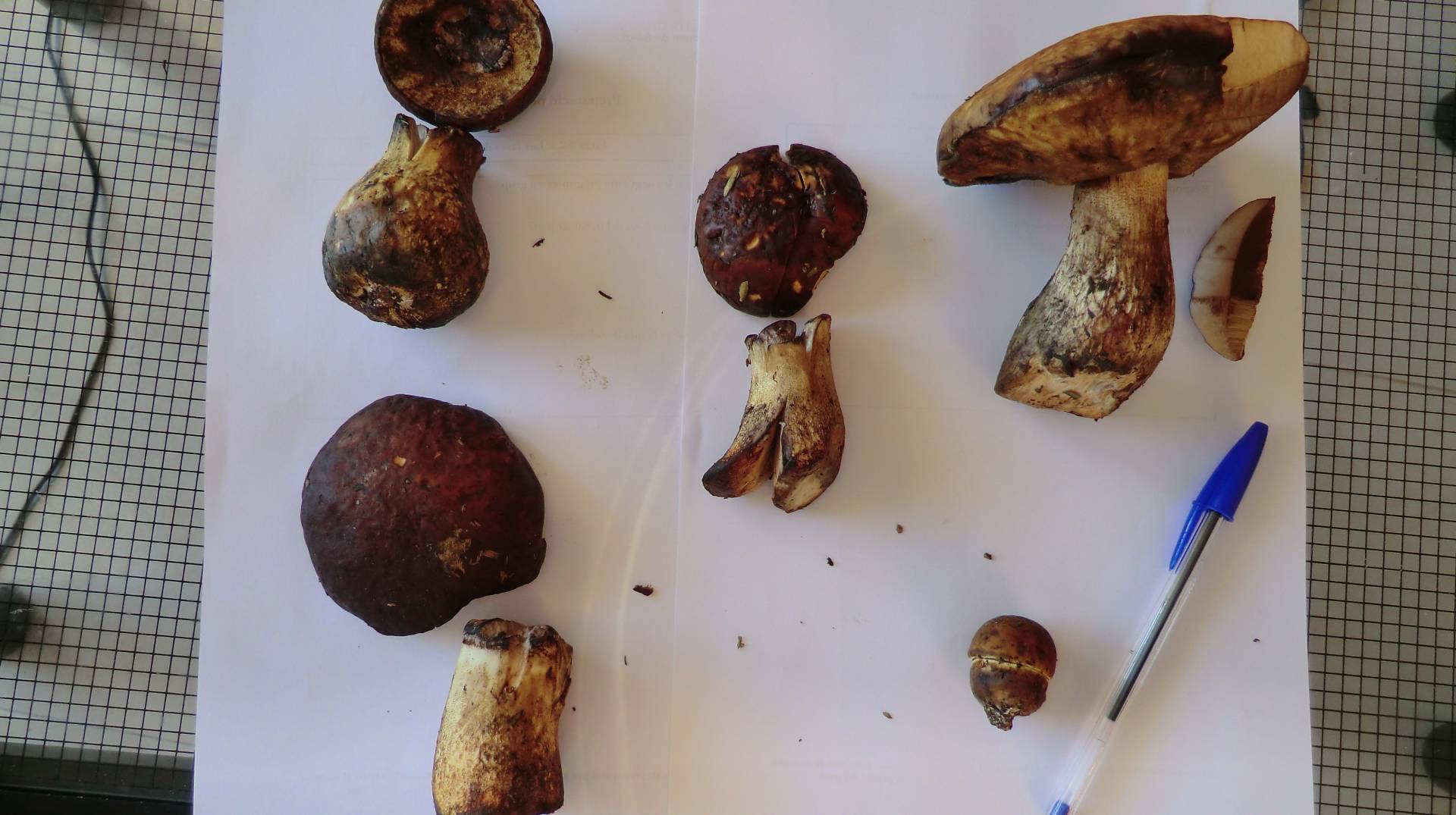 Al final he pensado que mejor envio las fotos aunque las setas no estén en buen estado. Todos tienen una pequeña mancha roja en el pie cerca de la base. En una foto se aprecia como vira a rosado rojizo al corte y como está gris o negro especialmente en donde se han separado los pies del sombrero, que al principio era totalmente rojo. El más pequeño, el sombrero era amarillo canario cuando lo encontré.