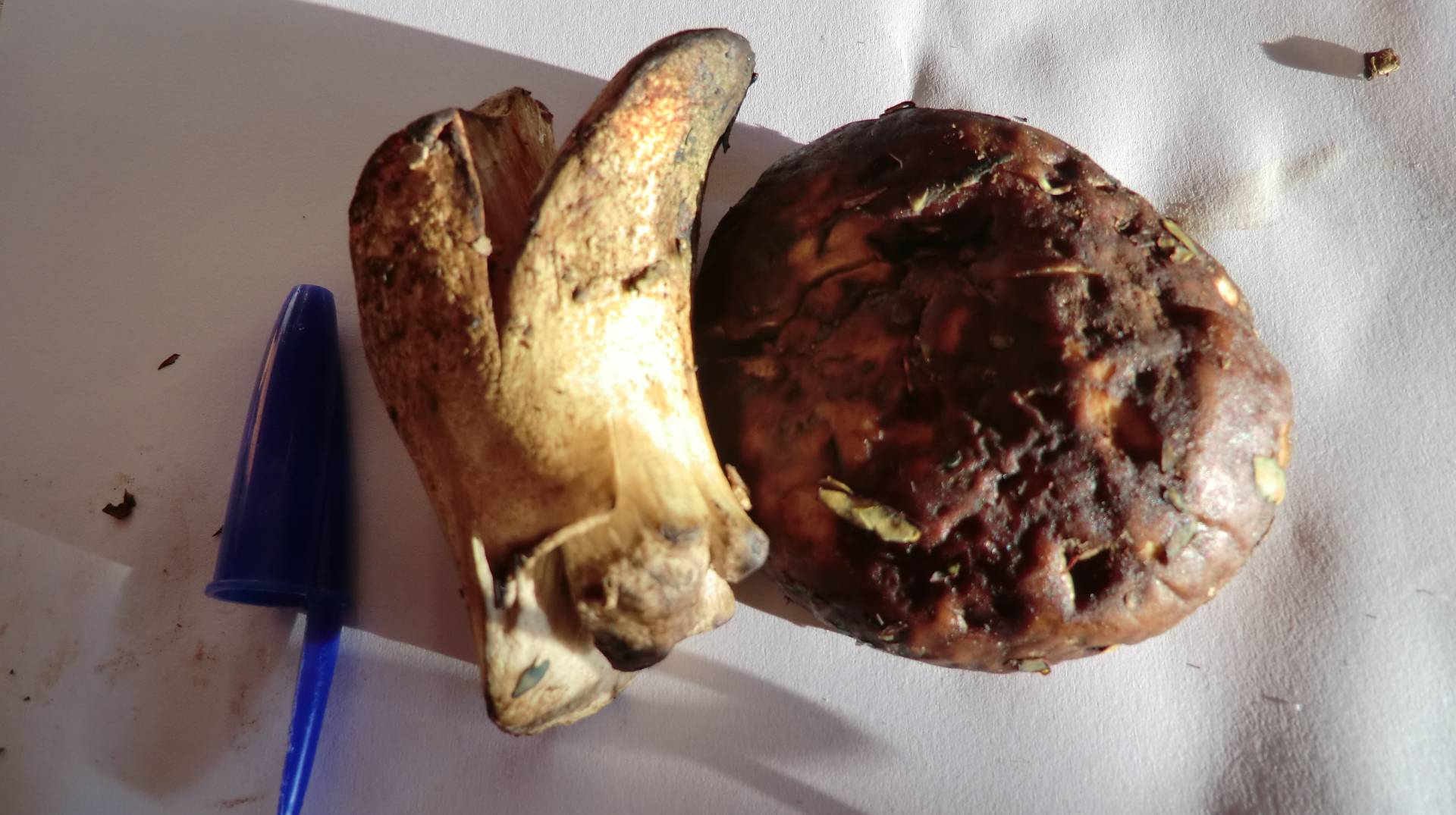 el sombrero recuerda mucho a un boletus pinicola..lo de ennegrecer no me cuadra....creo que puede ser qu este maduro por que si fuera por oxidacion se mazaria tambien la carne y solo s ve la cuticula exterior