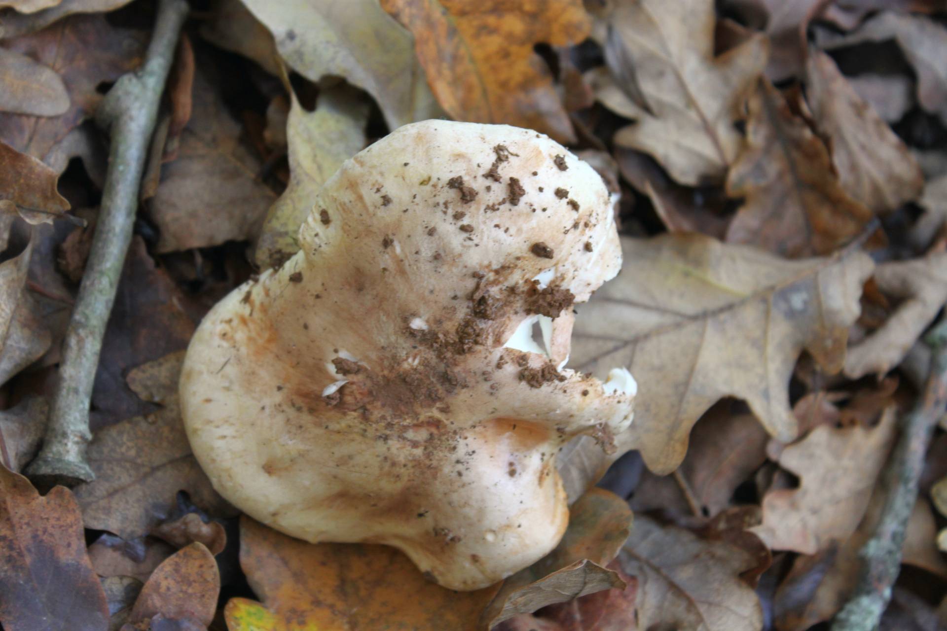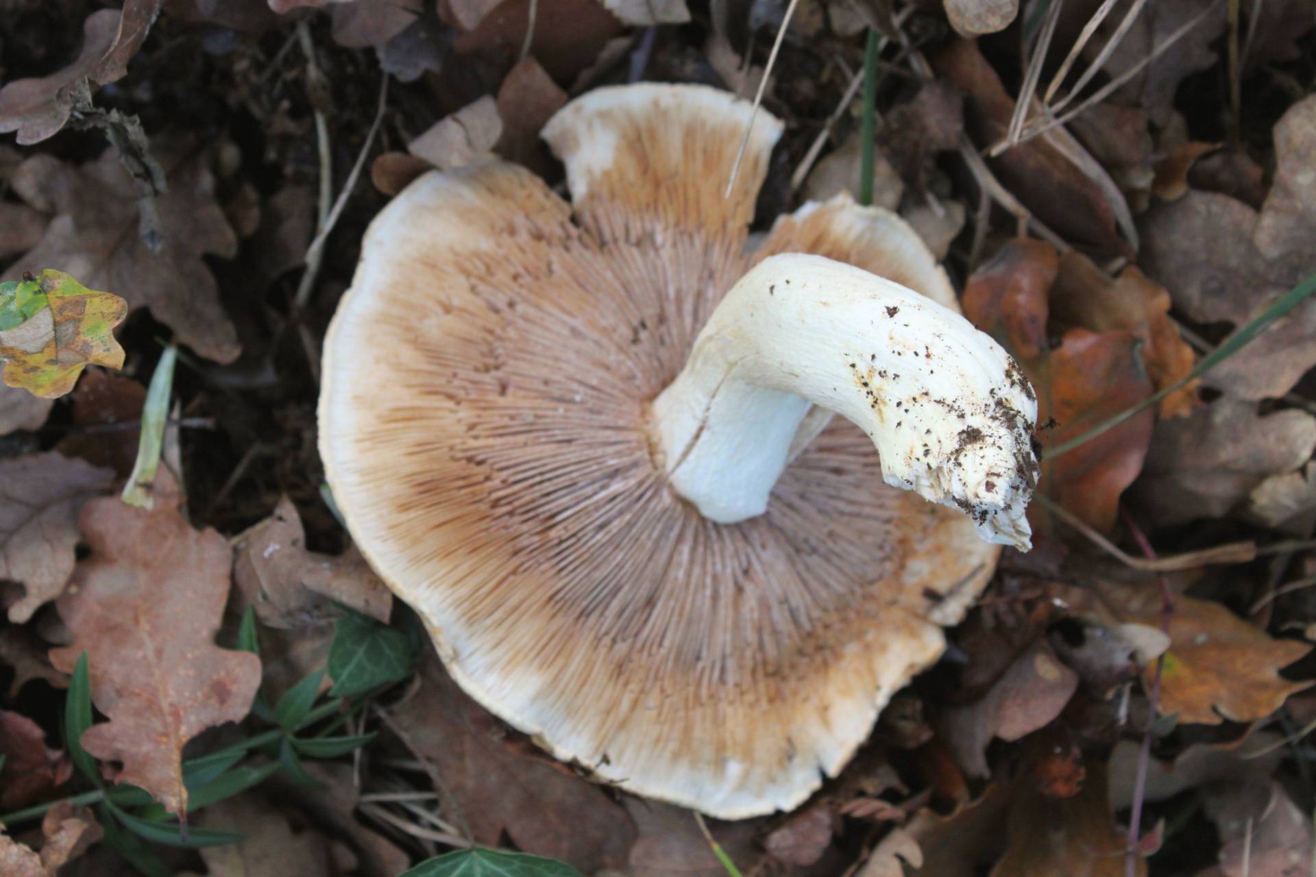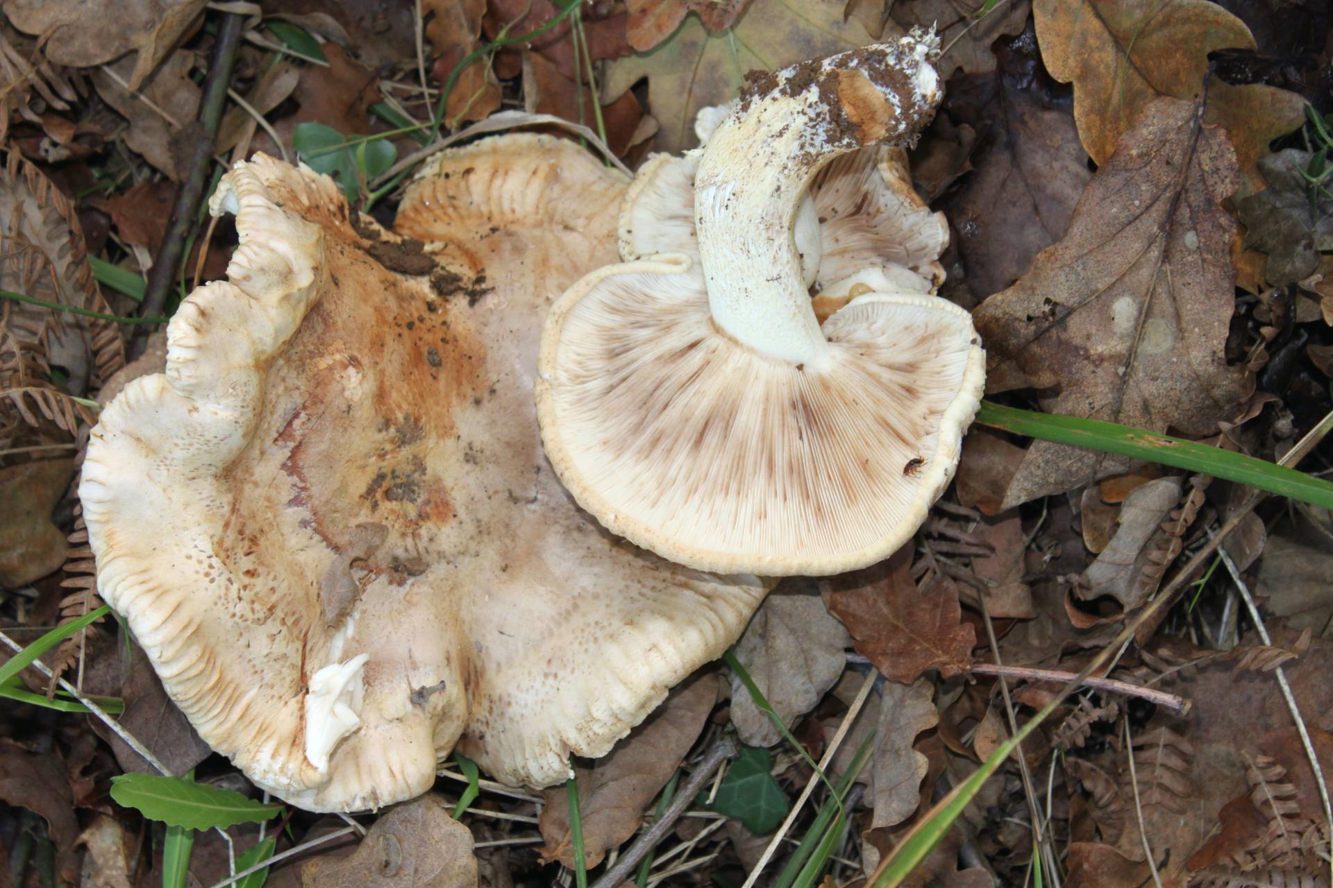 Bajo robles, en matorral. Seta de gran porte. En grupos de varios ejemplares apretados. El sombrero de las setas de mayor tamaño rozaba los 20 cm de diámetro. Sombrero de color crema, con tonos parduscos, más claro por los bordes, margen estriado, borde enrollado. Láminas escotadas. De color crema, tirando a pardusco según envejecen. Pie fuerte, lleno, retorcido en algunos casos, blanco crema. Olor fúngico suave. Sabor fúngico, ni agradable ni desagradable.