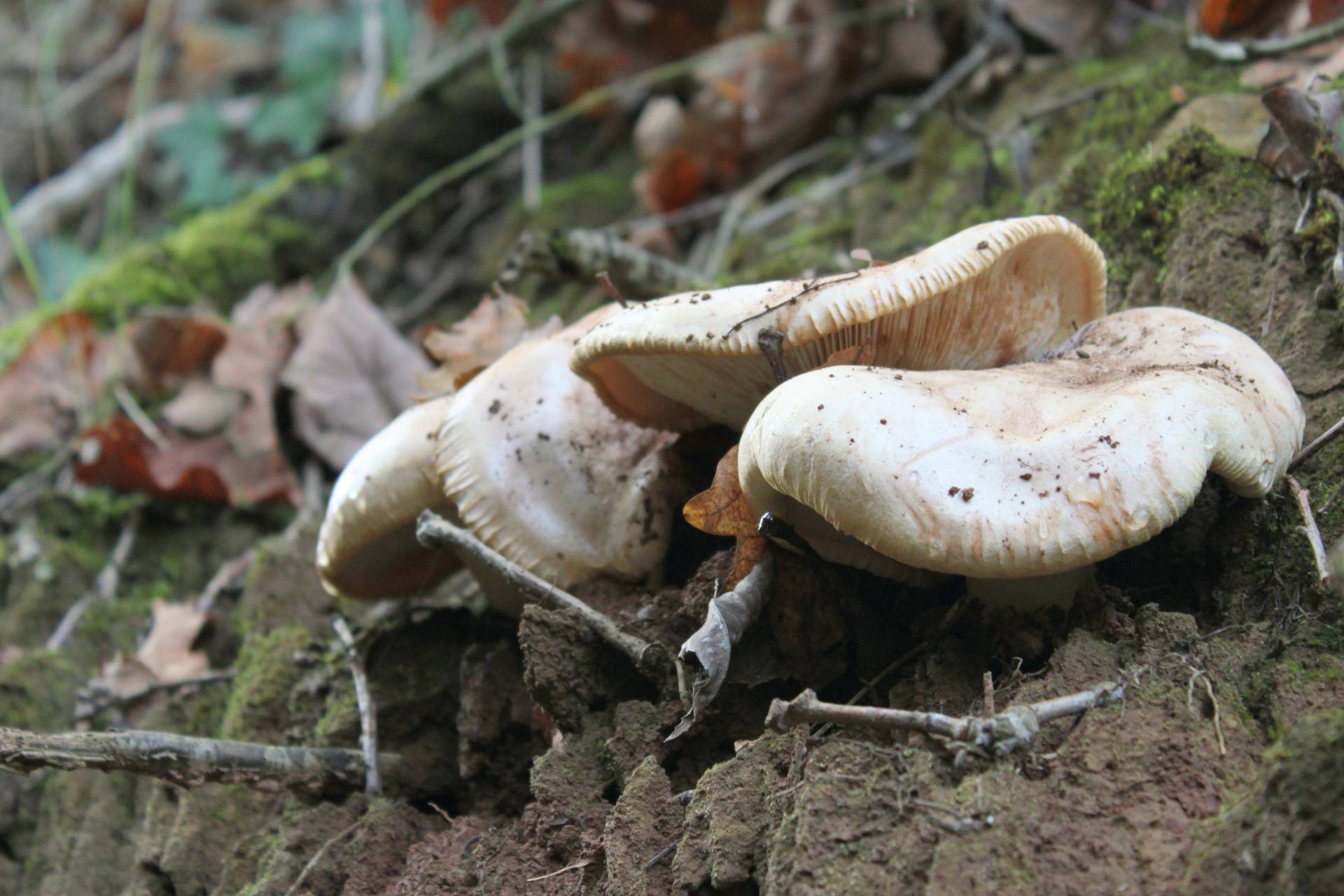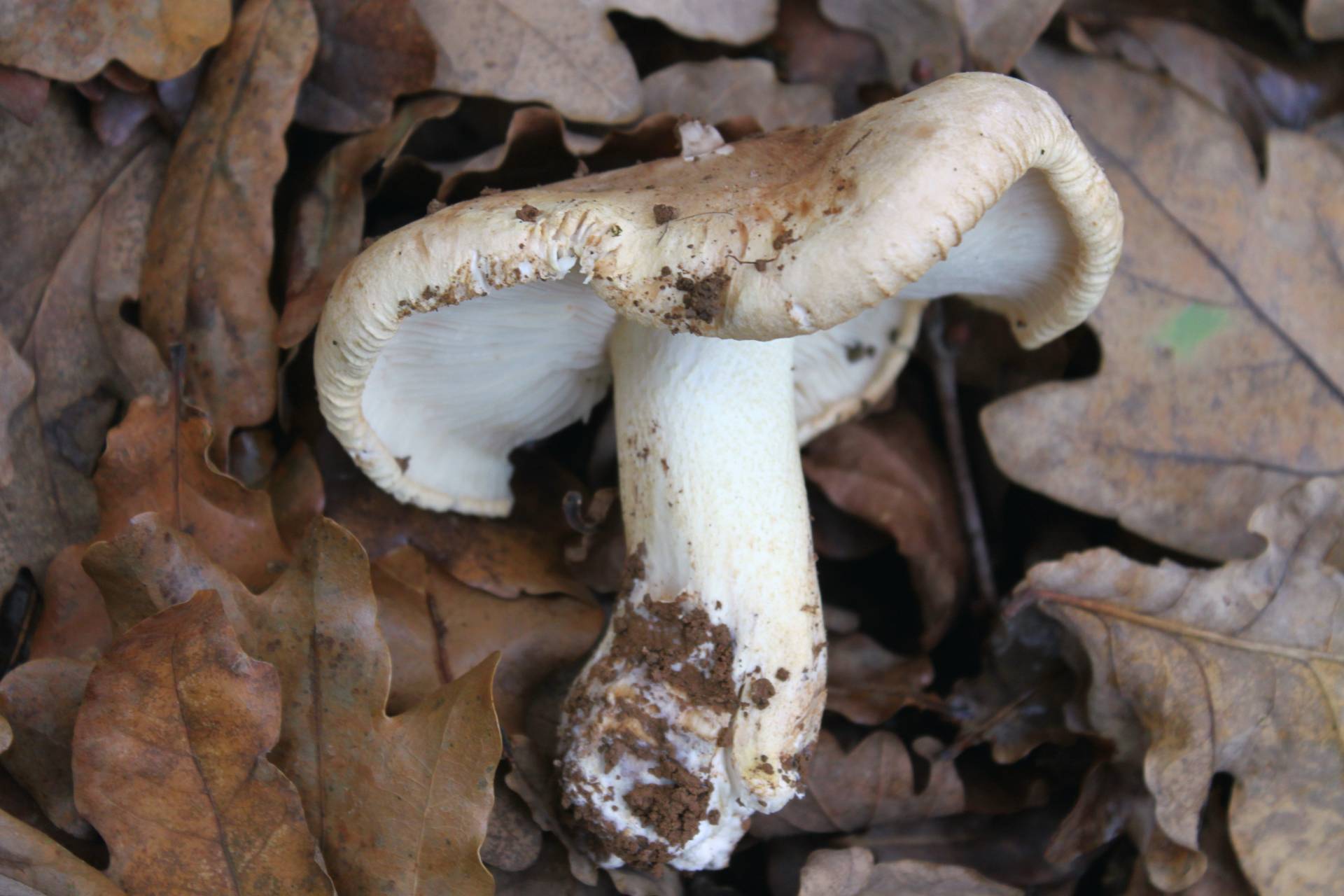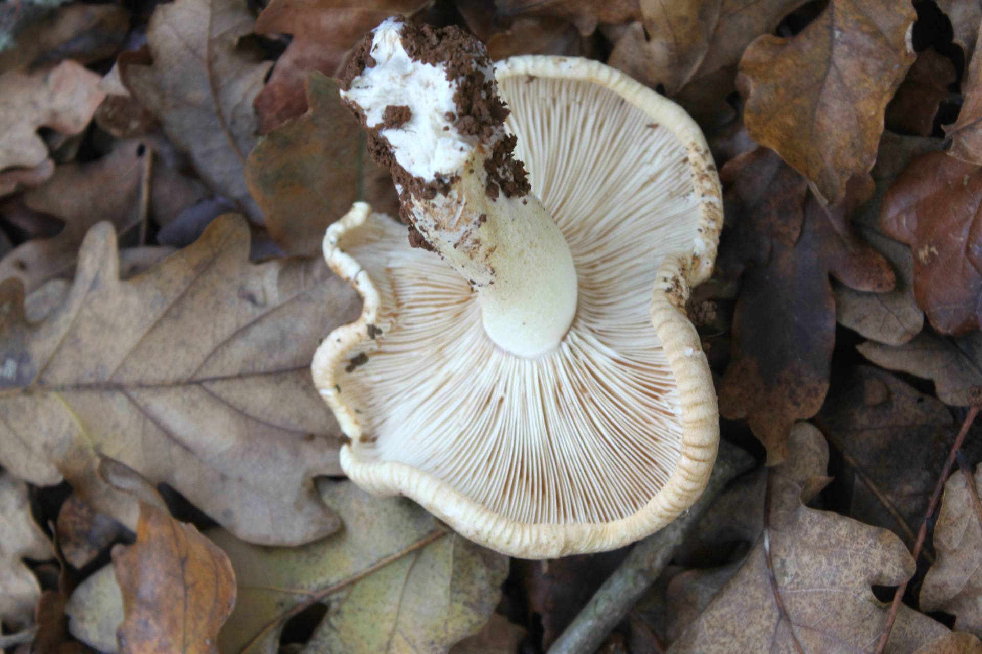 Bajo robles, en matorral. Seta de gran porte. En grupos de varios ejemplares apretados. El sombrero de las setas de mayor tamaño rozaba los 20 cm de diámetro. Sombrero de color crema, con tonos parduscos, más claro por los bordes, margen estriado, borde enrollado. Láminas escotadas. De color crema, tirando a pardusco según envejecen. Pie fuerte, lleno, retorcido en algunos casos, blanco crema. Olor fúngico suave. Sabor fúngico, ni agradable ni desagradable.