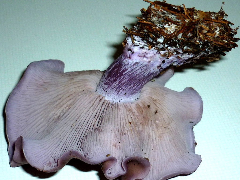 L. Nuda: Porte más robusto, carne más consistente y color violácea. Olor muy especiado, perfumado, me recuerda algo al jengibre. Restos de micelio azulado o violáceo.