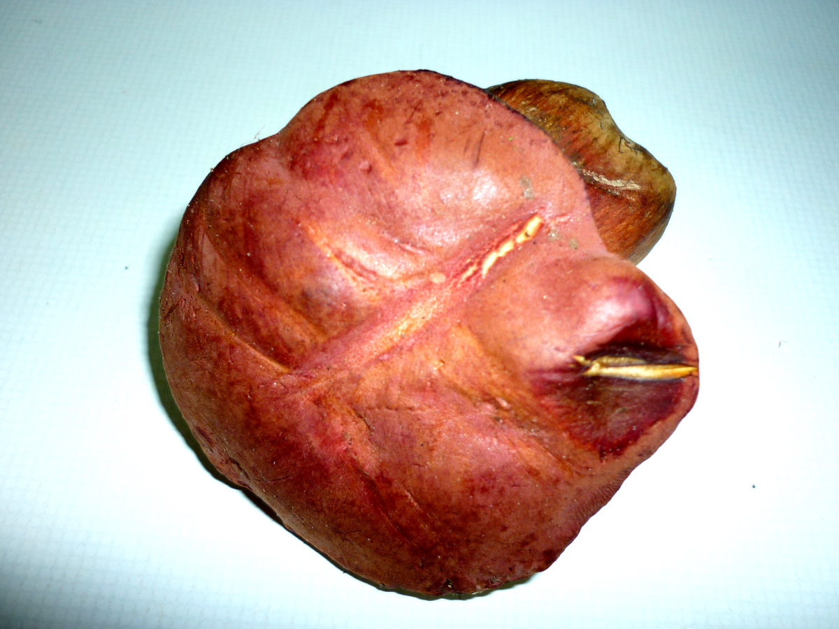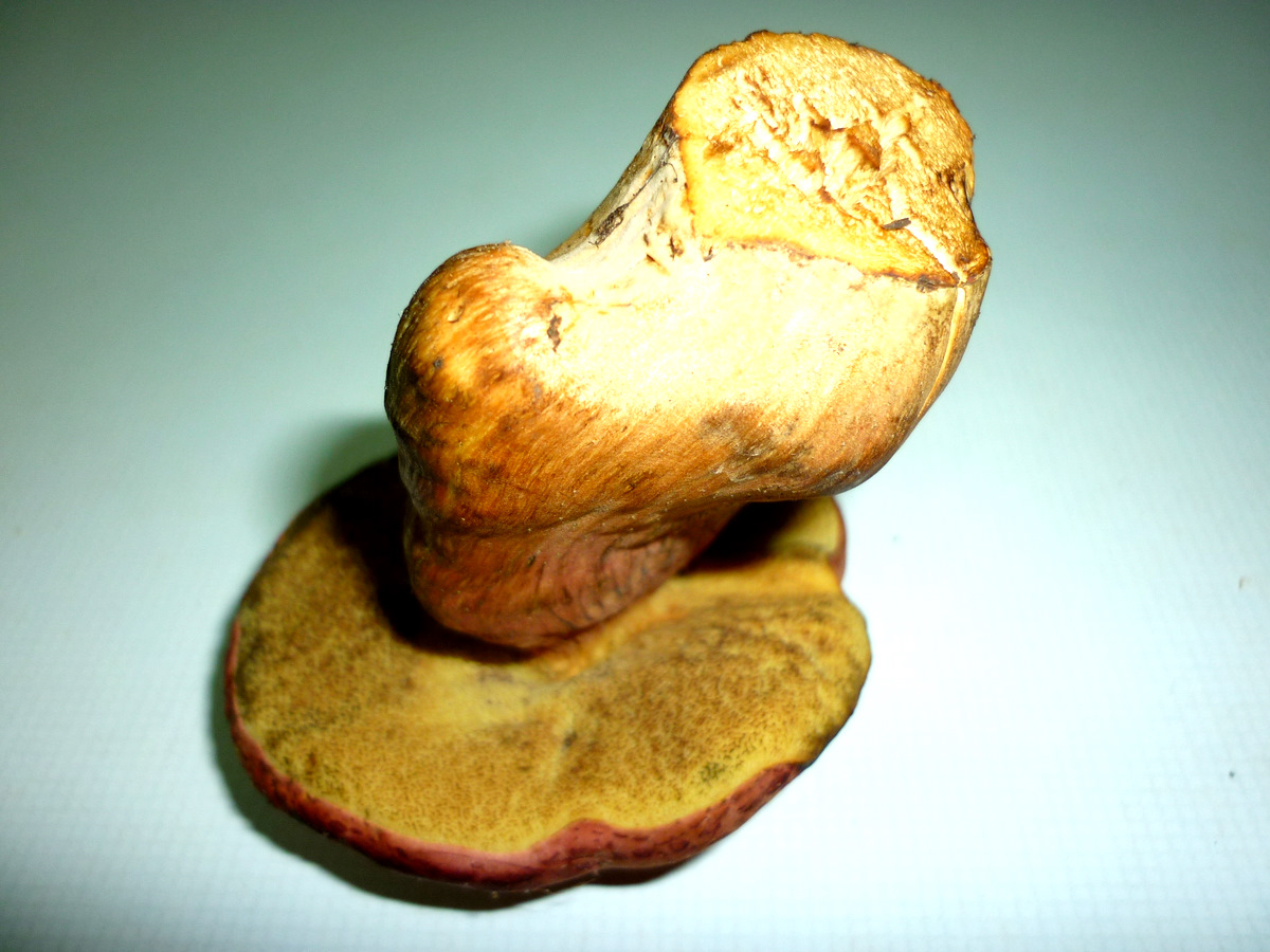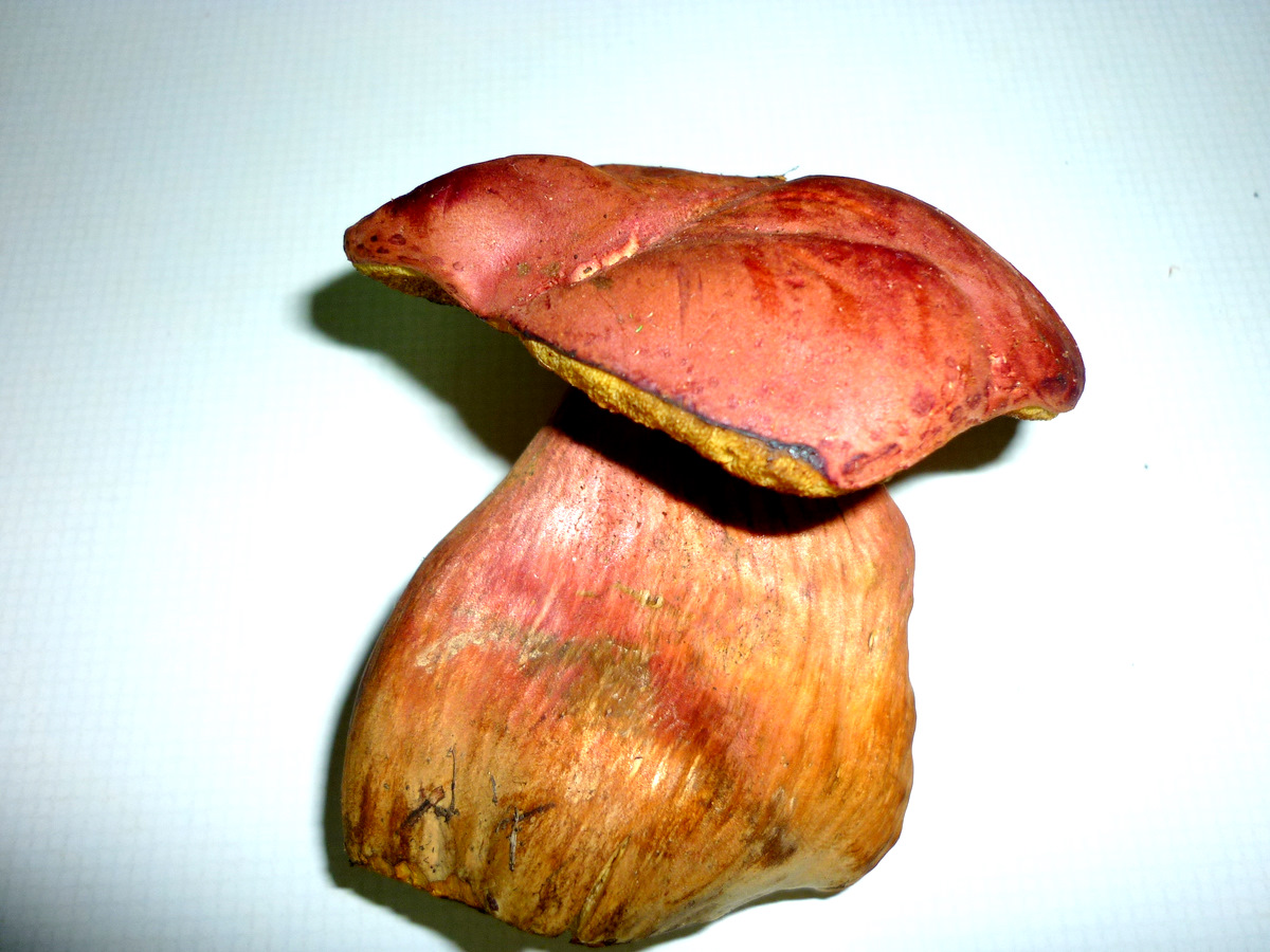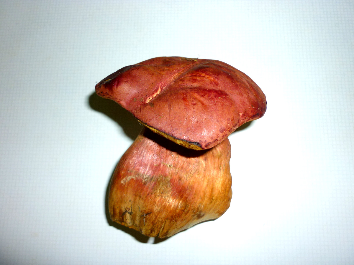 Boletacea de 9 cm. de altura y 7 de diámetro de sombrero, de color rojizo homogéneo en el sombrero y estriado verticalmente en el pie, cutícula seca, himenio amarillo con tubos cortos que a la presión ennegrecen, carne amarillenta en el pie y mas blanquecina en el sombrero, que al corte azulea débilmente solo en la unión del pie con el sombrero y en éste bajo los tubos.