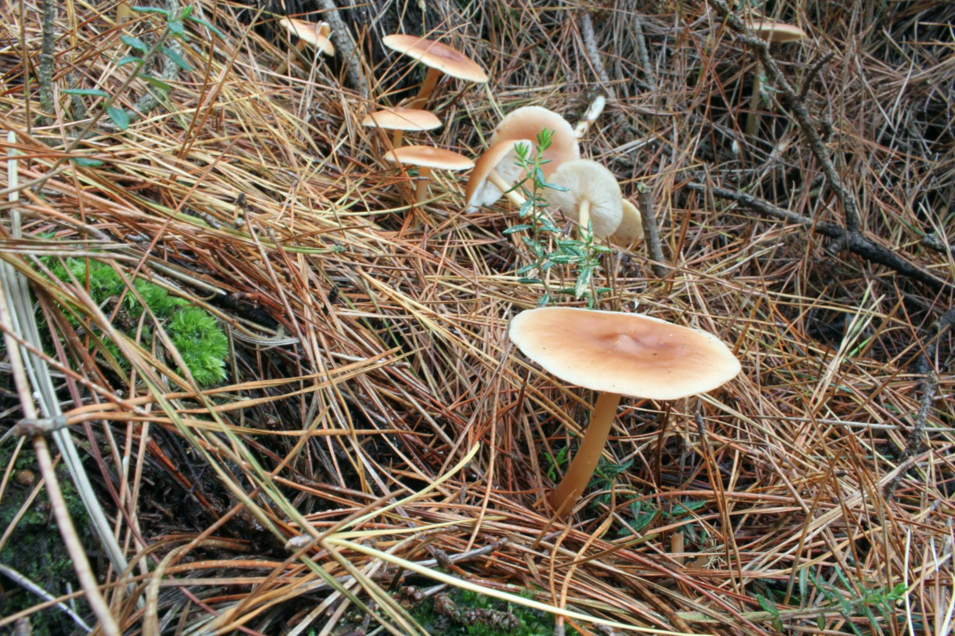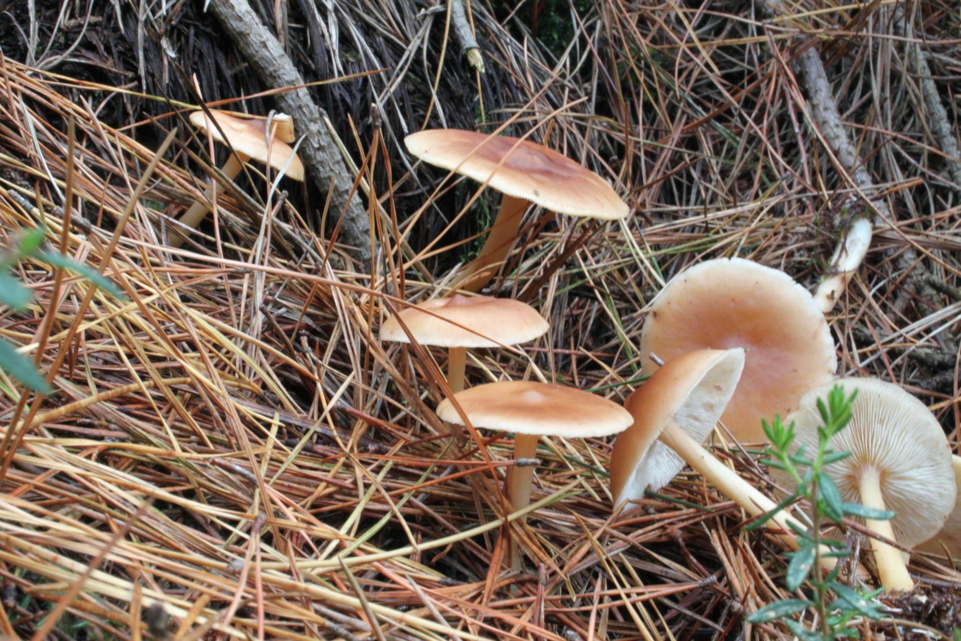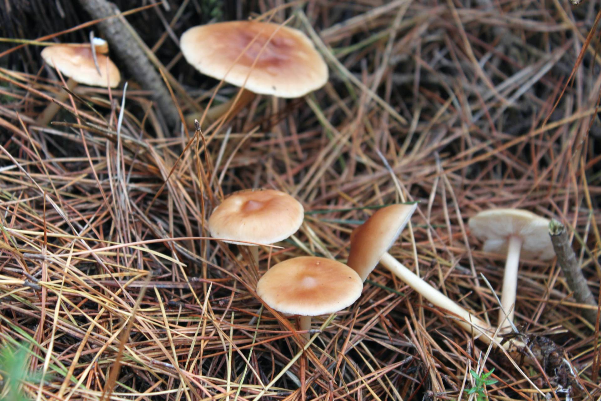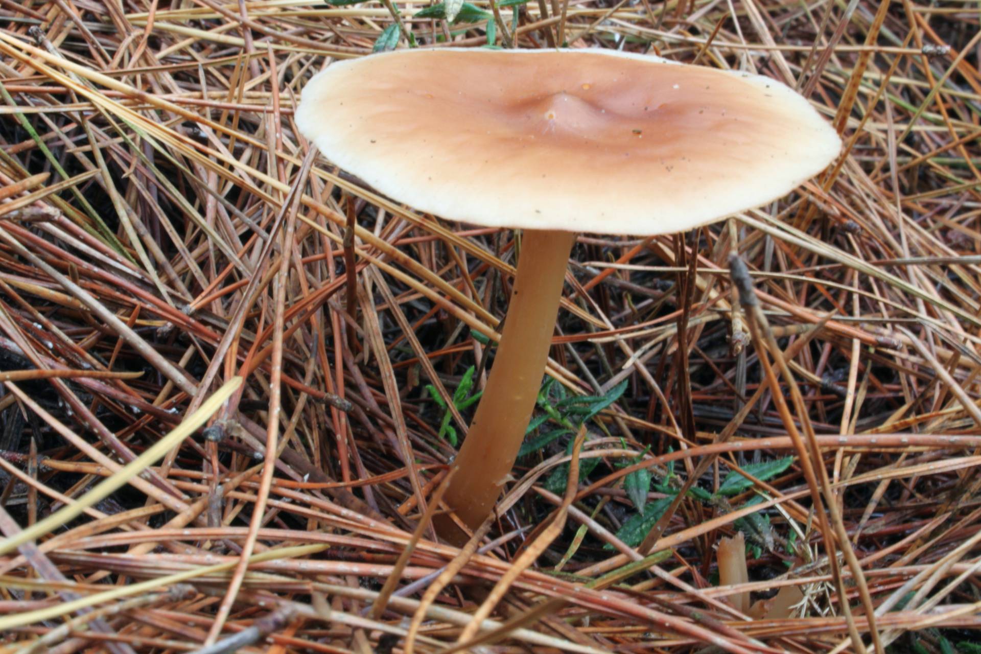 En pinar, formando una corra con numerosos ejemplares. Sombrero de 3 a 6 cm de diámetro, que presenta un mamelón central, de color cuero o pardo rojizo, degradado a crema hacia el margen. Láminas blancas, apretadas. Pie esbelto. Olor suave.