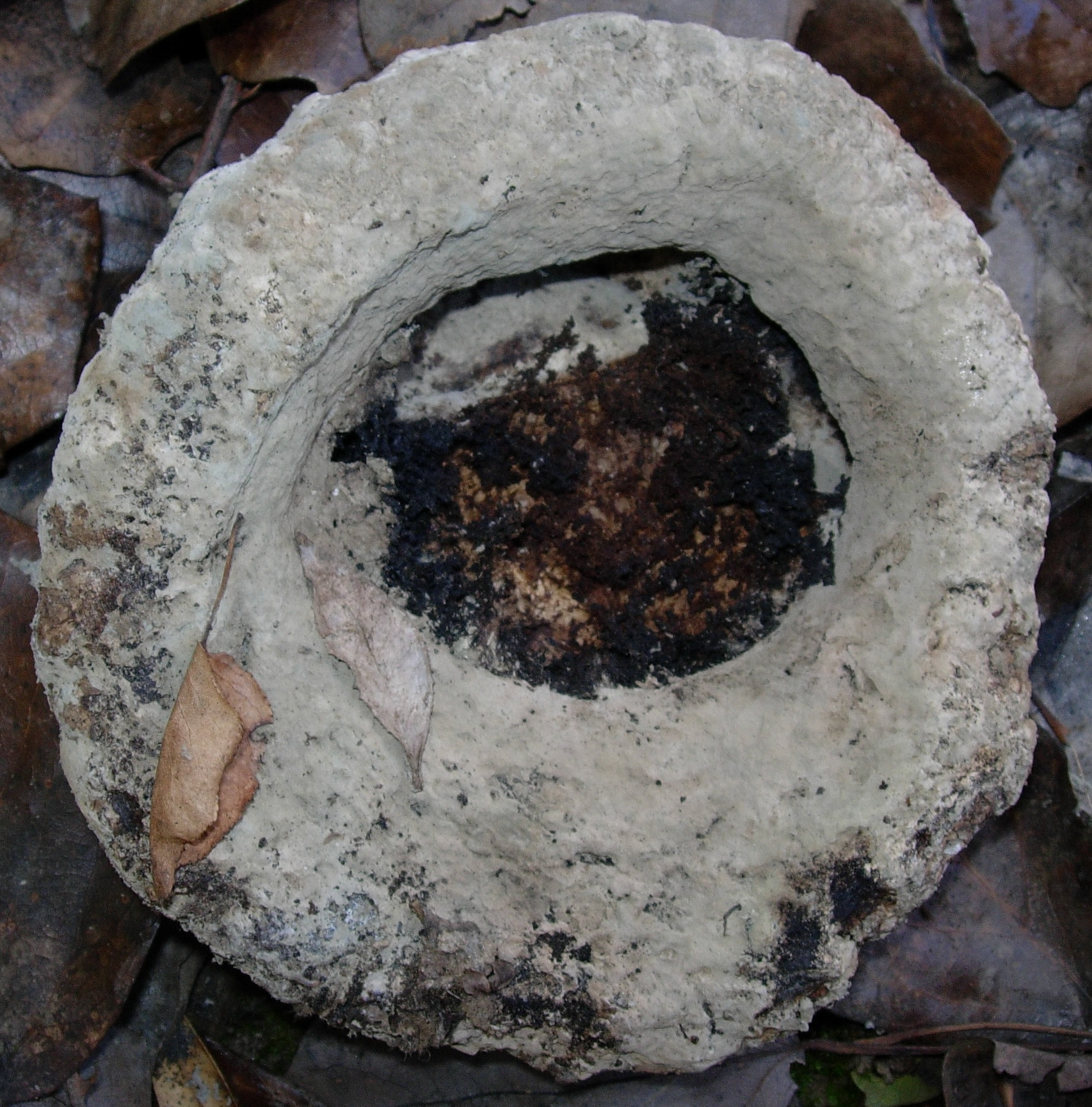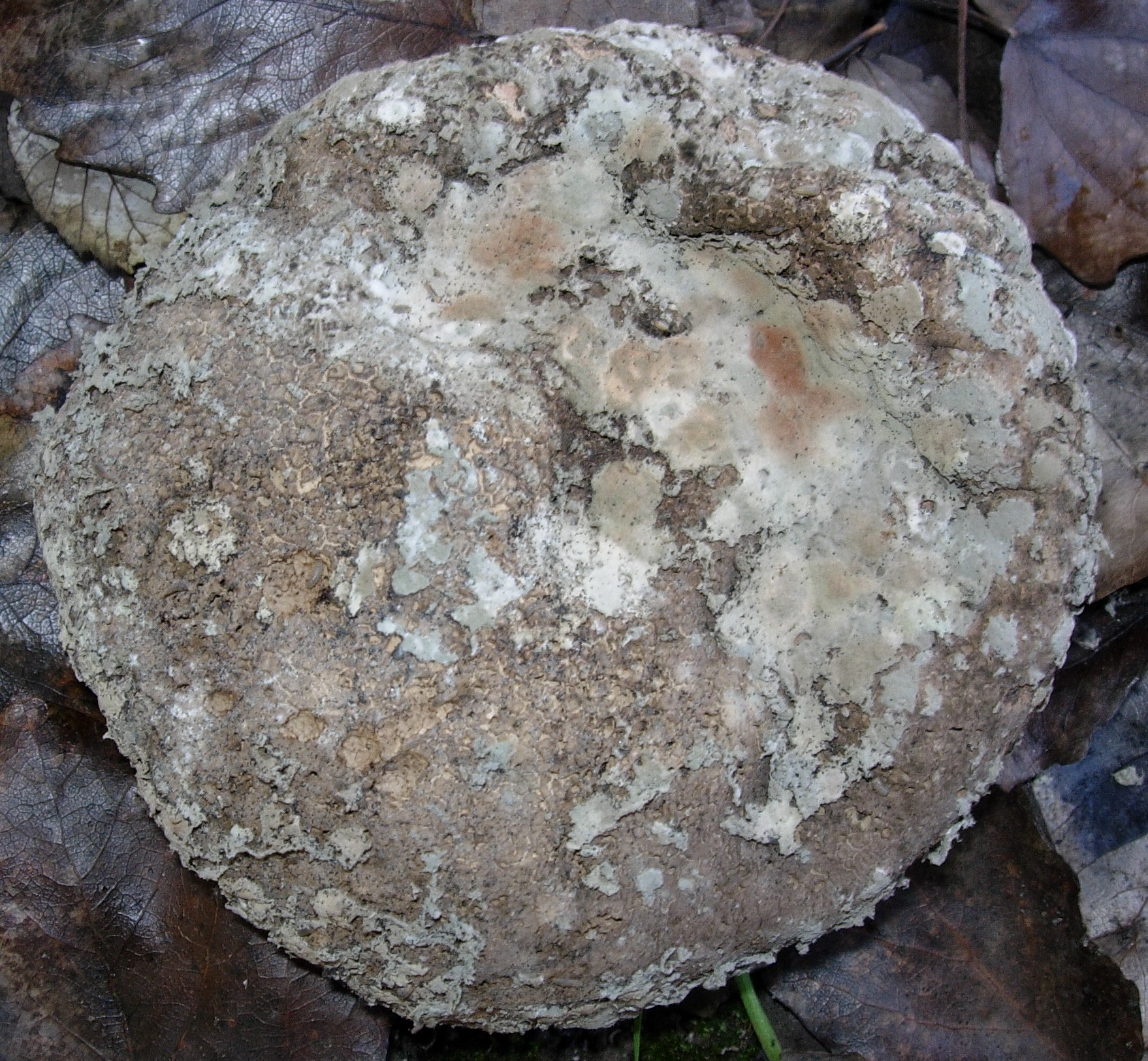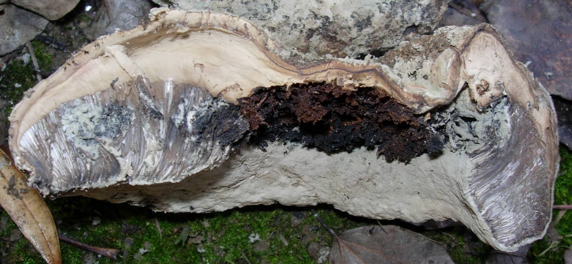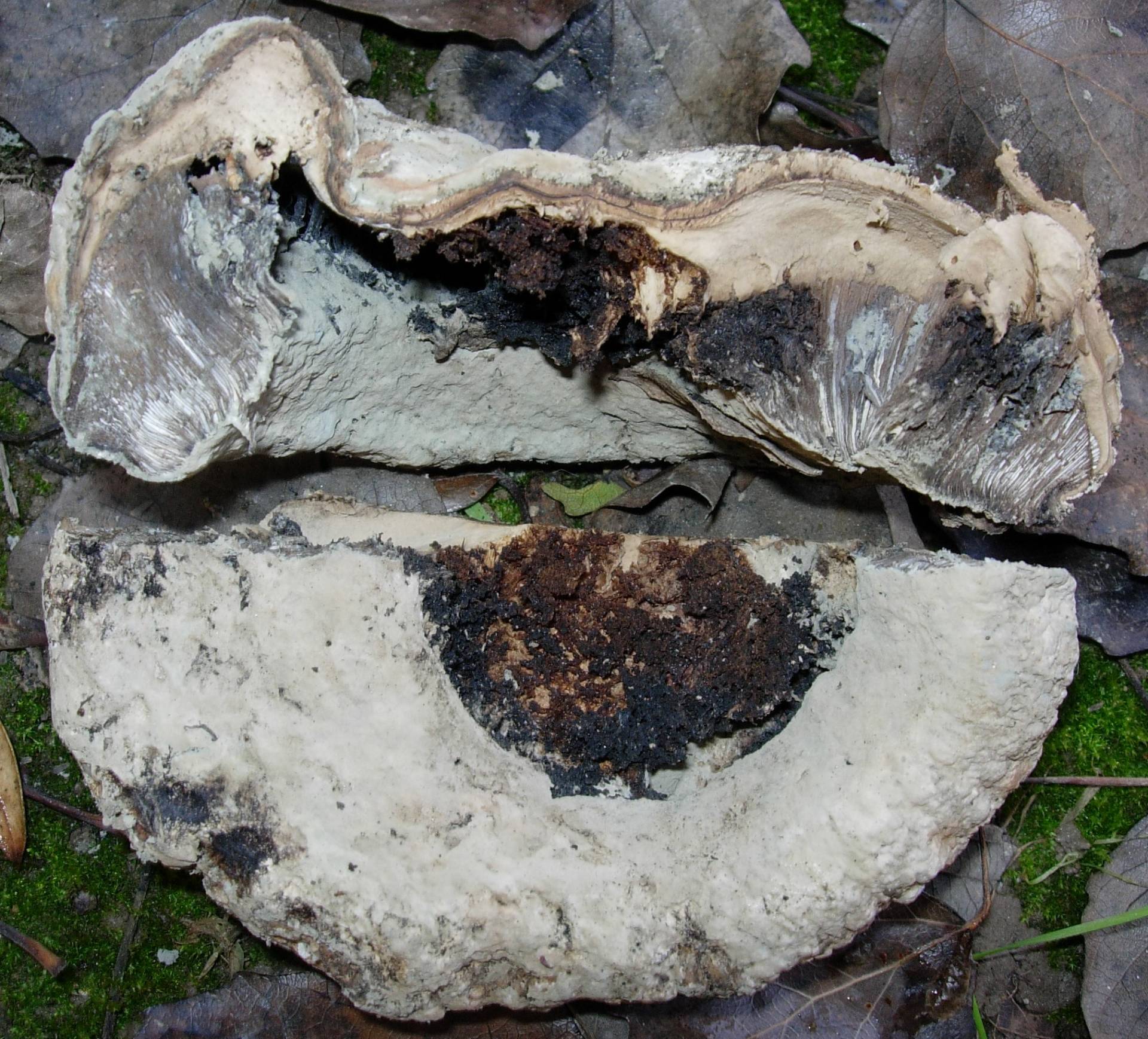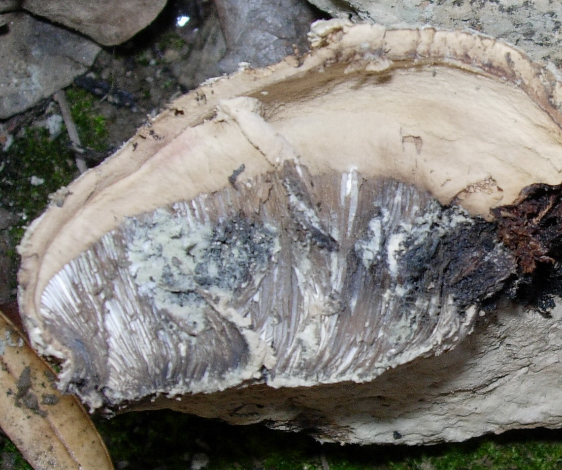 La encontre el Lunes en una acequia, seguramente habia caido al perder el pie y debe ser de este verano, en unos taludes donde en epocas calurosas encuentro bastantes Battarrea phalloides. se parece mucho a su sombrero, de consistencia leñosa, sino no hubiera agiuantado,. no tiene cuticula, las sulen perder, las laminas no parecen laminas pero tampoco tubos. Lo que no me cuadra es el tamaño, 11 cm de diametro, demasiado grande o quiza un ejemplar anormal.
