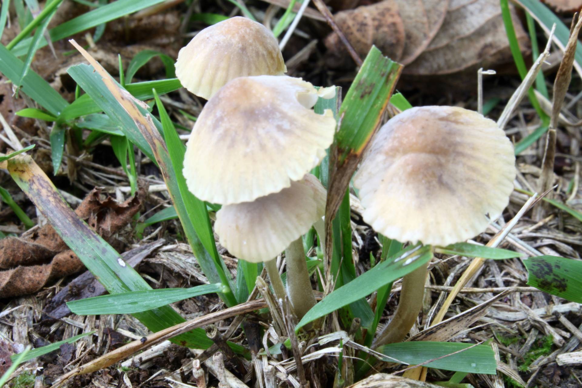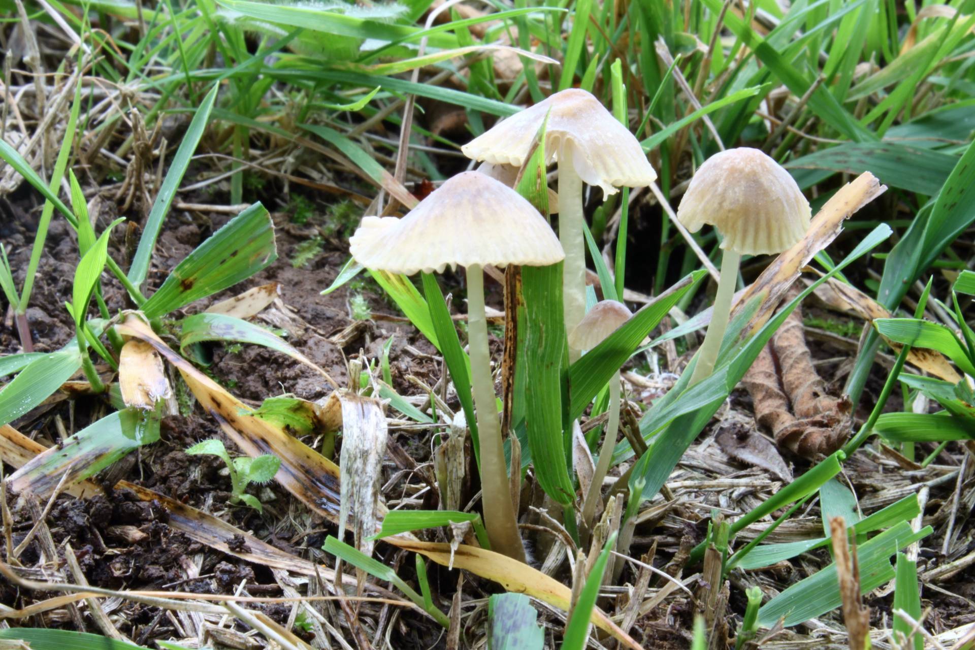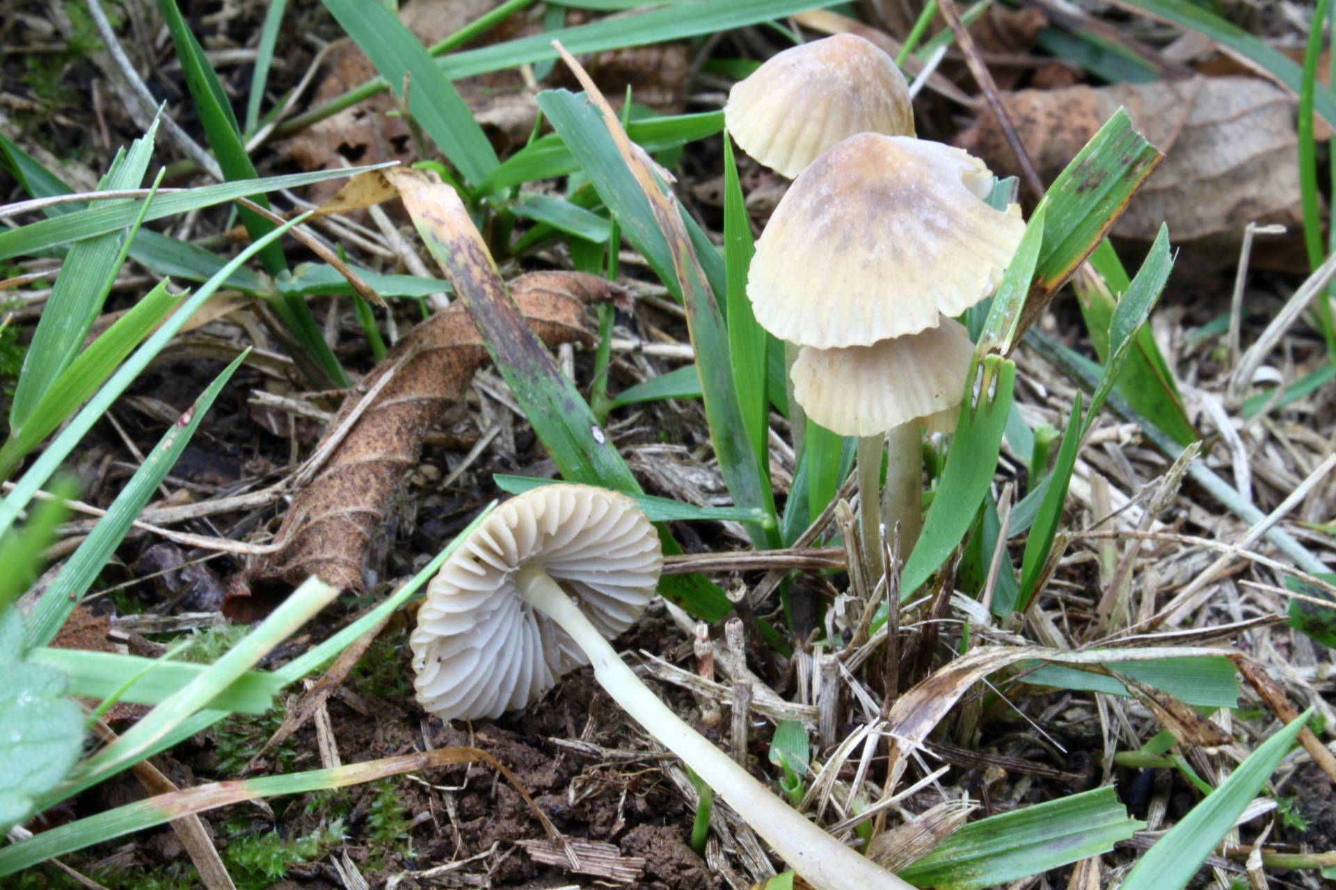 Especie localizada junto a un grupo de avellanos silvestres. Sombrero de unos 2 cm de diámetro, de un colorido relativamente neutro, con tintes amarillentos, que pasa un tanto desapercibido entre la hierba. Margen estriado por transparencia. Pie translúcido, oscurecido hacia la base. Claro y distintivo olor a lejía.
