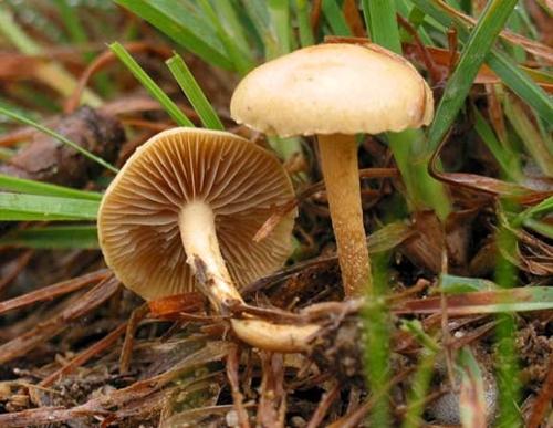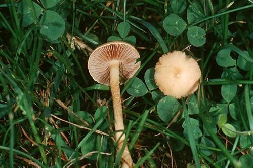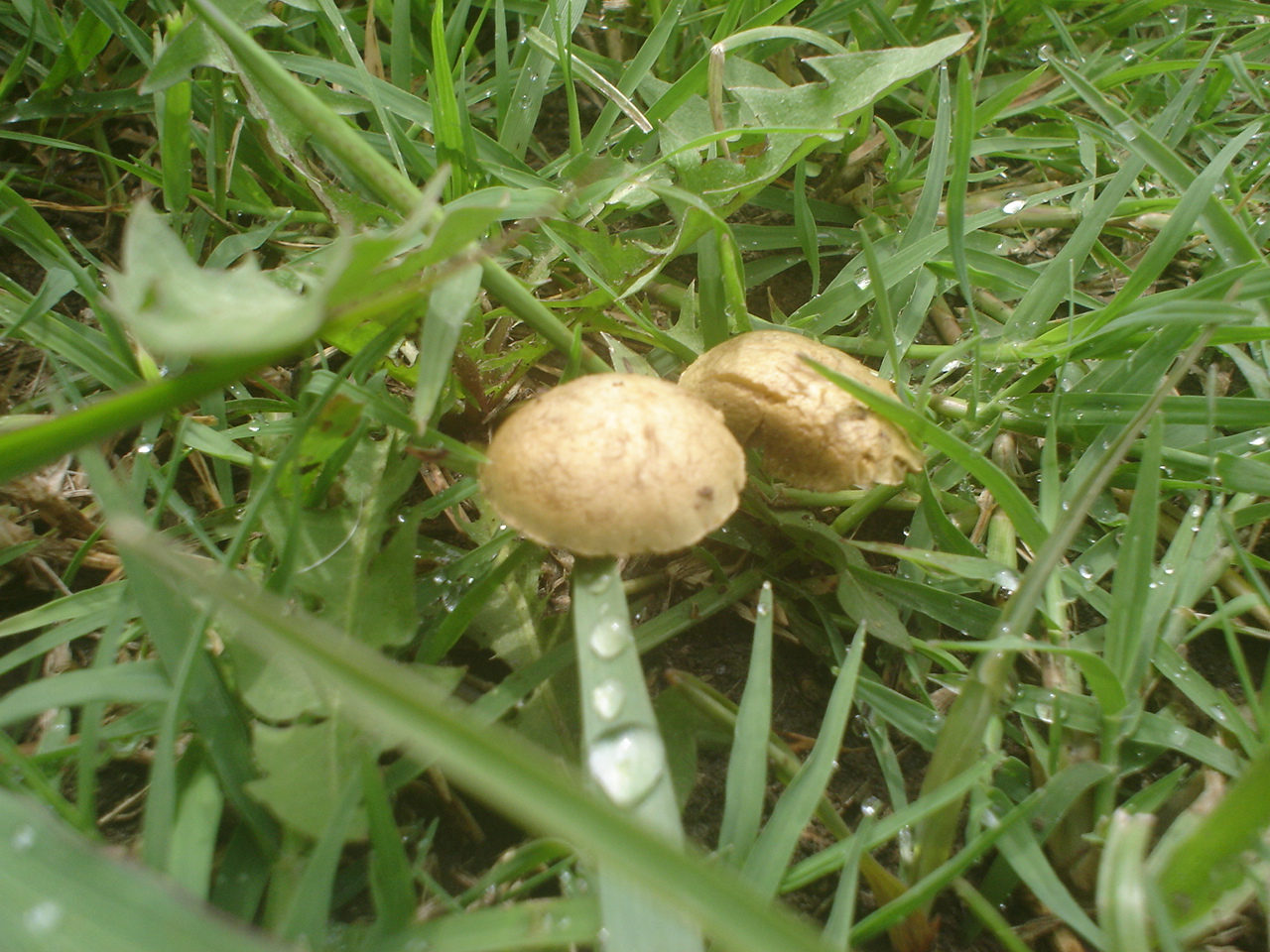 tienes razón, parece ser el "agrocybe pediades" hongo pequeño que crece en parques y jardines, en fructificaciones aisladas.envío fotos de catlogo.