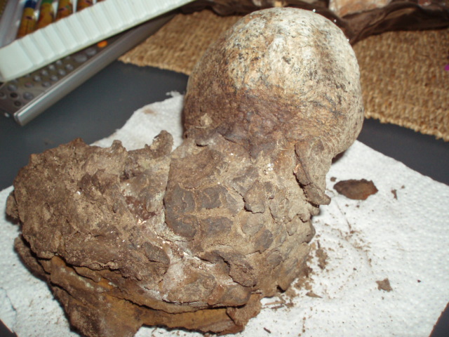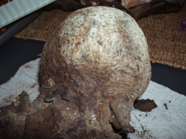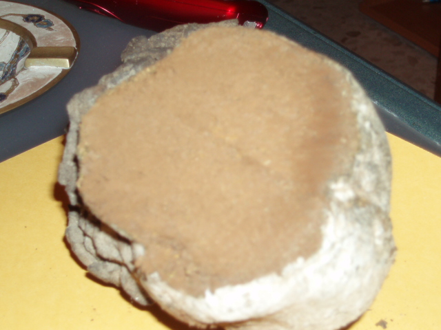 Encontrado en pinar,olor dulzon fungico.Tiene una especie de raiz.La zona de la gleba,tiene en la zona del cuello un collar en forma de estrella.Parece un cuesco de lobo pero con esa especie de raiz que estaba enterrada.Está en estado pulvurulento.