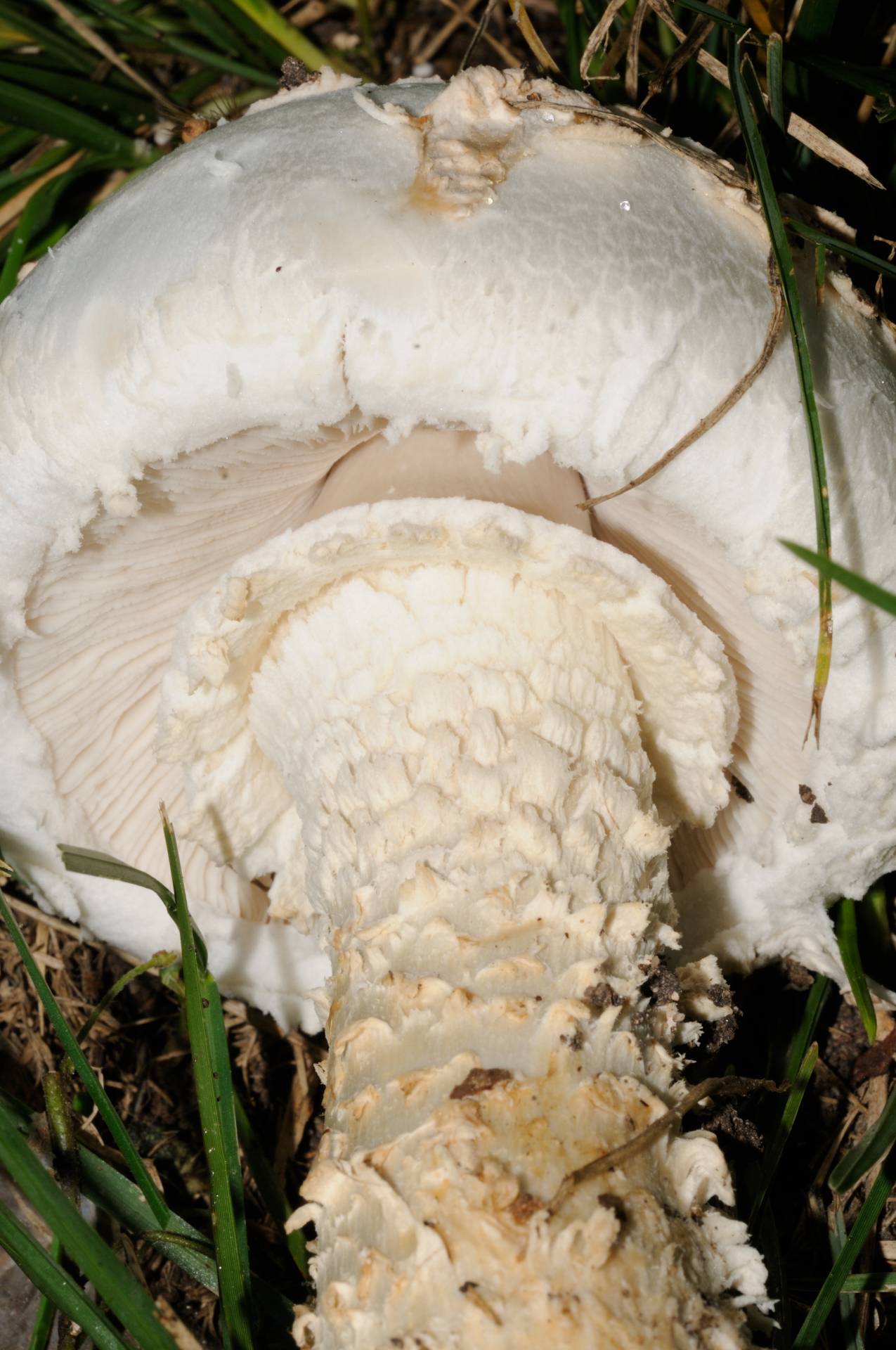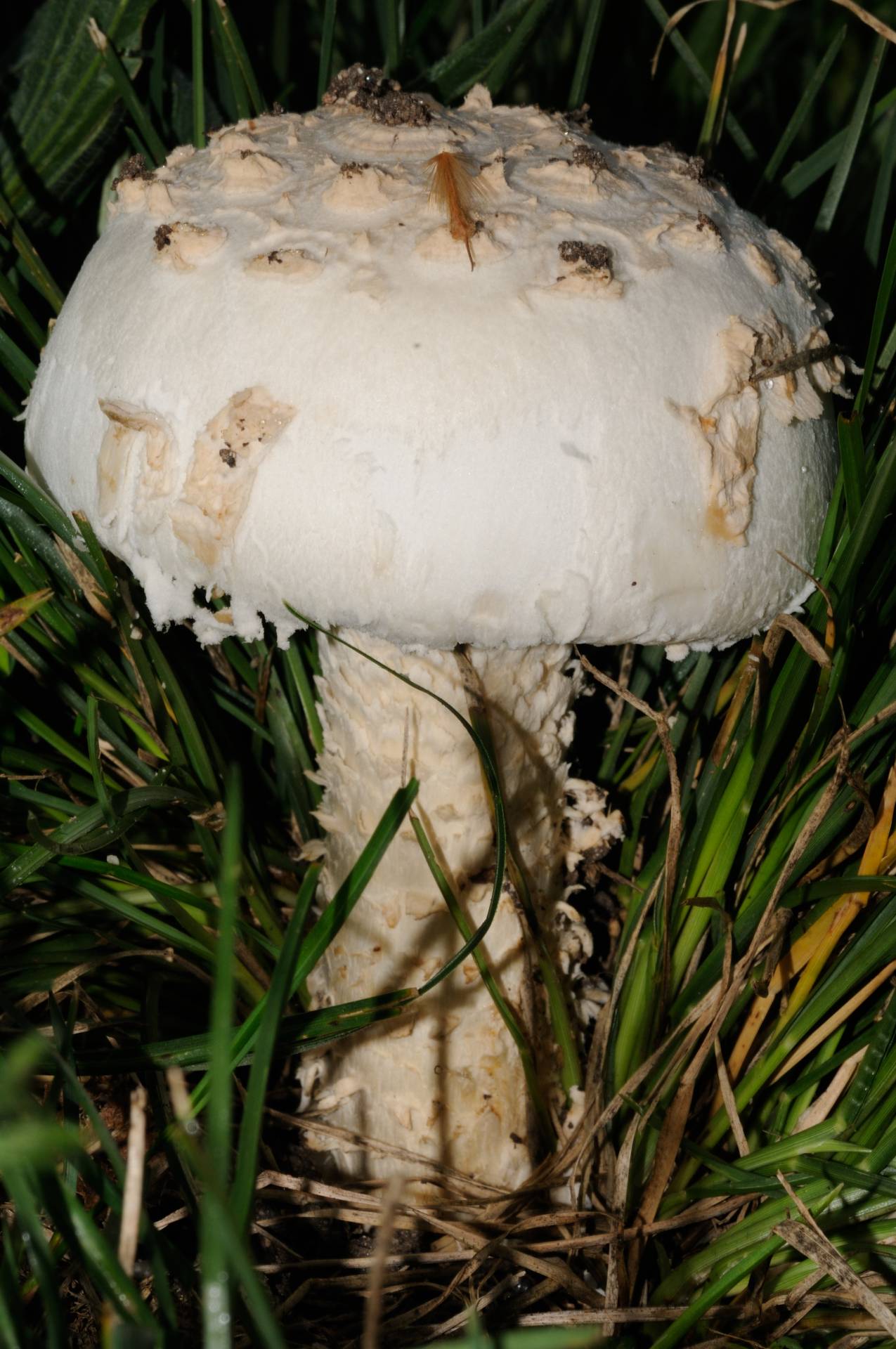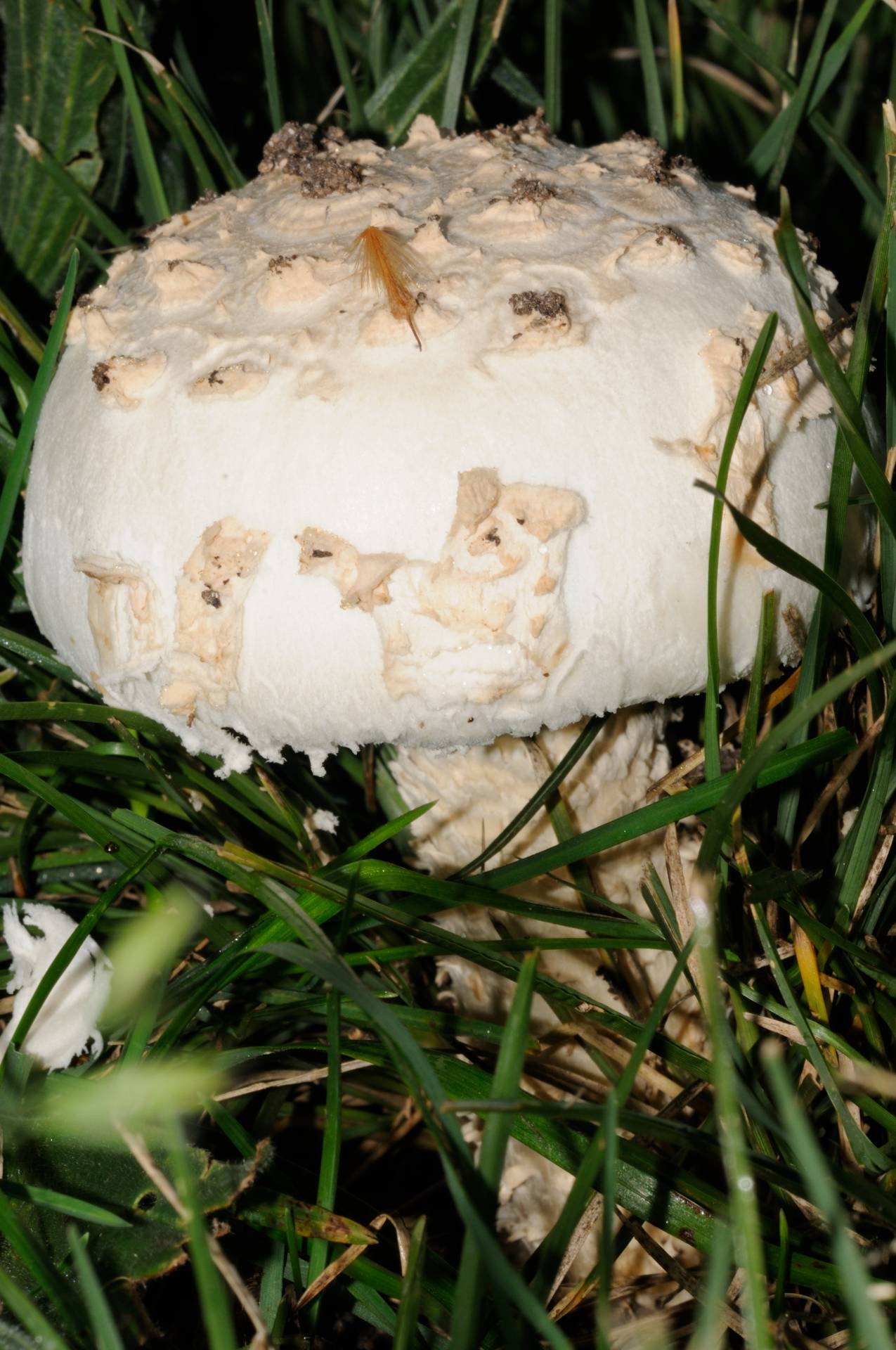 En un principio uno piensa en algun tipo de macrolepiota, pero claro, lo descarta el color blanco y las escamas en el pie. Como veis, la hierba estaba bastente alta, el mismo dia por la tarde me la encontre recien cortada y ni rastro de setas.