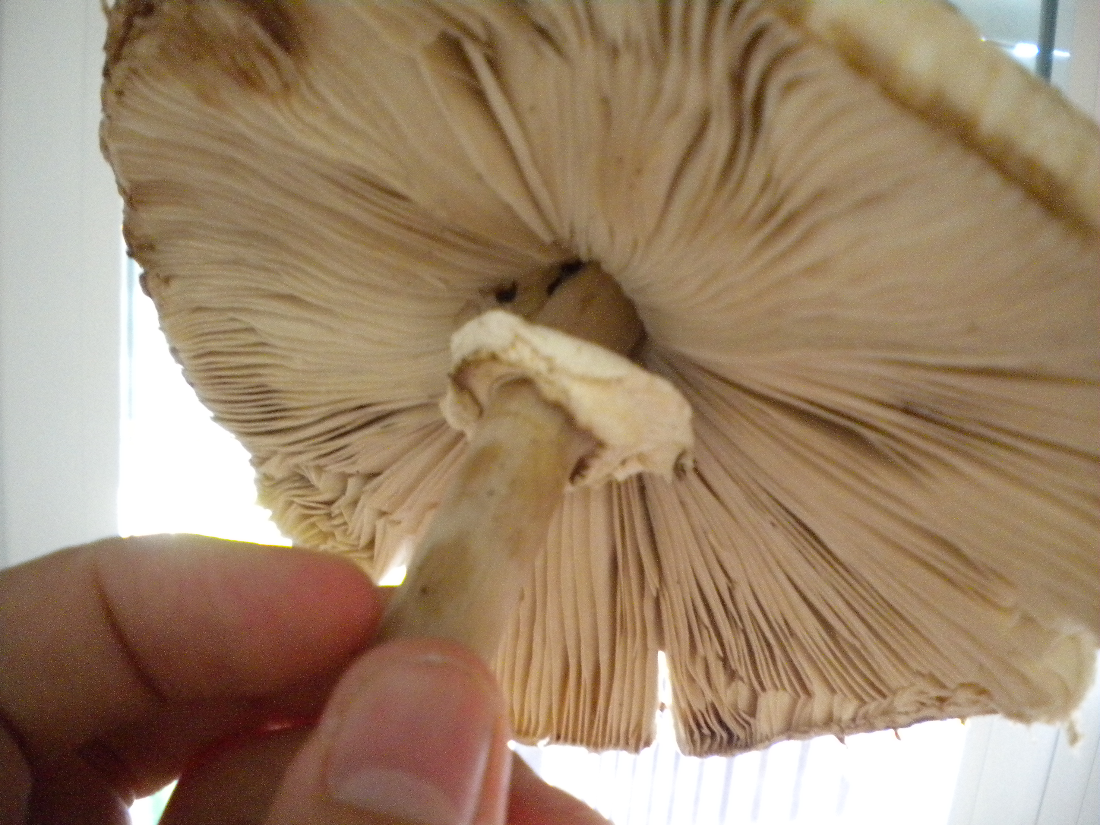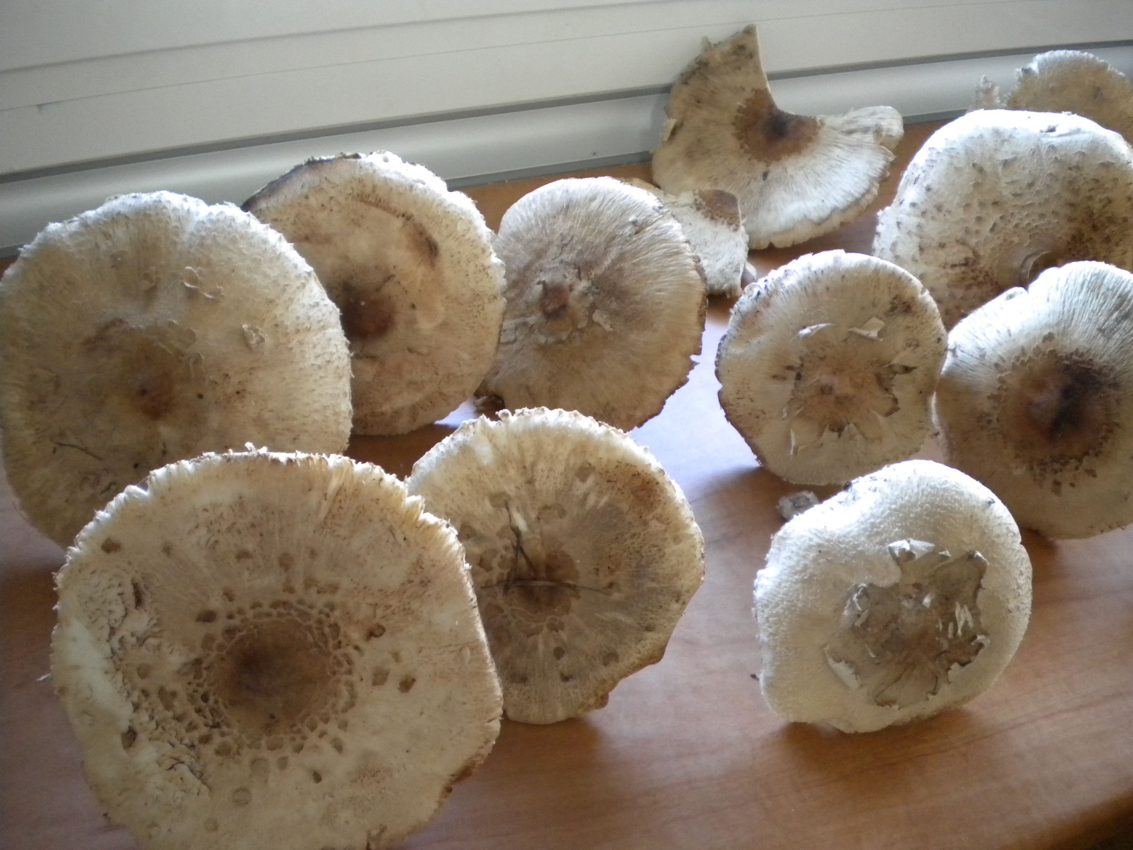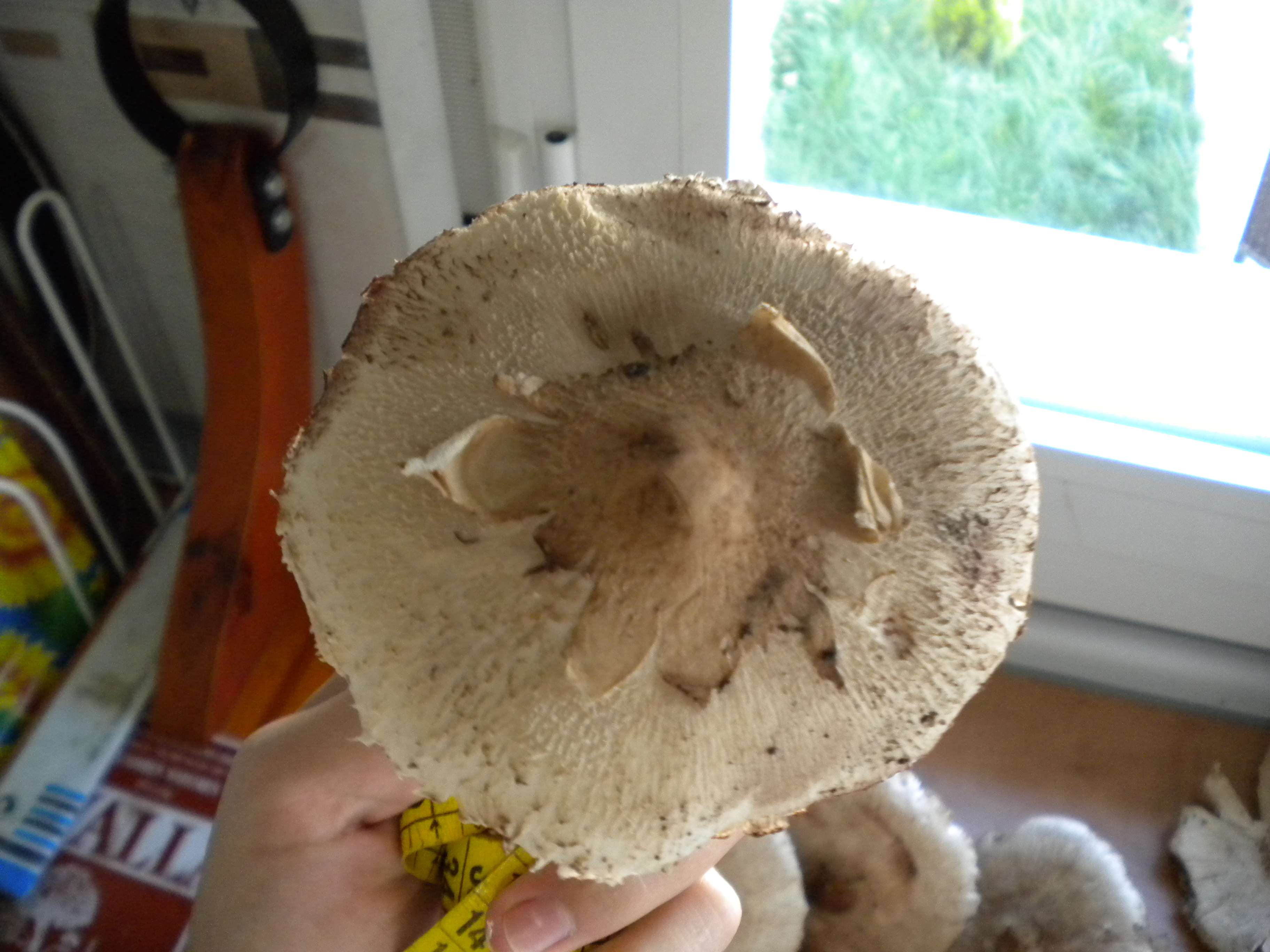 ahora estoy cogiendo lepiotas o eso parecen pero no estoy muy seguro de ellas os voy a colgar las fotos y si podéis me contestáis la mas grande tiene un diametro de 19 cm y la mas pequeña de 11 creo q son todas de la misma clase pero tampoco estoy muy seguro tienen como motitas blancas un poco marrones y sobre todo son blancas las laminas de debajo son blancas y en algunas estan como manchadas de marron. muchas gracias