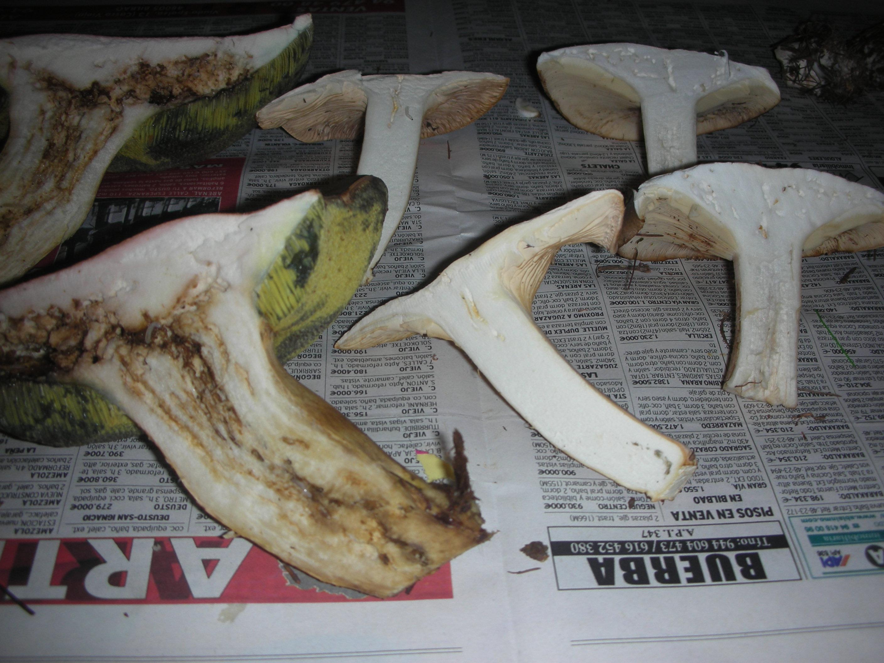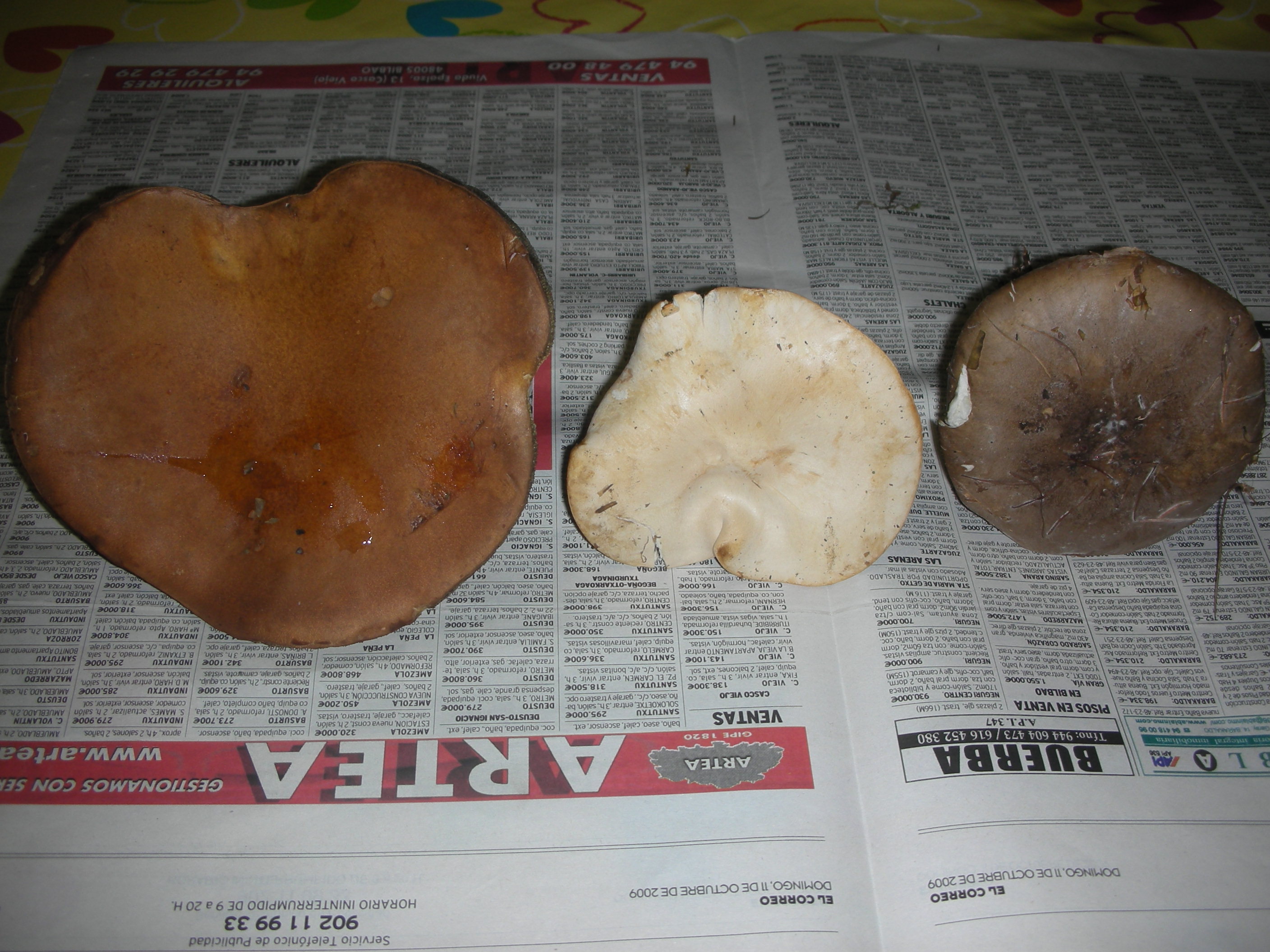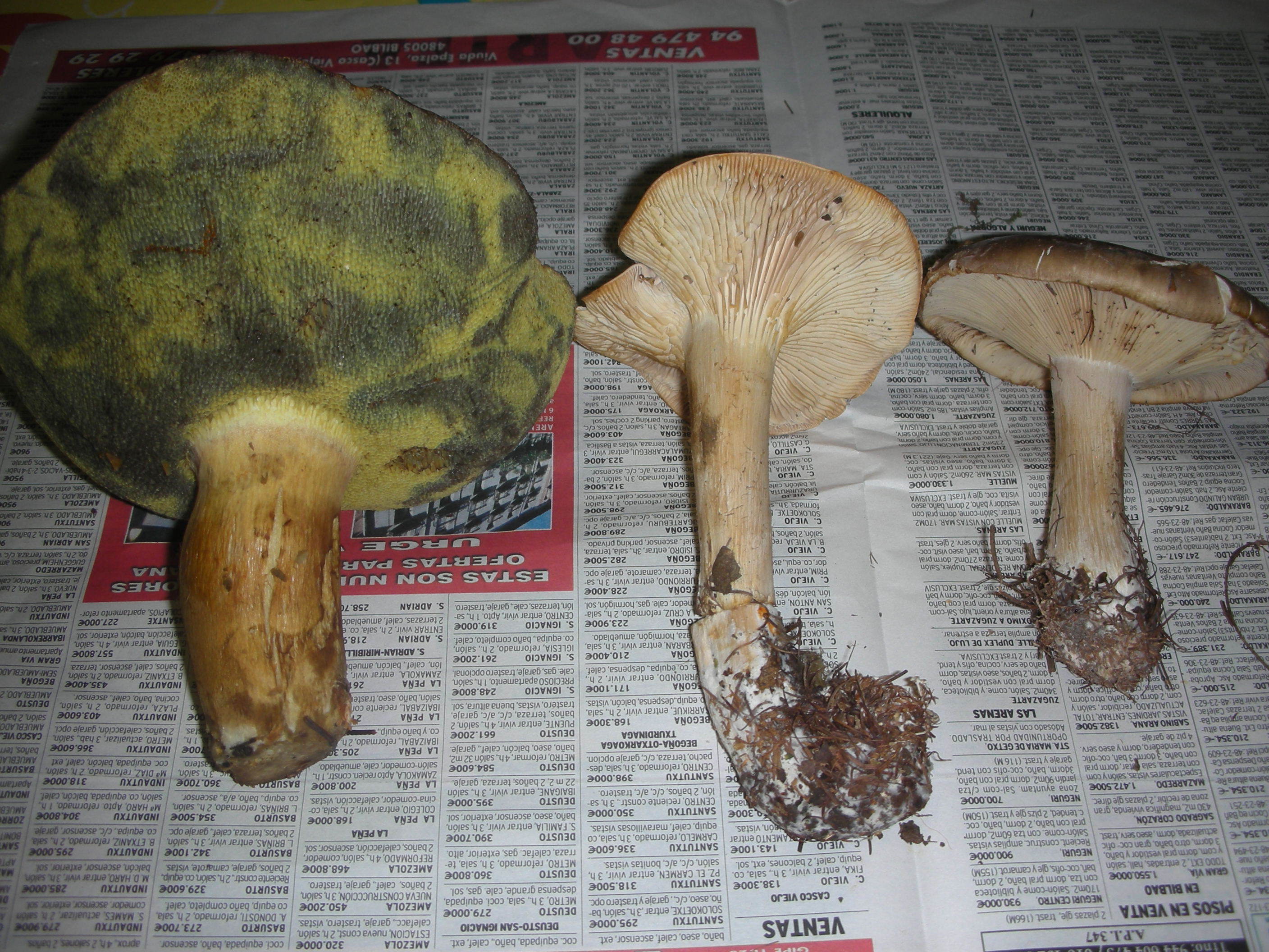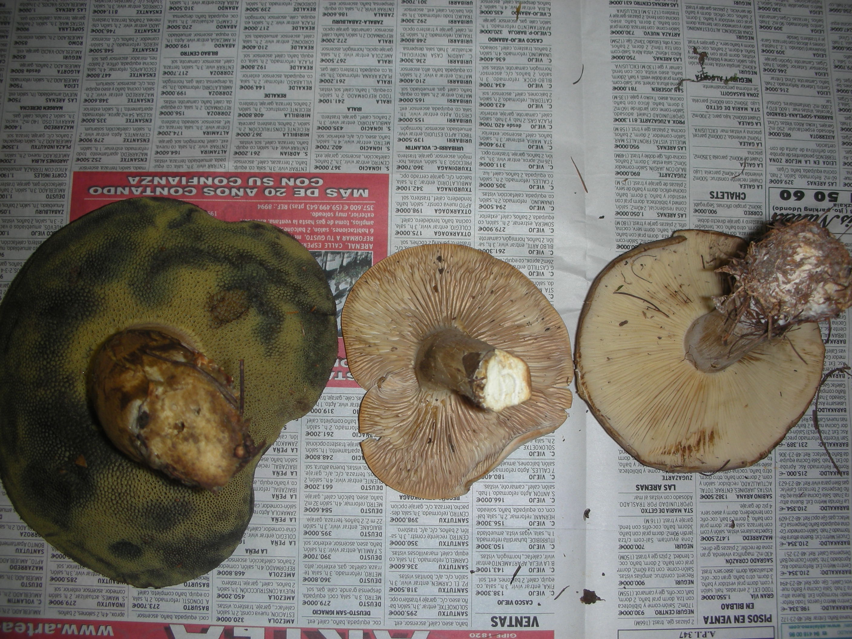Os adjunto unas fotos con tres ejemplares que no tengo muy claro que pueden ser. Empezando de izquierda a derecha, en primer lugar un hongo cogido esta tarde en una pista en la linde de un pinar de Pinus radiata. En segundo lugar un ejemplar cogido el sábado en Gorbea en el límite de un bosque de alerces y en ultimo lugar otro ejemplar cogido en el interior de este mismo bosque de alerces.