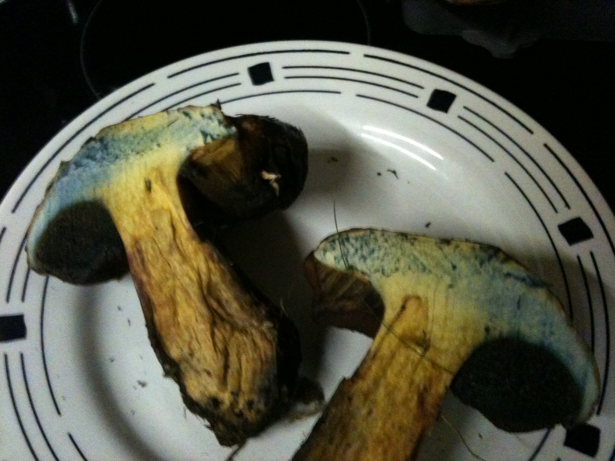 Como veis, os adjunto una foto con el corte del sombrero, me parece curioso que aqui si se ha acentuado el azule nada mas cortar cuando al cortar el pie in situ en el monte se qudo' amarillo tal cual.