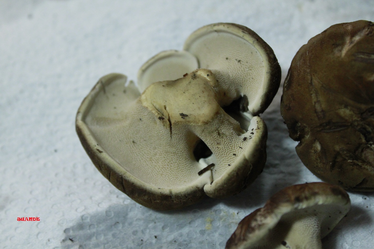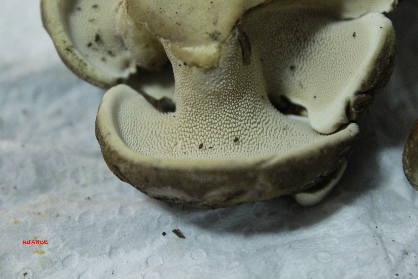 Al ampliar la foto veo que su himeneo está compuesto por aguijones y no por poros lo que lo emparenta con Hydnum, Hydnellum y Sacordon.