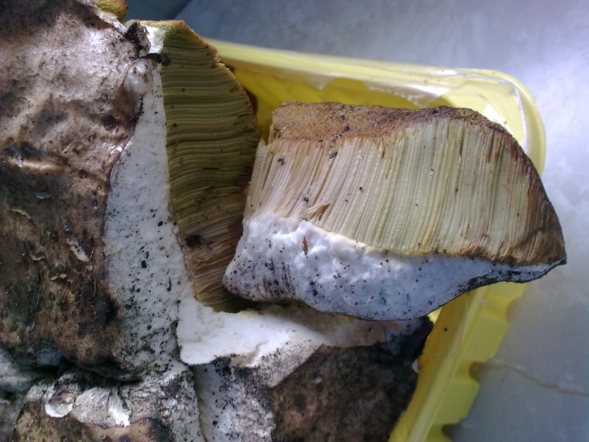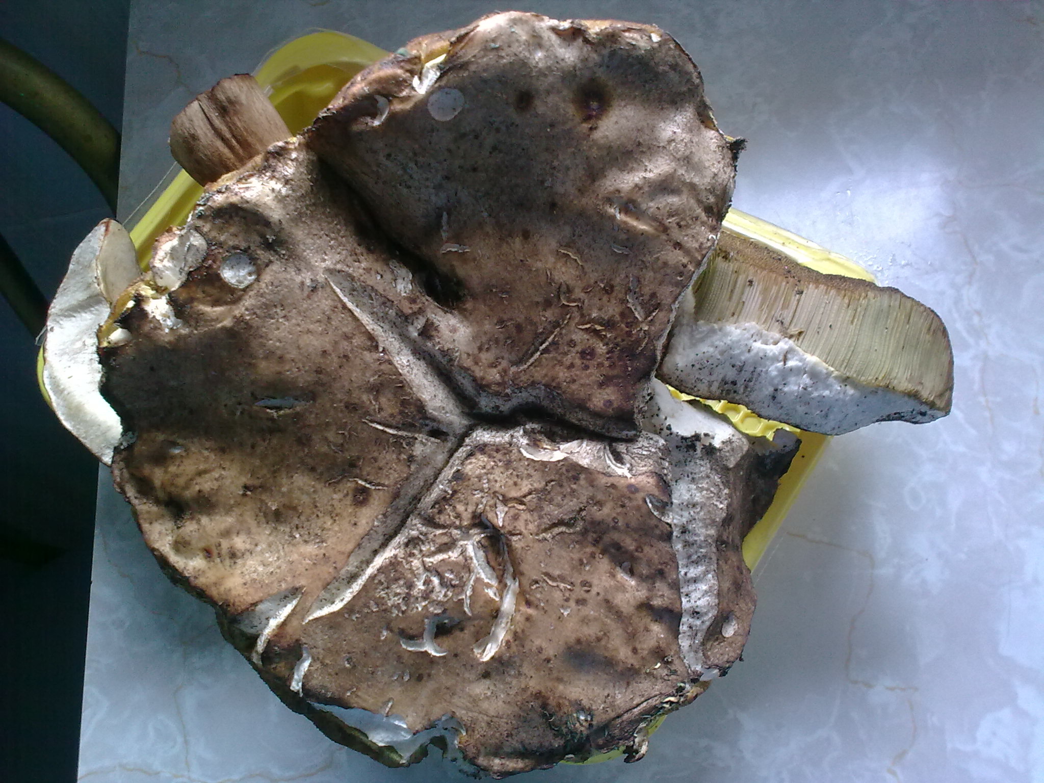 Tienes razón, en la cesta llevo otro Edulis mas pequeño bajo el sombrero del grande, una seta con el pie hacia arriba con la parte de abajo blanca y otro Boletus con el sombrero marrón chocolate y la parte de abajo amarilla, esponjosa y porosa (tiene pinta de ser el boleto Anillado).