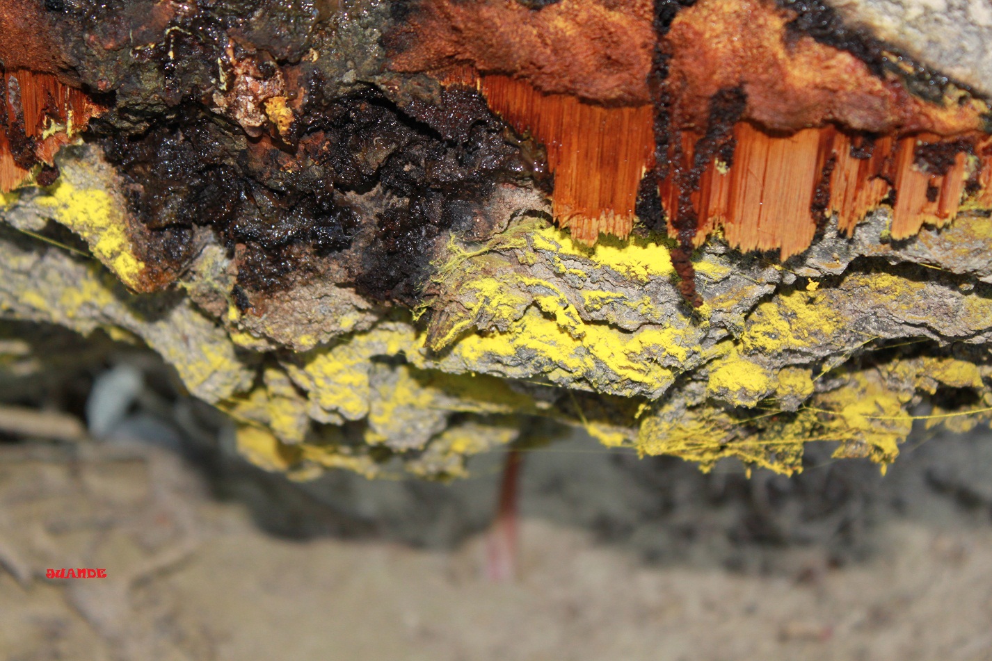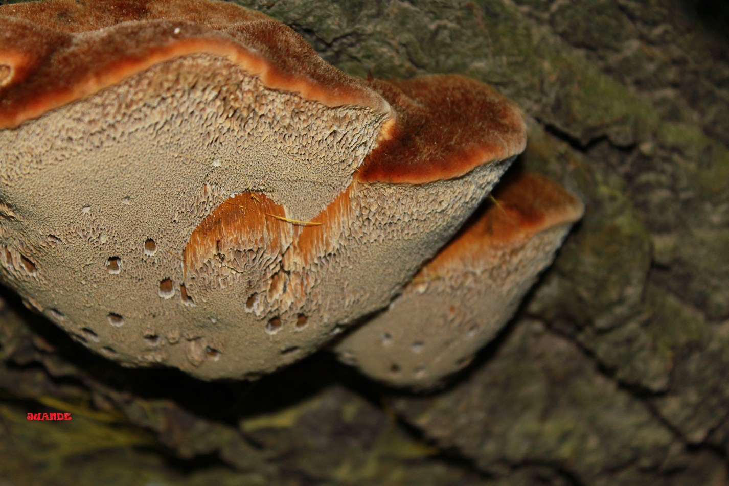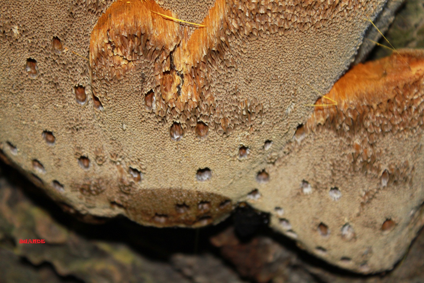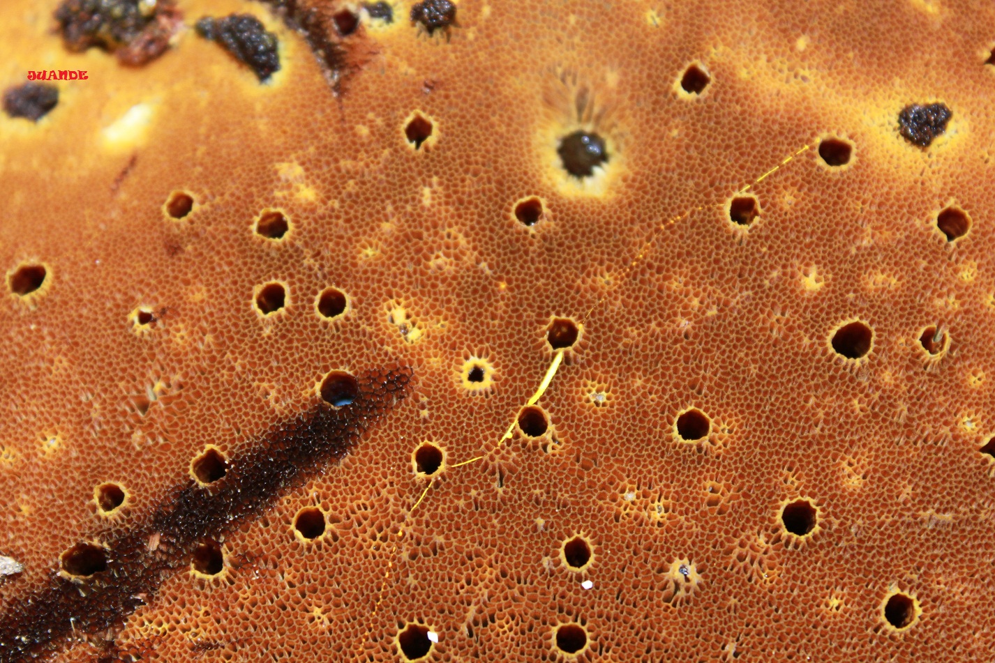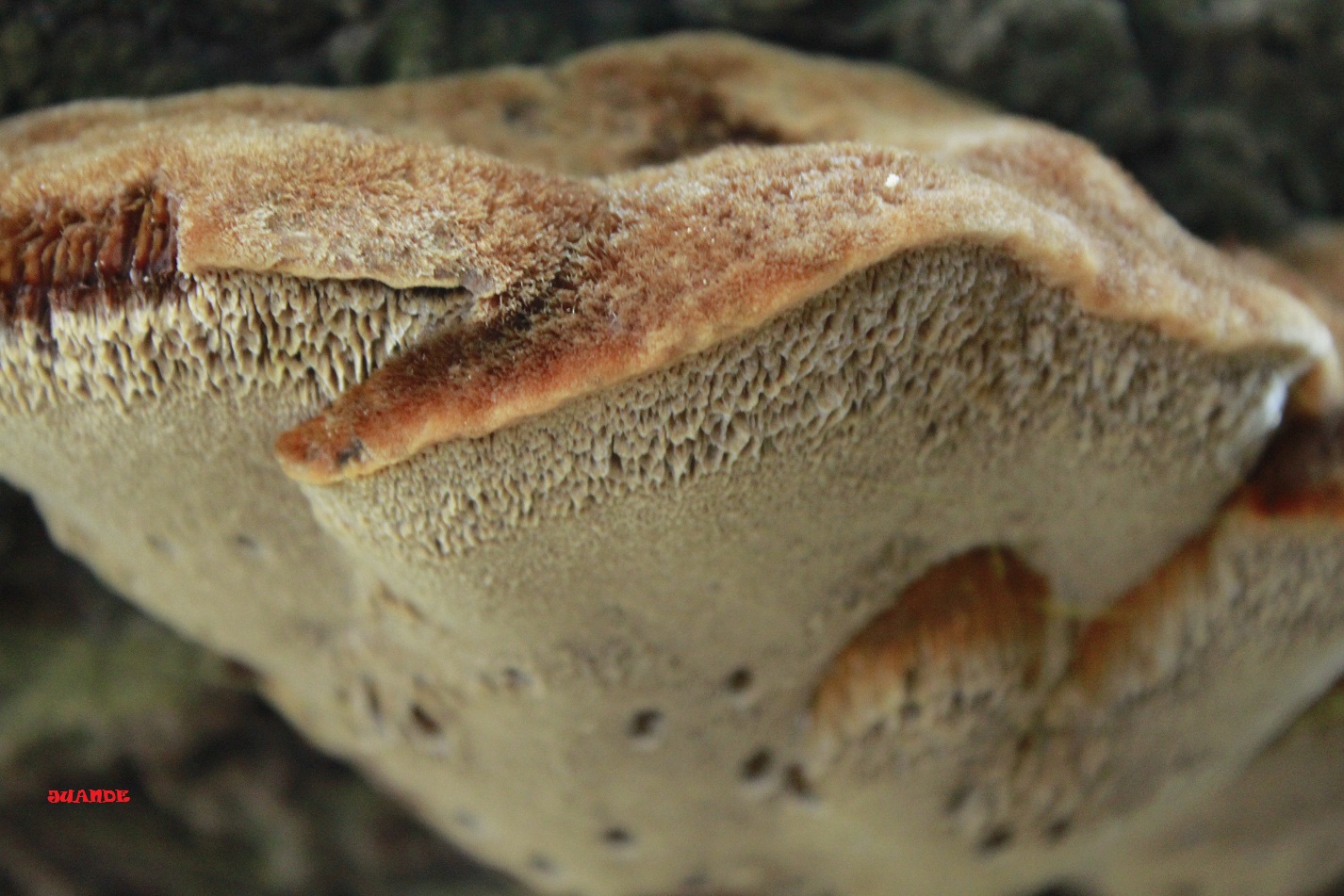 Juande, la verdad me tiene intrigado esos ahujeros en el himenio, pero podría tratarse Inonotus hispidus que suele salir en planifolios o también el Inonotus rheades en bosques quemados o Alamos.Saludos