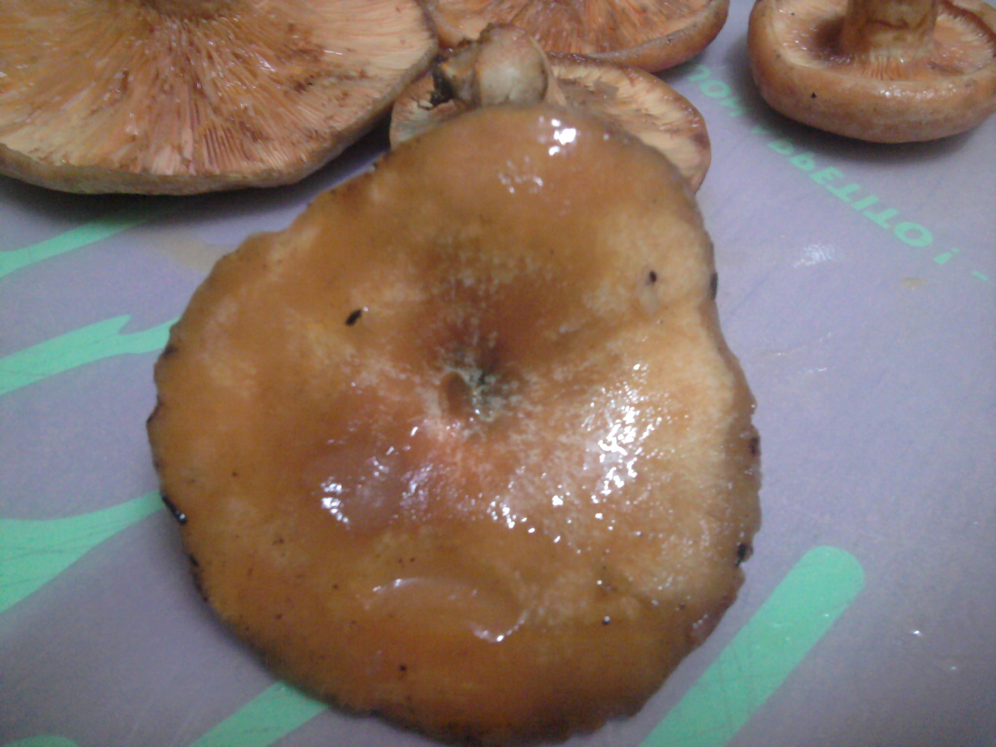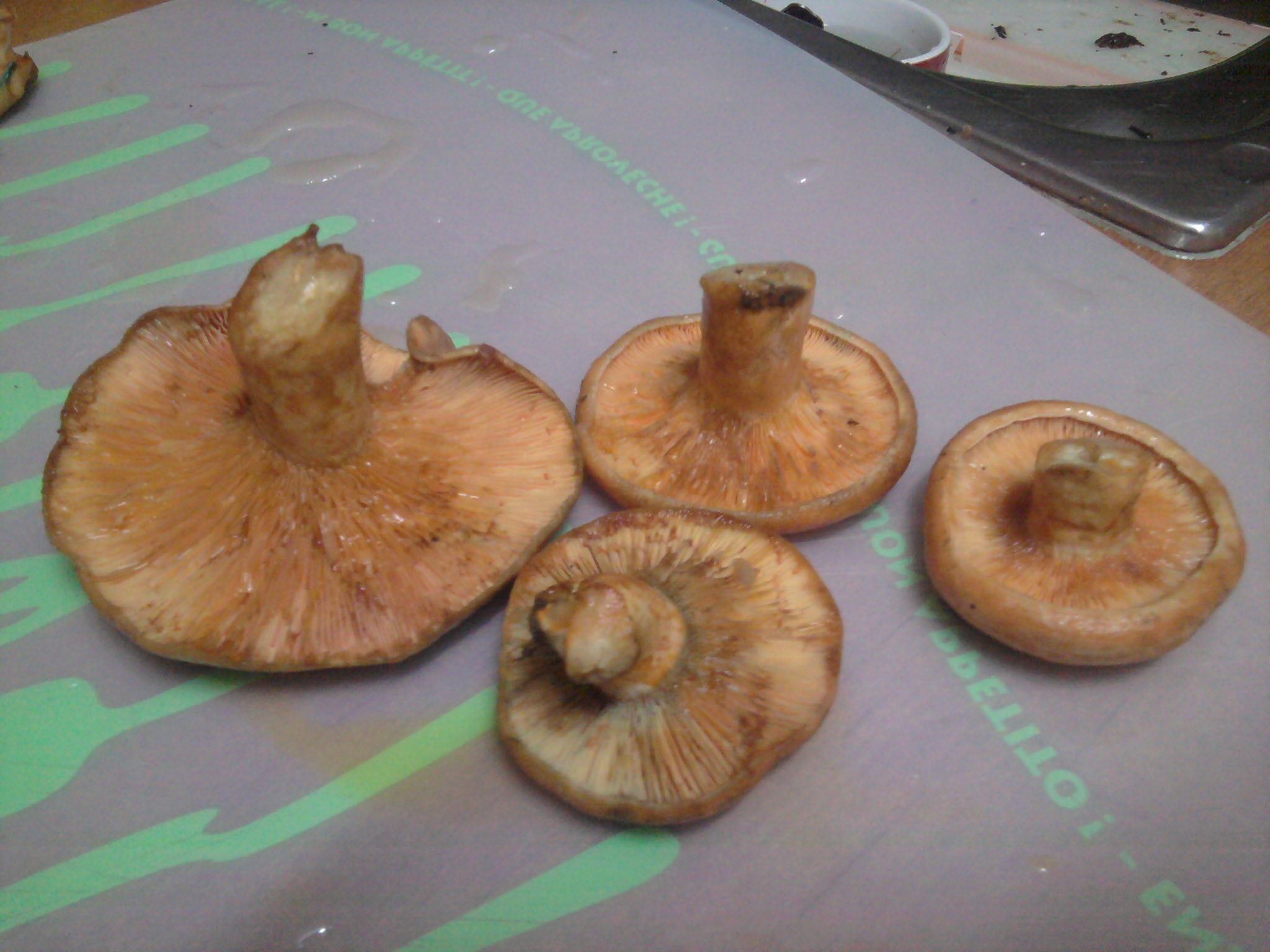 Hola chic@s, lamento contradecir vuestra opinión, pero veo máculas concéntricas en los dos ejemplares de cutícula más mate, así como látex anaranjado y láminas del mismo color, además su pie es escrobiculado, con lo cual no tengo muchas dudas de que si son Lactarius deliciosus, máxime cuando es el color habitual en que suelo cogerlos en el pueblo. Los otros dos están deslavados, probablemente afectados por esa corriente de agua, además su látex me da la impresión de que vira a color vinoso, pero no estoy seguro, la duda estriba en que pueden ser la var. de deliciosus que menciona Juan Carlos o unos semisangifluus. un saludo.