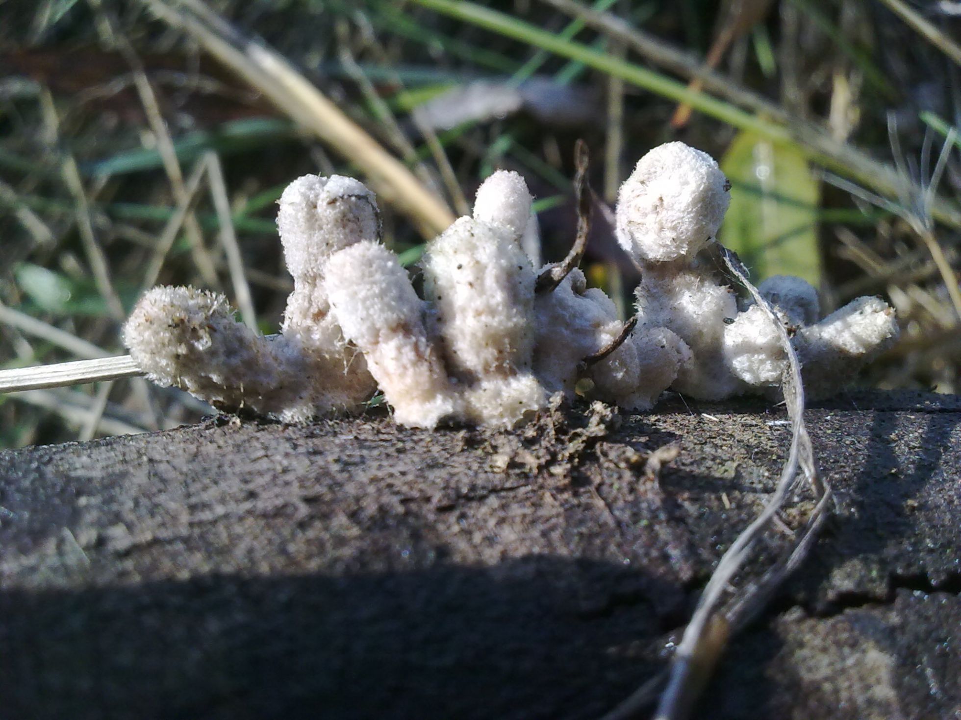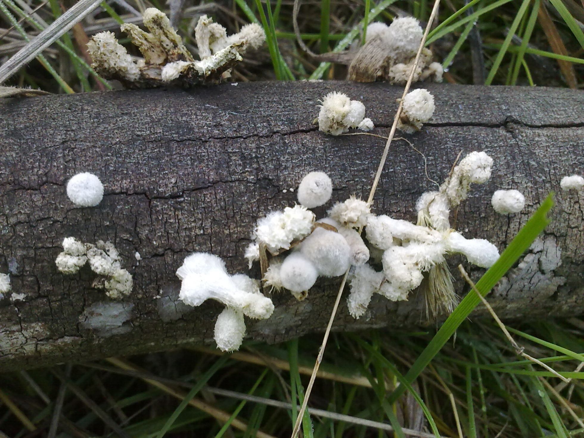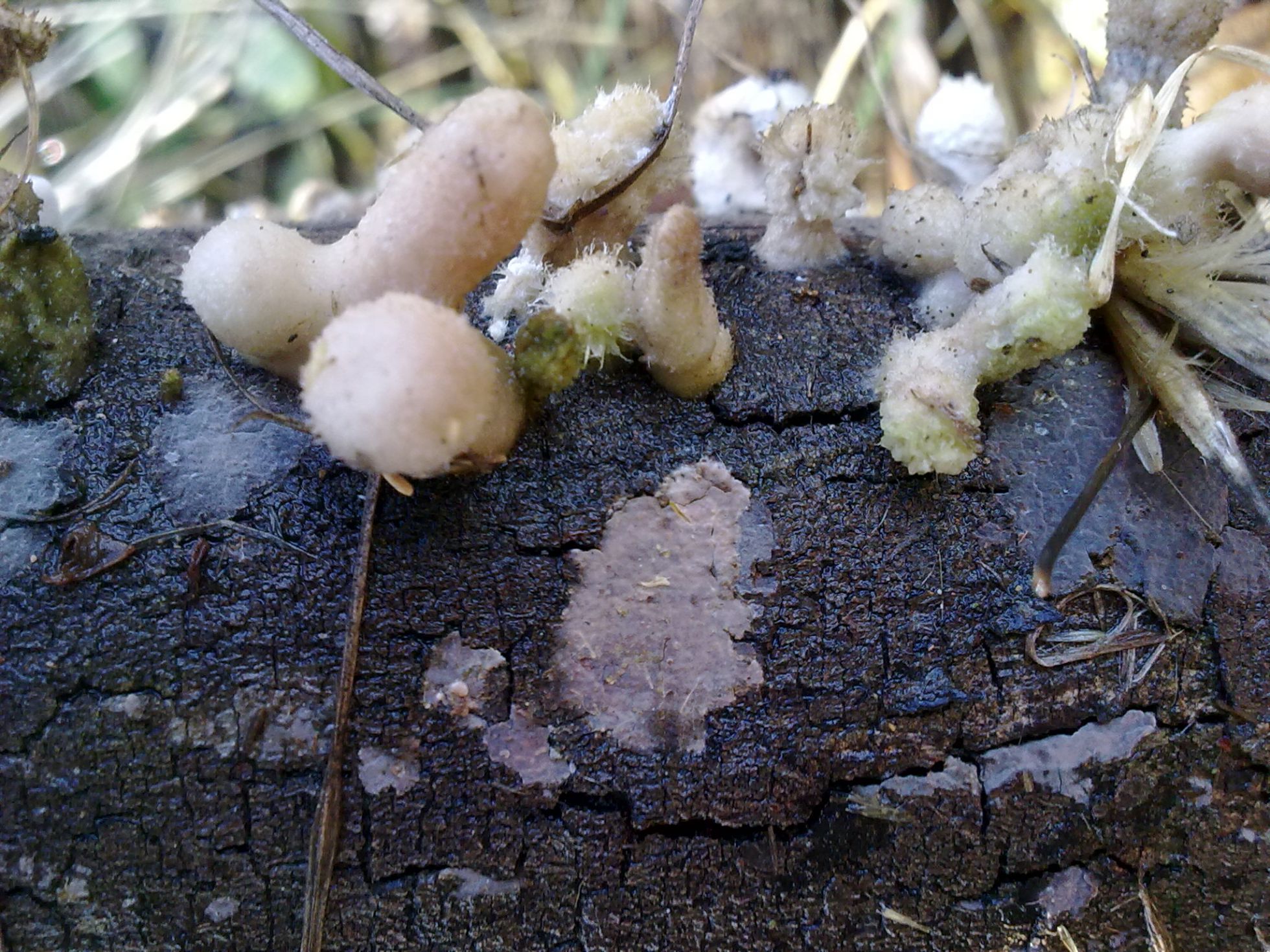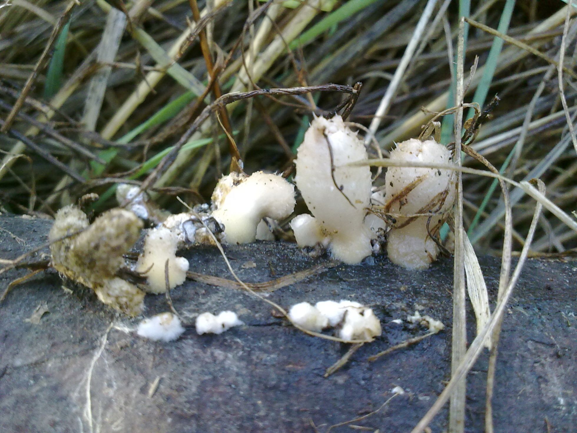 Pues ya veis...otra especie "tela" de rara. Crecían sobre una rama caída pero no se de que árbol se trata (si fuese necesario lo puedo averiguar) carpóforo de unos 3cm de alto por uno o dos de ancho, de color blanco puede que en algunos ligeramente rosácea, de superficie algodonoso, carne dura y algo elástica.