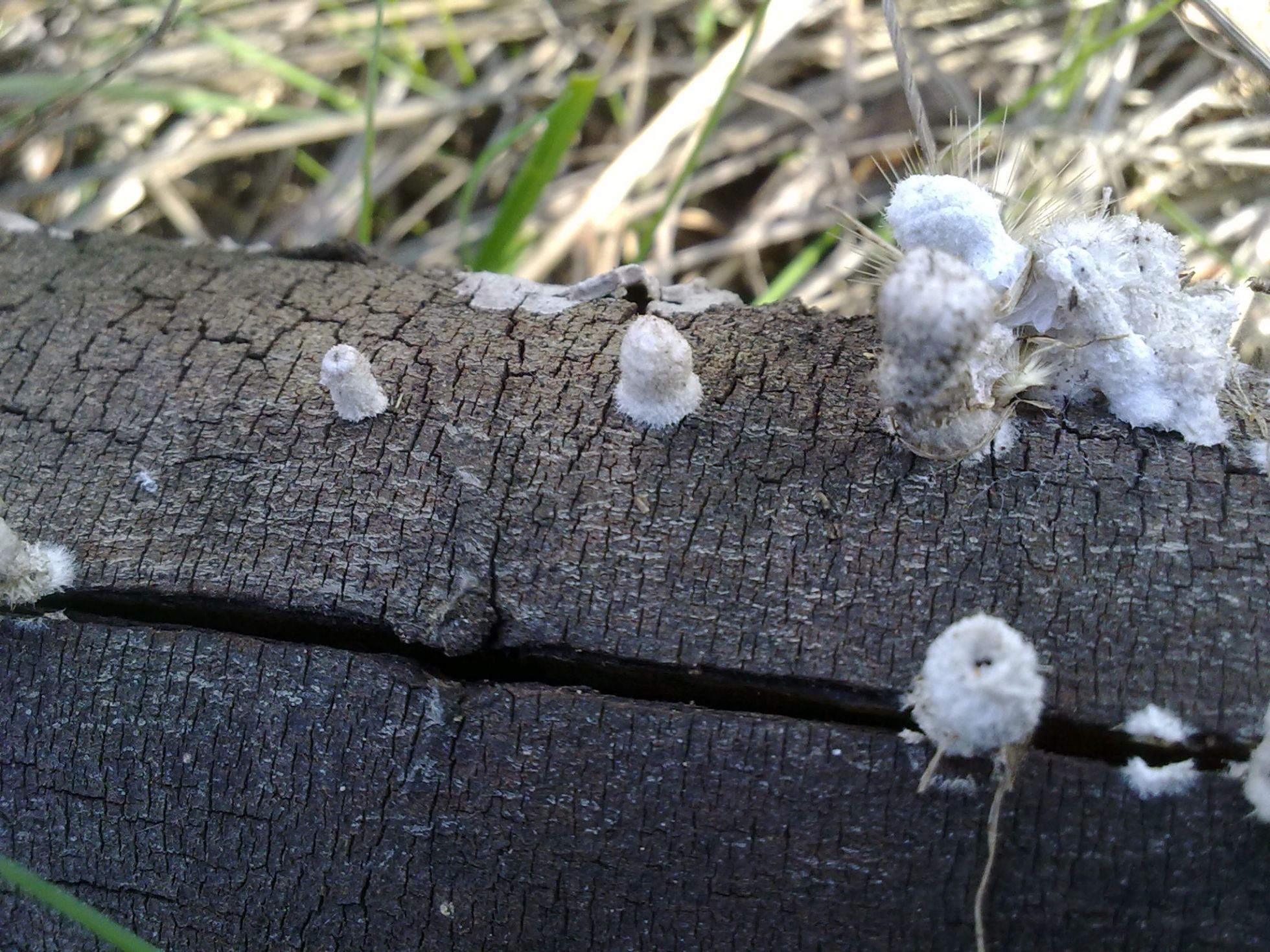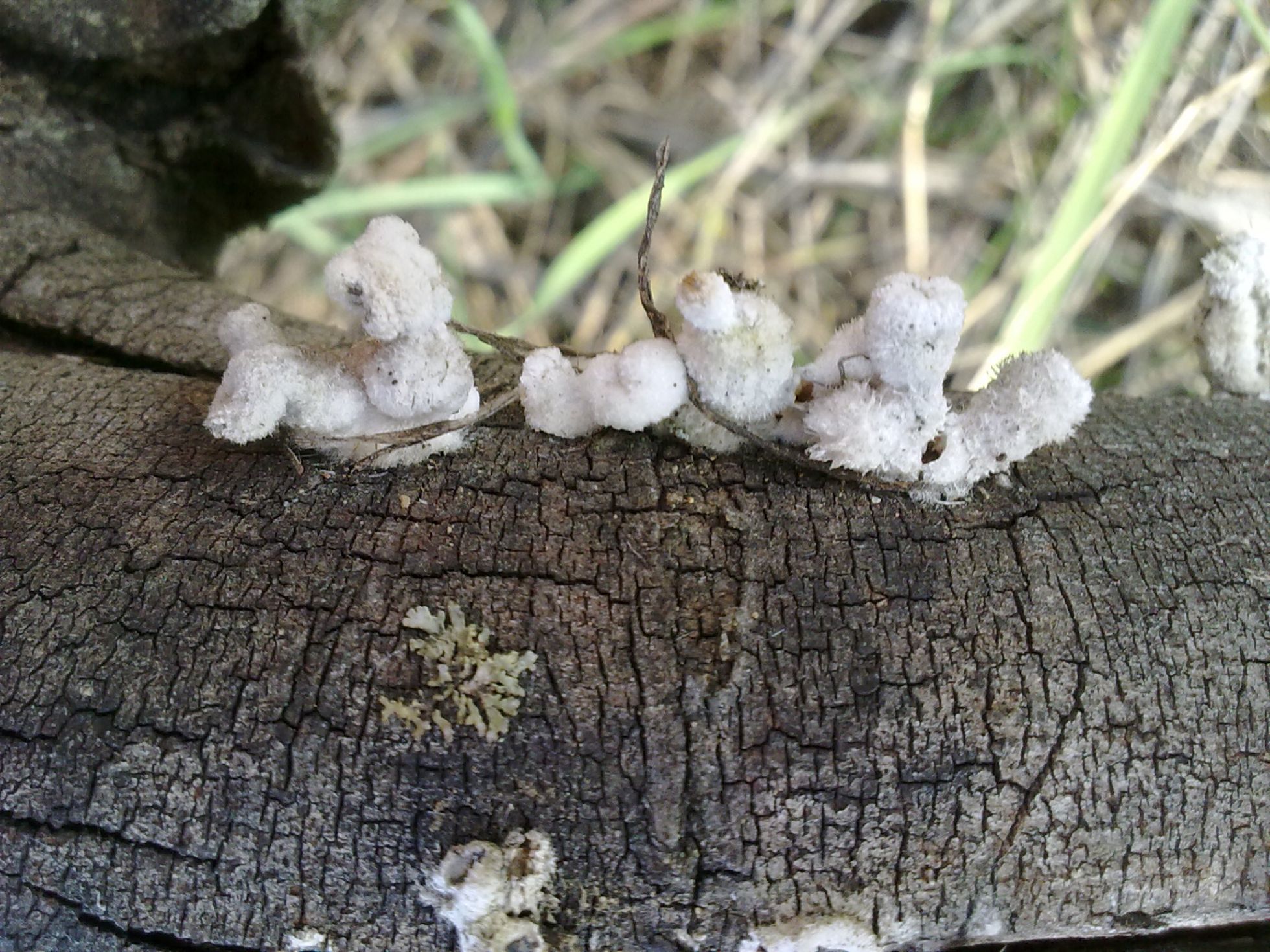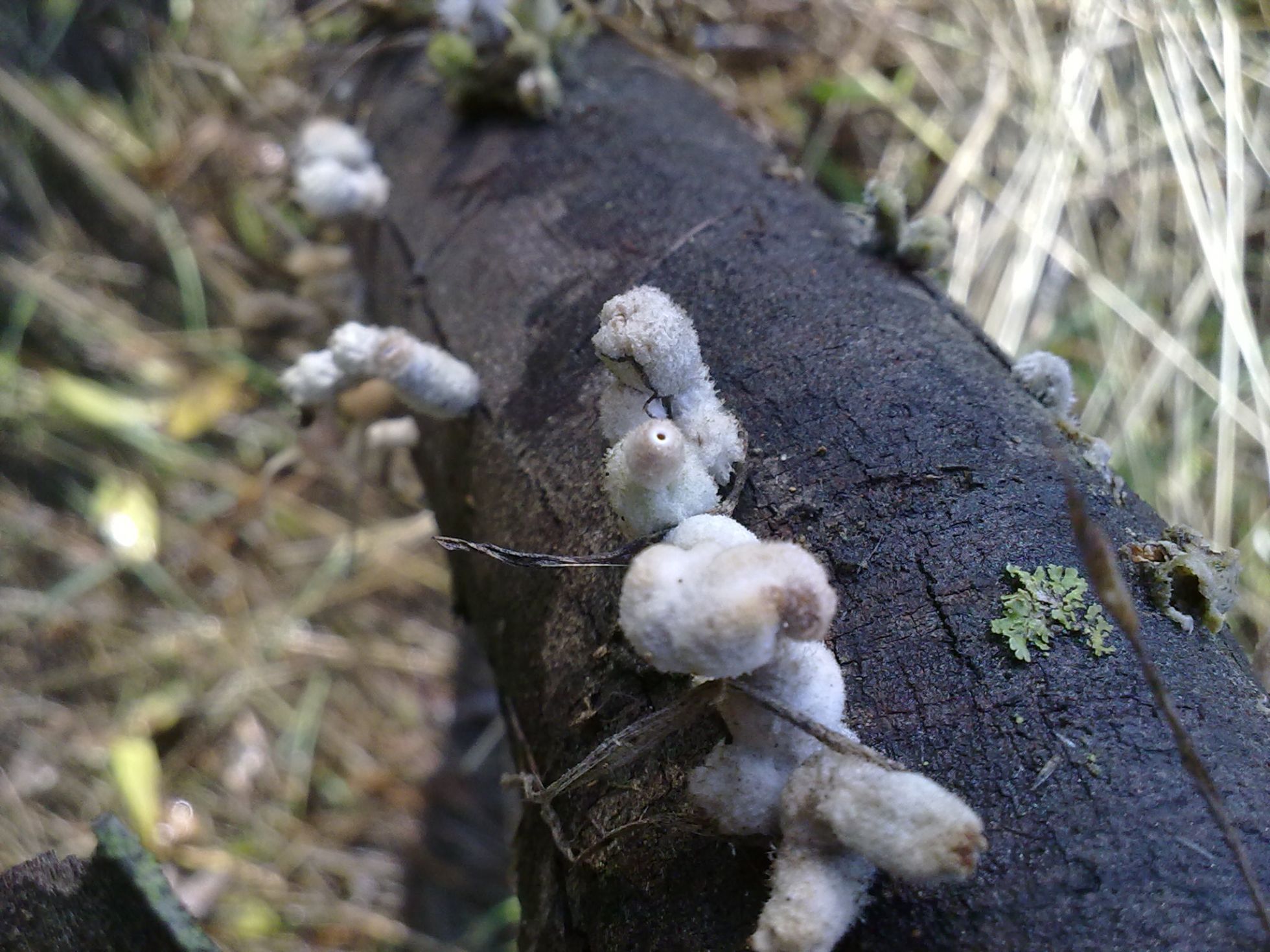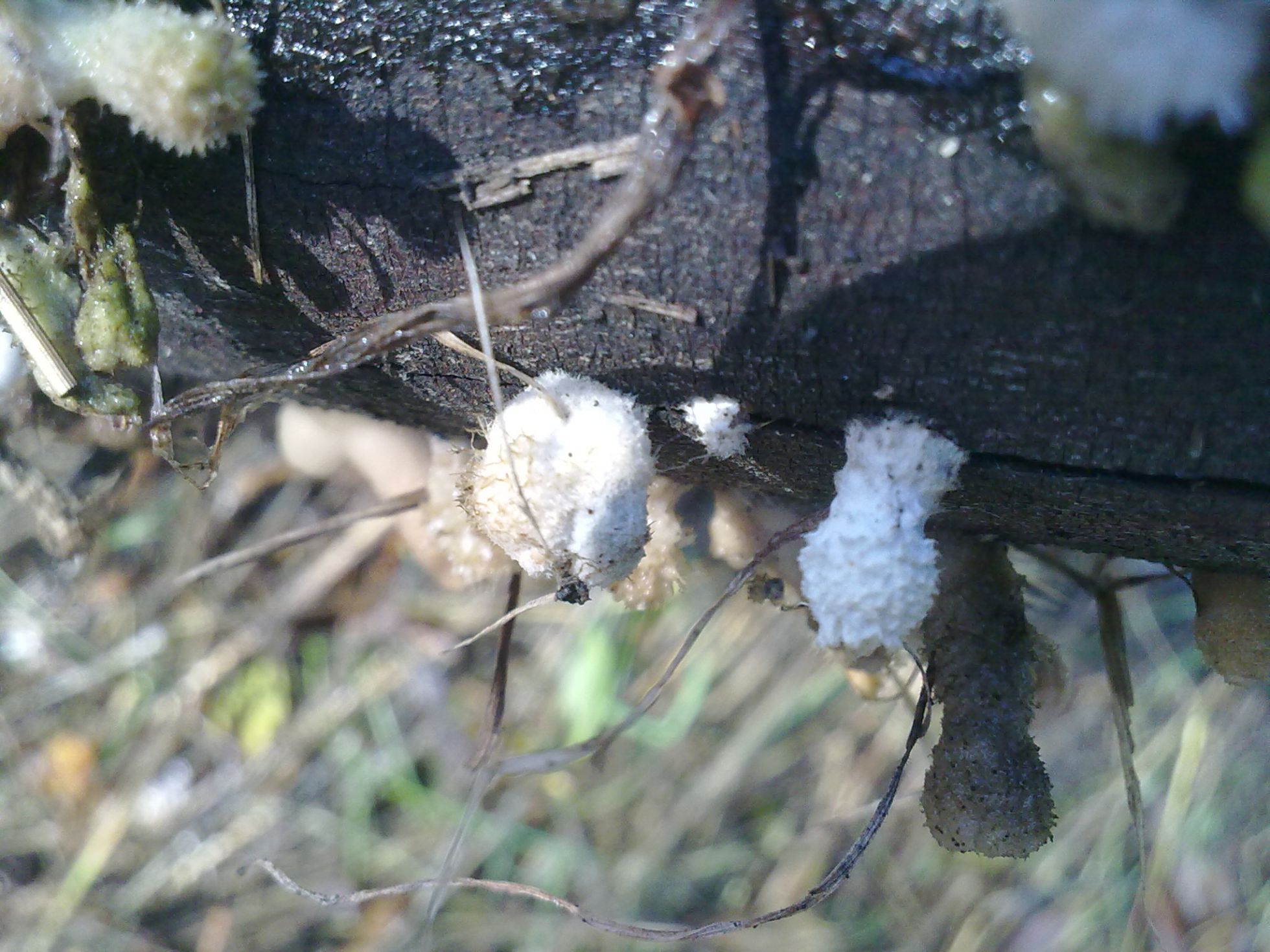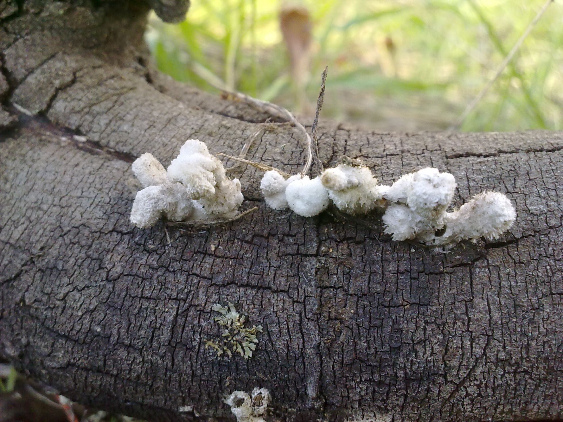 Pues ya veis...otra especie "tela" de rara. Crecían sobre una rama caída pero no se de que árbol se trata (si fuese necesario lo puedo averiguar) carpóforo de unos 3cm de alto por uno o dos de ancho, de color blanco puede que en algunos ligeramente rosácea, de superficie algodonoso, carne dura y algo elástica.