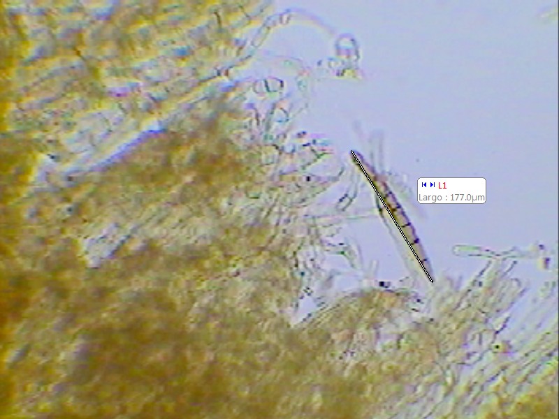 Como estoy empezando con la microscopia, observo las esporas y sus medias se ajustan más al T. hirsutum que a otra similar de la cual esté documentado. Apunté las siguientes características de esta seta.