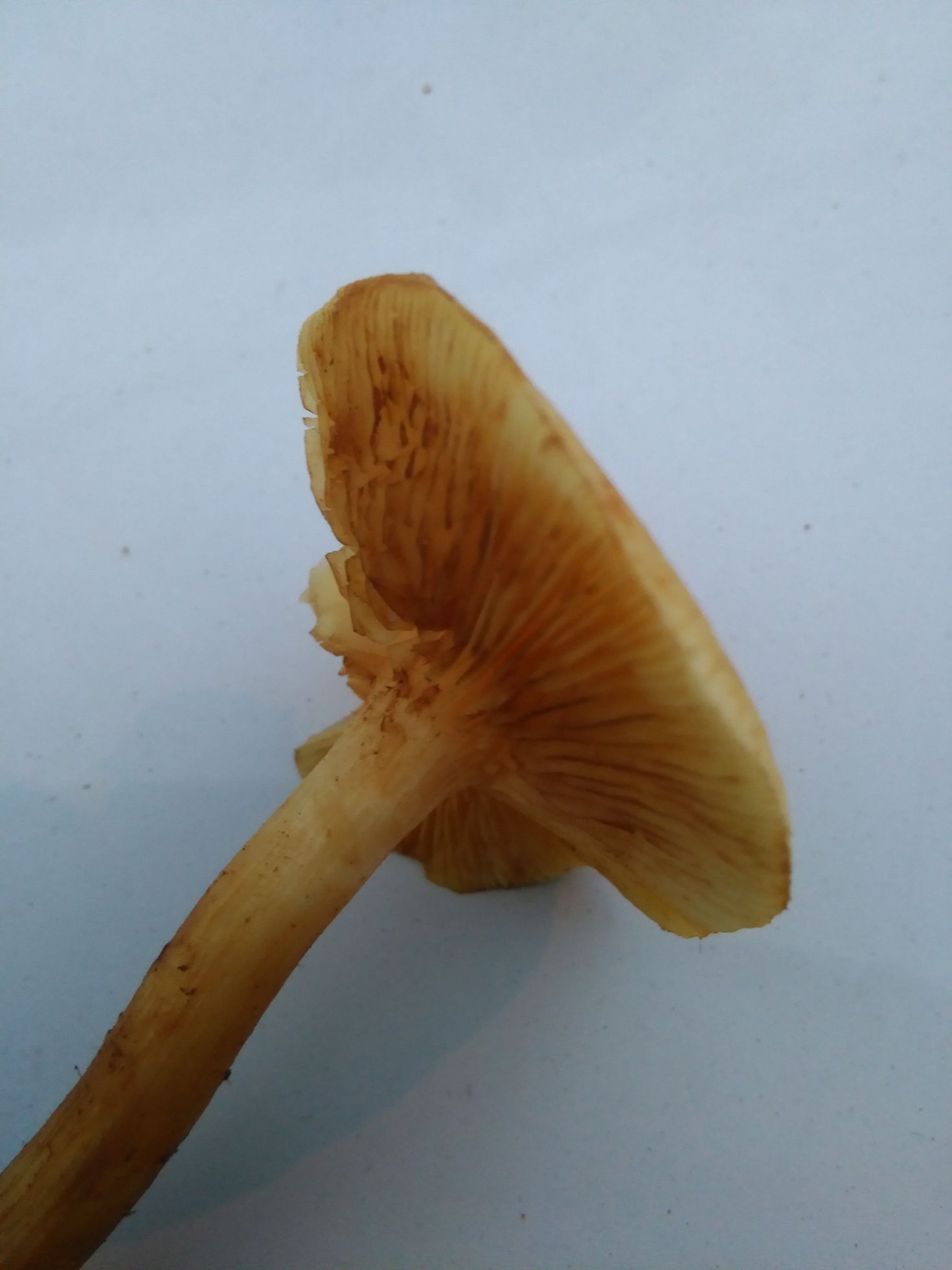 Os dejo para determinar esta especie recogida en los margenes de un bosque de robles el 10 de Diciembre. El tamaño era pequeño, el sombrero no debia llegar a los 4 cm de diametro. Las laminas parecen decurrentes y algo manchadas de un color parduzco. El olor y el sabor no eran desagradables, sino que recordaban al sabor rafanoide del rábano.
