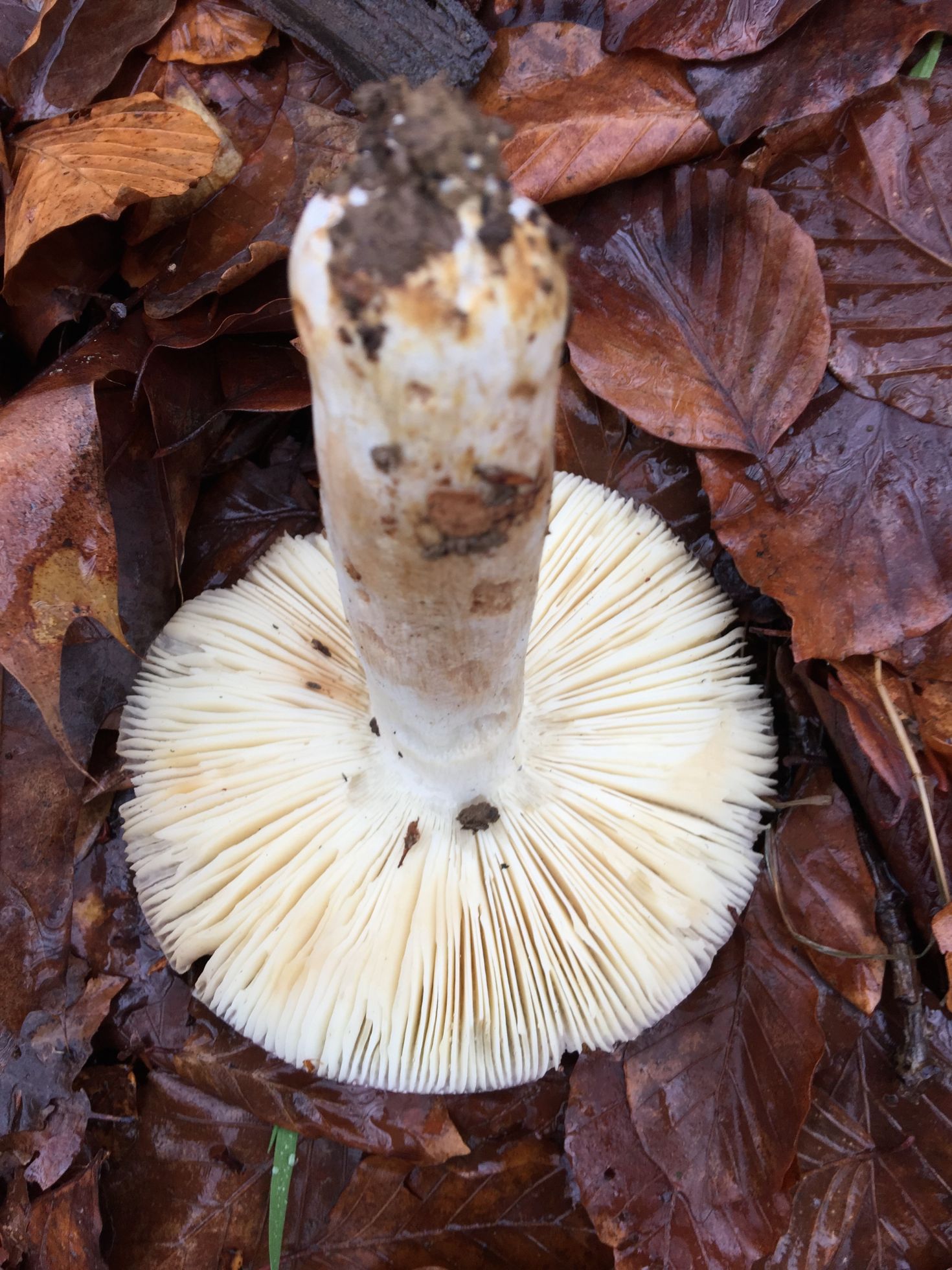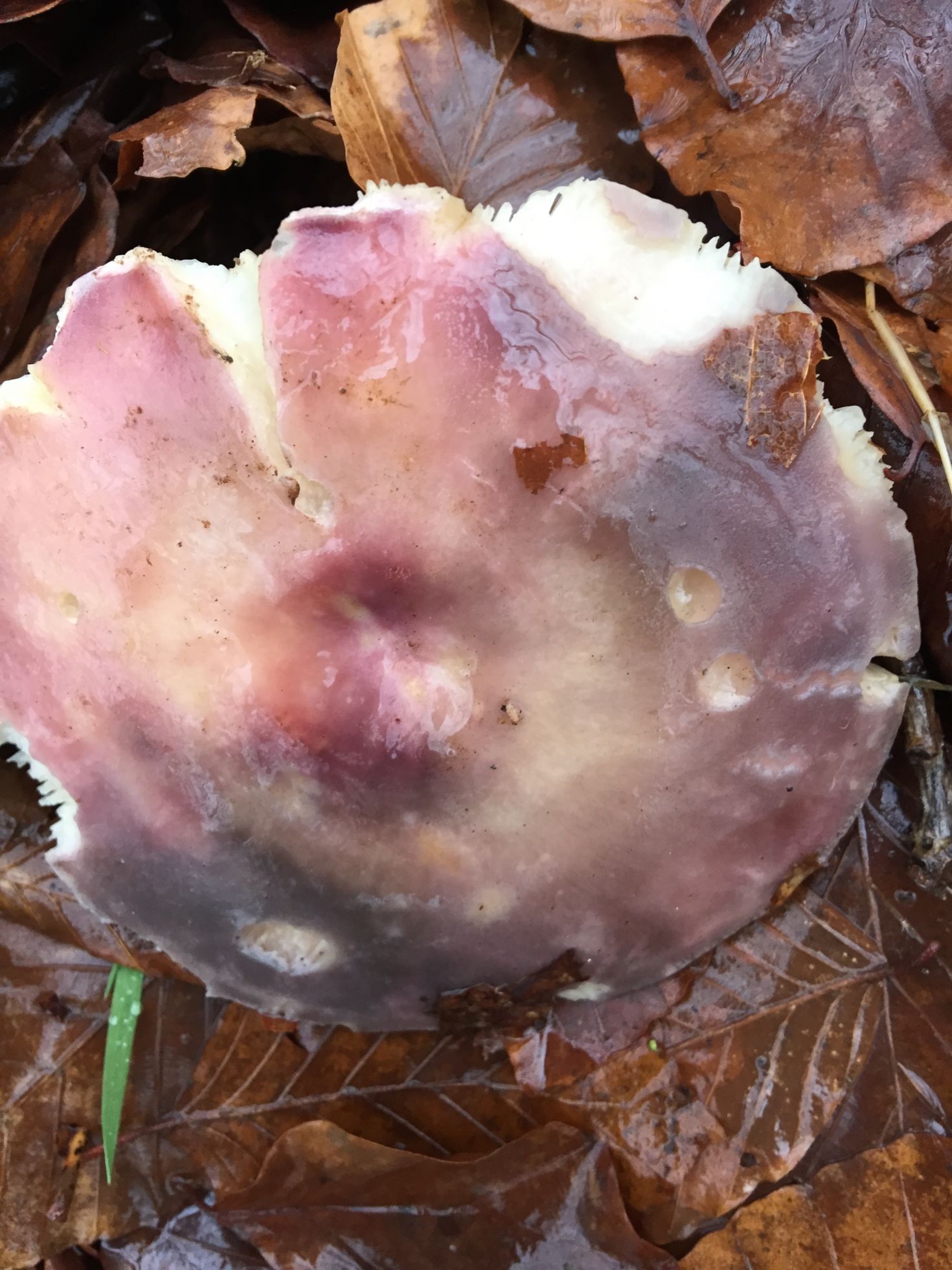separa la cuticula y aparecera un tono vinoso .Tienes que poner mas datos , con ese color ha y unas cuantas russulas , si es verdad que de estas algunas se podrian descartar por el color del pie , sobretodo por tonalidades.Saludos .