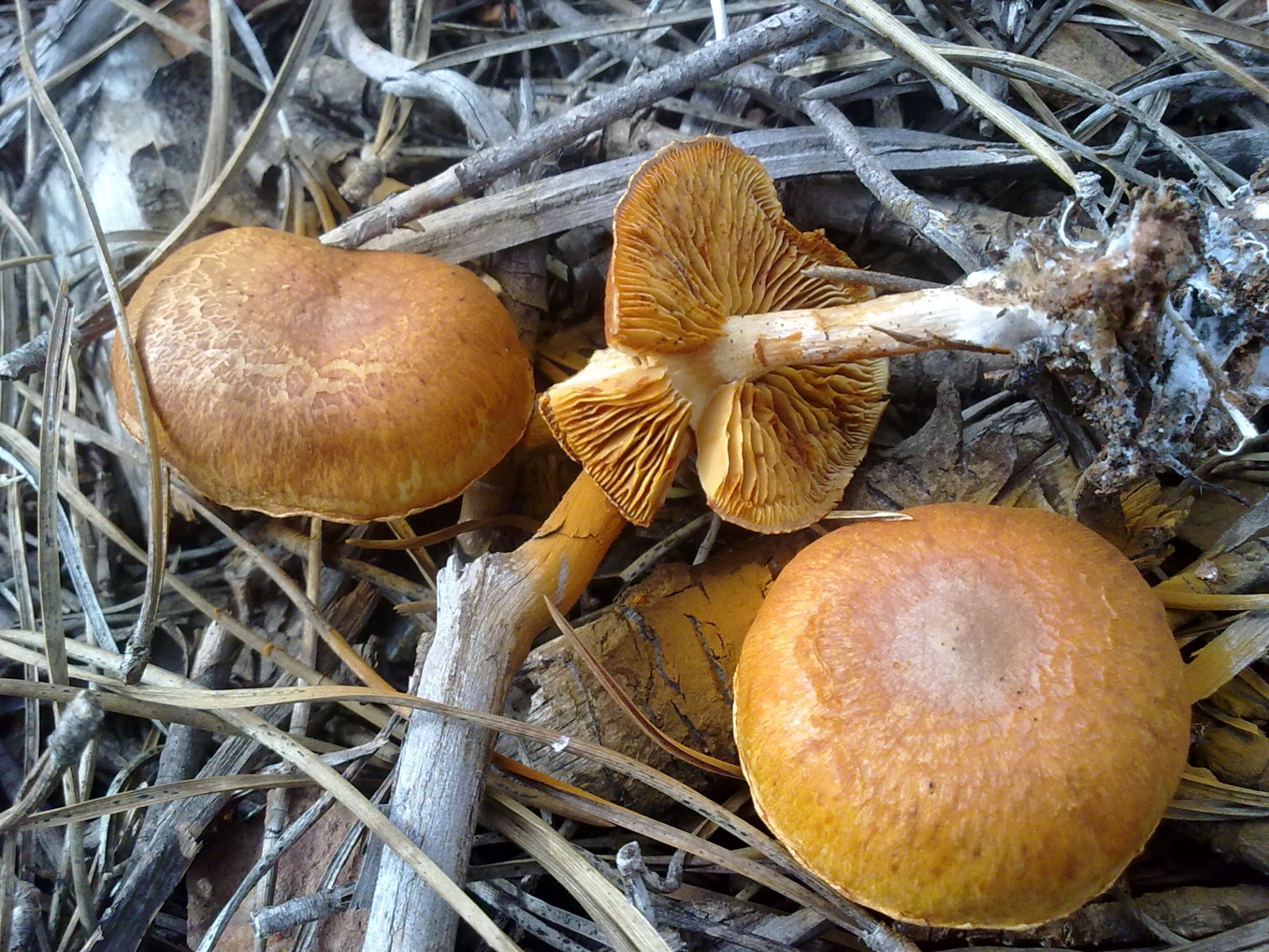 Hola Joaquin, te dare mi opinión con respecto a la primera de las especies de tus setas. Esta claro que tus setas estaban sobre restos leñosos y seguramente de pinos, por ésto mi teoría es que simplemente se tratan de Gymnopilus penetrans especie muy frecuente.En la parte superior izquierda de tu tercera foto se ve la base del pié blanquecino así como con grandes restos de rizomas, suelen salir en peqeños grupos.