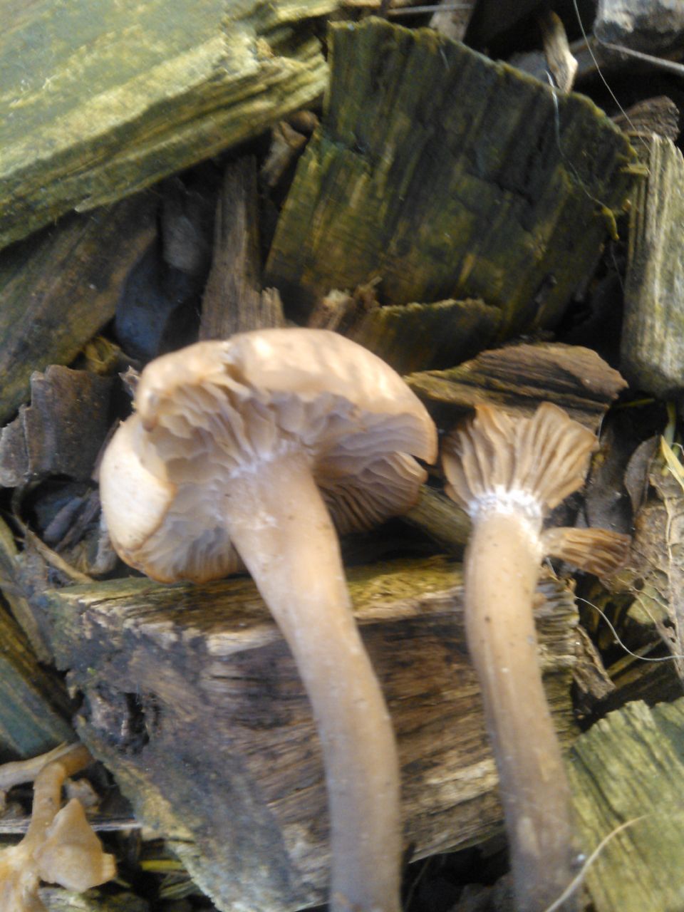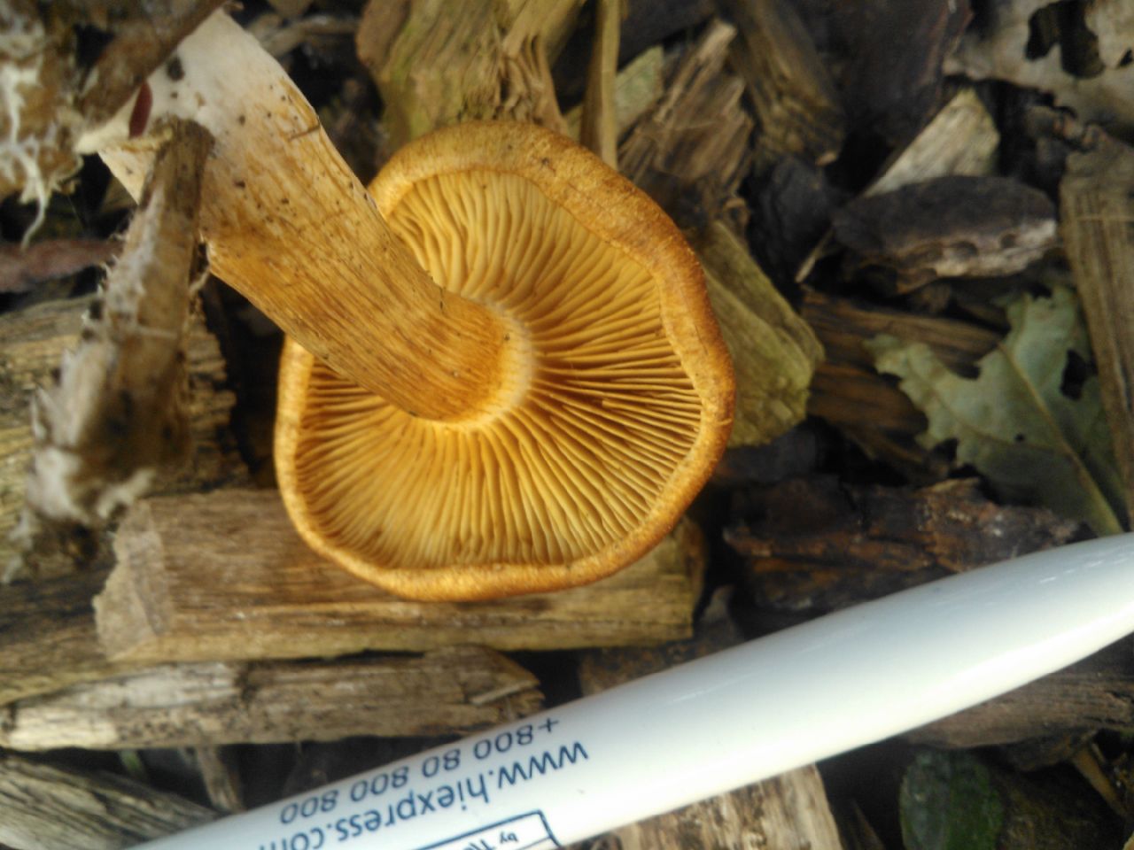 Hola chic@s, la otra especie es una Laccaria sp, en la última foto se puede apreciar los restos de esporada blanca en la inserción laminar al pie.