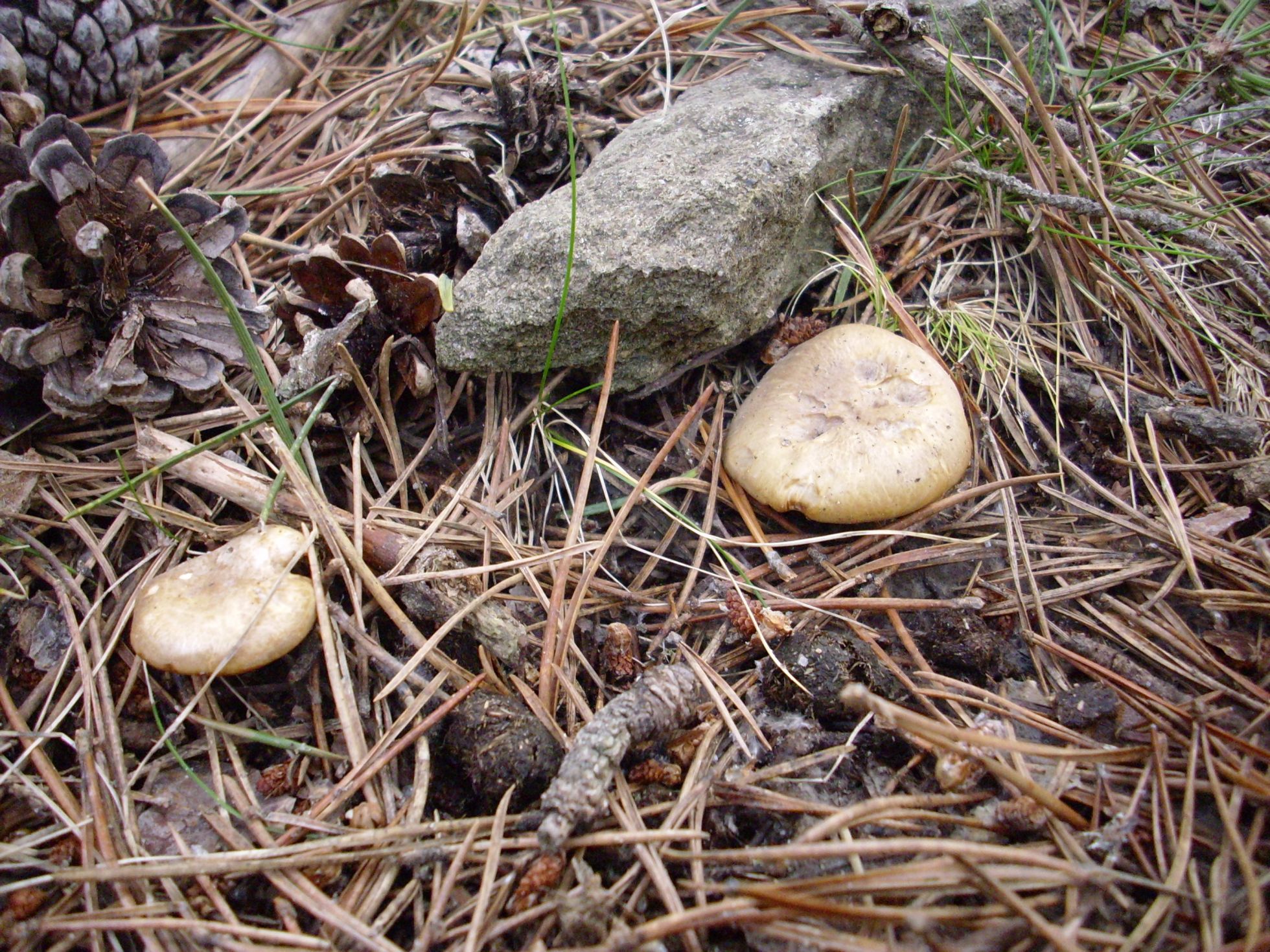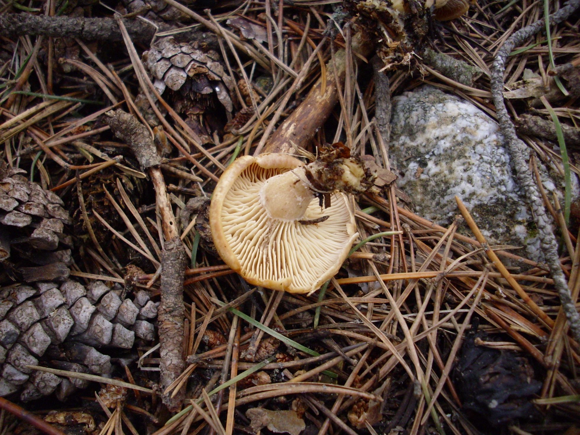 Gracias, Javi, respeto mucho tu valiosa opinión, las láminas eran de color crema claro (la foto engaña un poco) y por la forma del sombrero yo habia descartado Clitocybe y al ver el micelio entrelazado con restos de madera de pino por eso pensé en Gymnopilus.