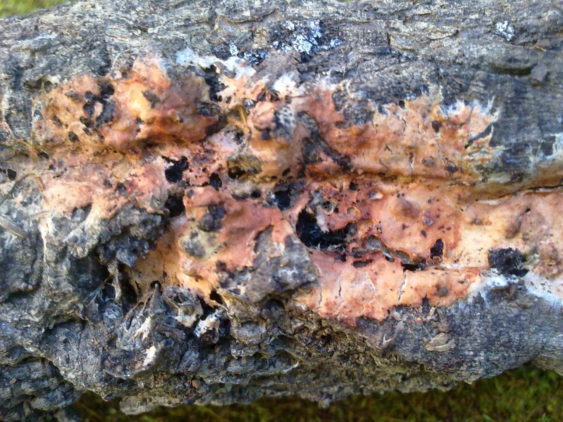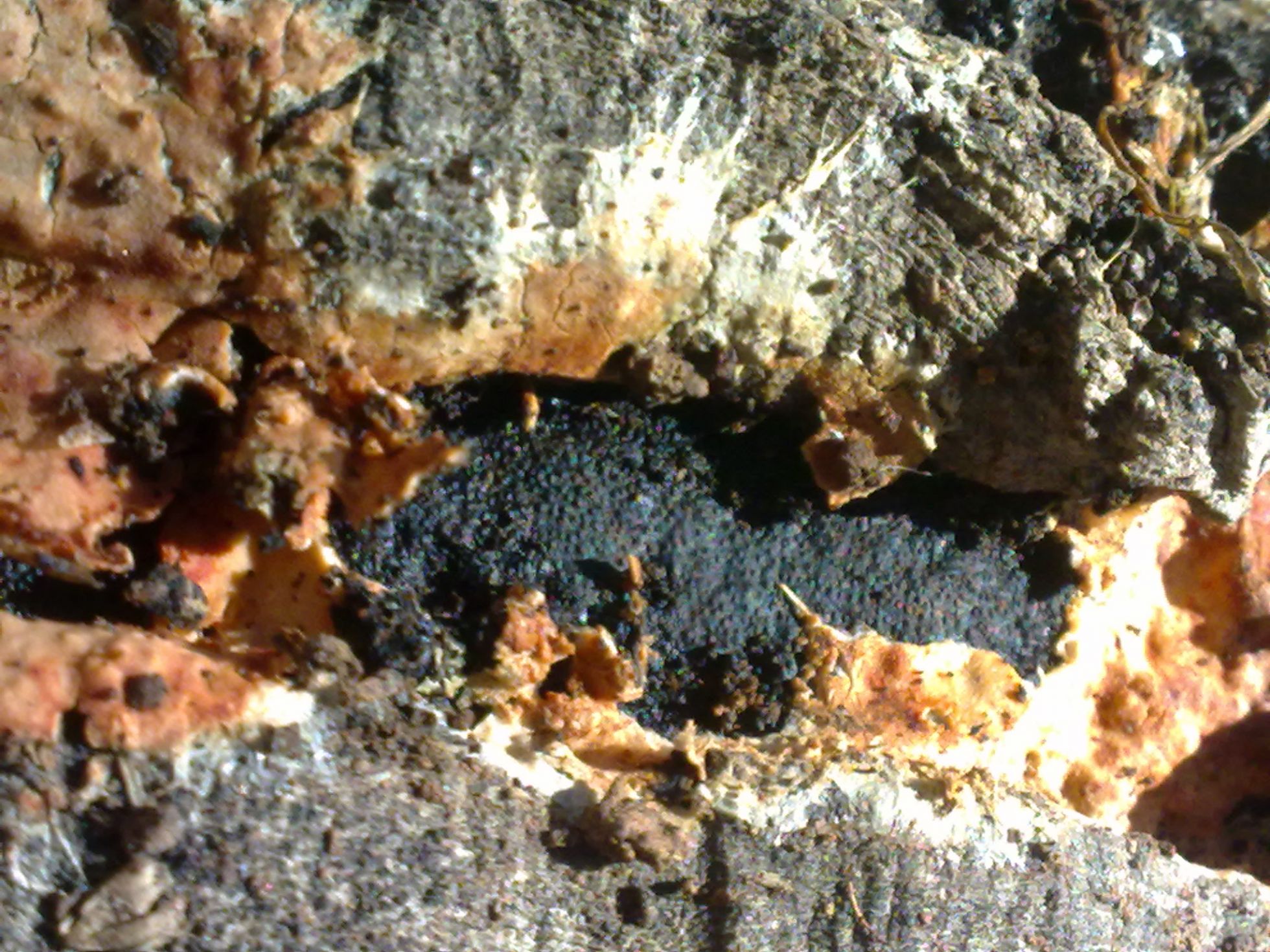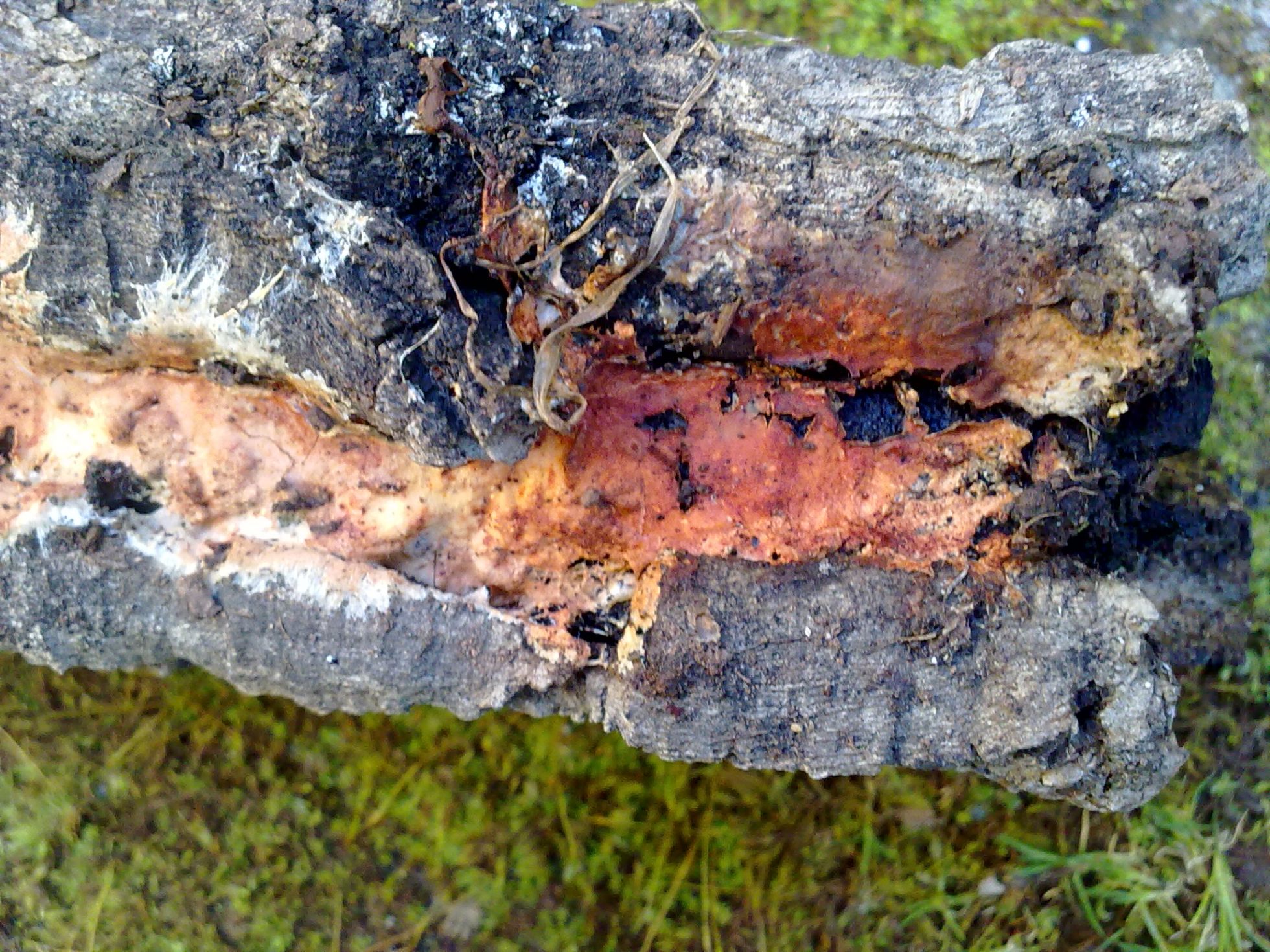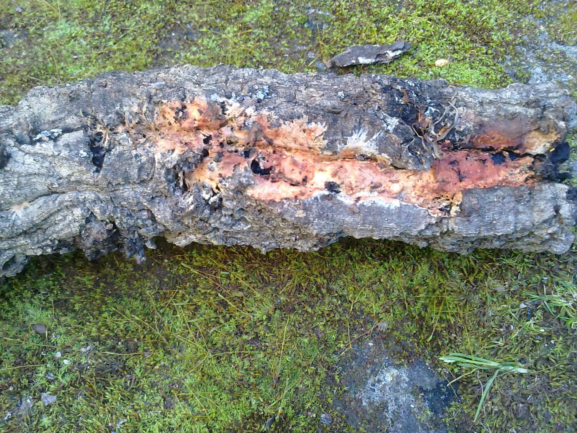 ....y la sorpresa es que esa fina costra rojiza de consistencia fina y blanda y algo flexible estaba como parasitando o puede que conviviendo con nada mas y nada menos que con una Biscogniauxia mediterranea. no os parece raro y curioso?