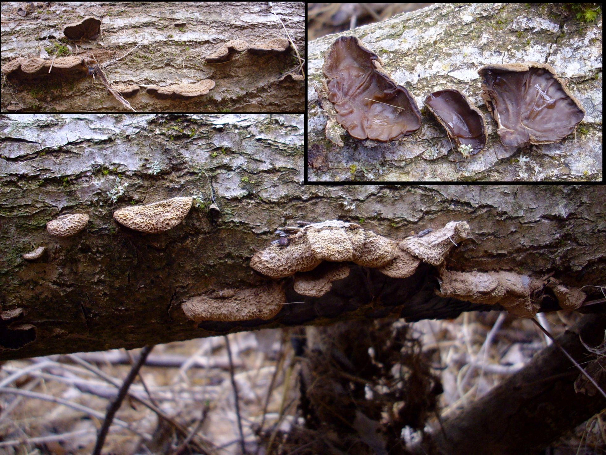 Esta especie la encontré en un árbol de gran porte, el tronco 60/80 cm. los ejemplares median de 2 a 3 cm. por la parte superior en forma de ostra y por la parte del himenio era zonada y con tonos más pardos o marron claro, no se aprecian poros ni con la lupa. Creo que por la forma podría tratarse de Stereum Ostrea.