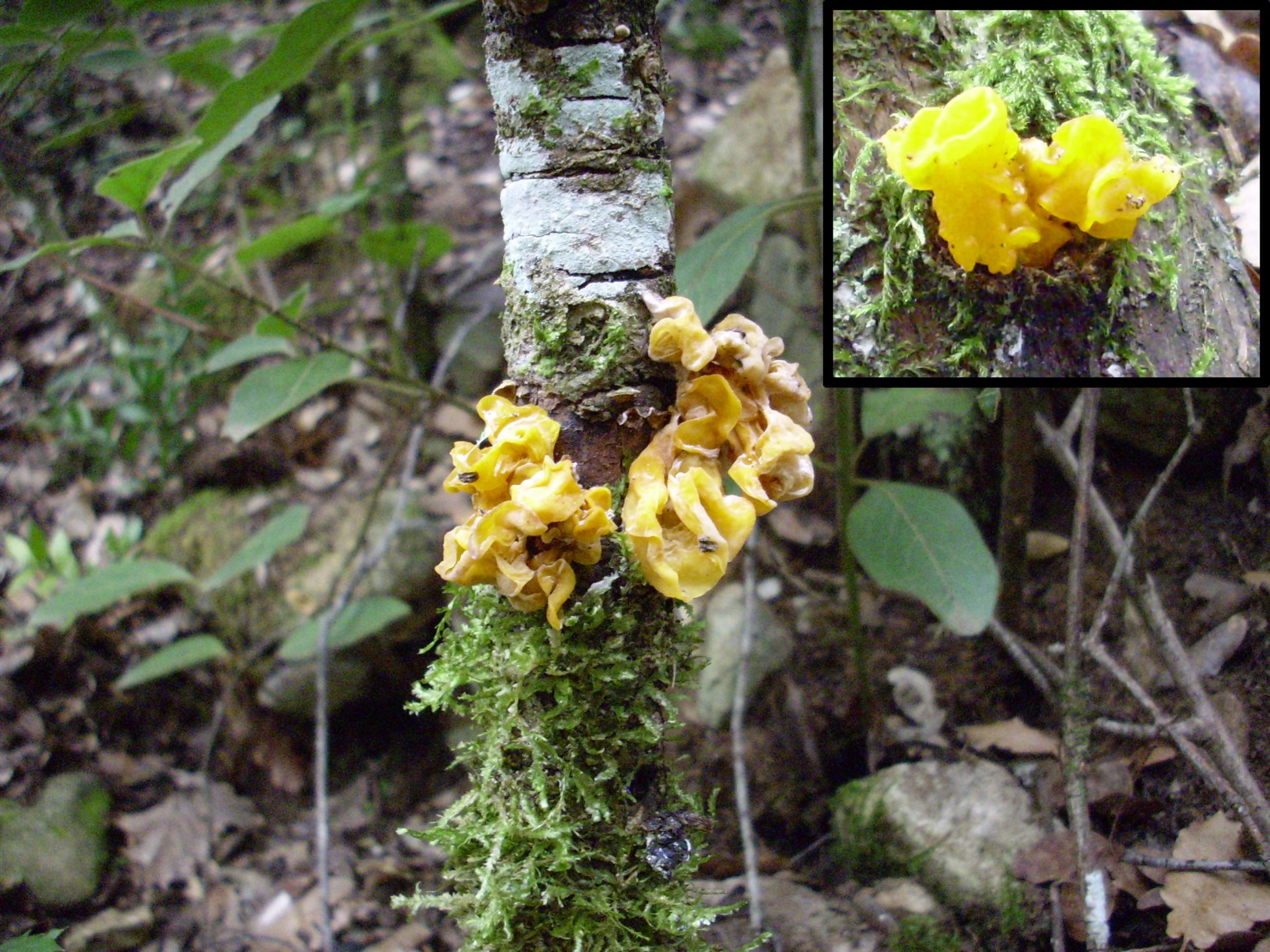 Este esta en el tronco de un arbusto y a pesar de su aspecto gelatinoso, cuesta de masticarlo es cartilaginoso. Sabor y olor inapreciables. Creo que se trata de Tremella Mesenterica.