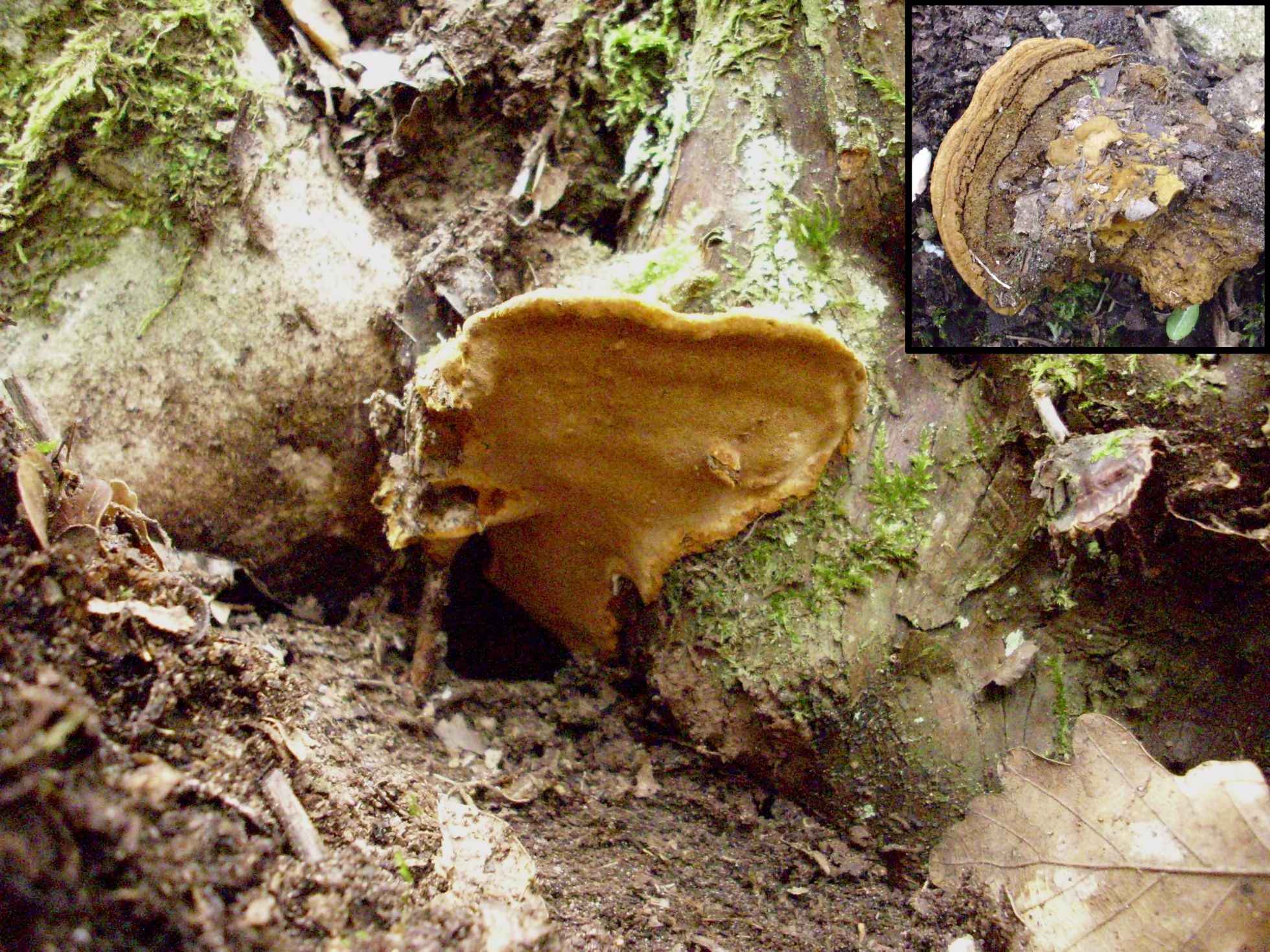 Este estaba justo debajo del anterior a unos 20 cm., medía unos 14 cm. y era como el corcho, creo que estaba en bastante mal estado, por el himenio presentaba poros pero eran muy finos, no se apreciaban a simple vista, al partirlo si se apreciaba la zona de los tubos.